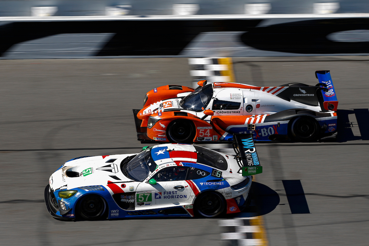 L’un des moments forts de cette édition des 24h de Daytona fut certainement le duel final opposant Mathieu Jaminet (Porsche n° Pfaff Motorsport) et Laurens Vanthoor, coéquipier de Patrick Pilet et Alexandre Imperatori sur la Porsche de KCMG. Et, après plusieurs touchettes et changement de leader, les deux Porsches se retrouvaient de front au freinage de la chicane en toute fin de course avant de terminer leur course dans l’herbe. Et, si le pilote français parvenait à maitriser son auto et ainsi franchir la ligne d’arrivée en tête du GTD Pro, Laurens Vanthoor réalisait une petite figure lui faisant perdre la deuxième place au prog=fit de la Ferrari de Pier Guidi. Au final, l’équipage de la Porsche n°2 montait sur la troisième marche du podium de la catégorie, résultat qui satisfait malgré tout les pilotes fiers d’avoir réalisé un sans-faute jusque-là :