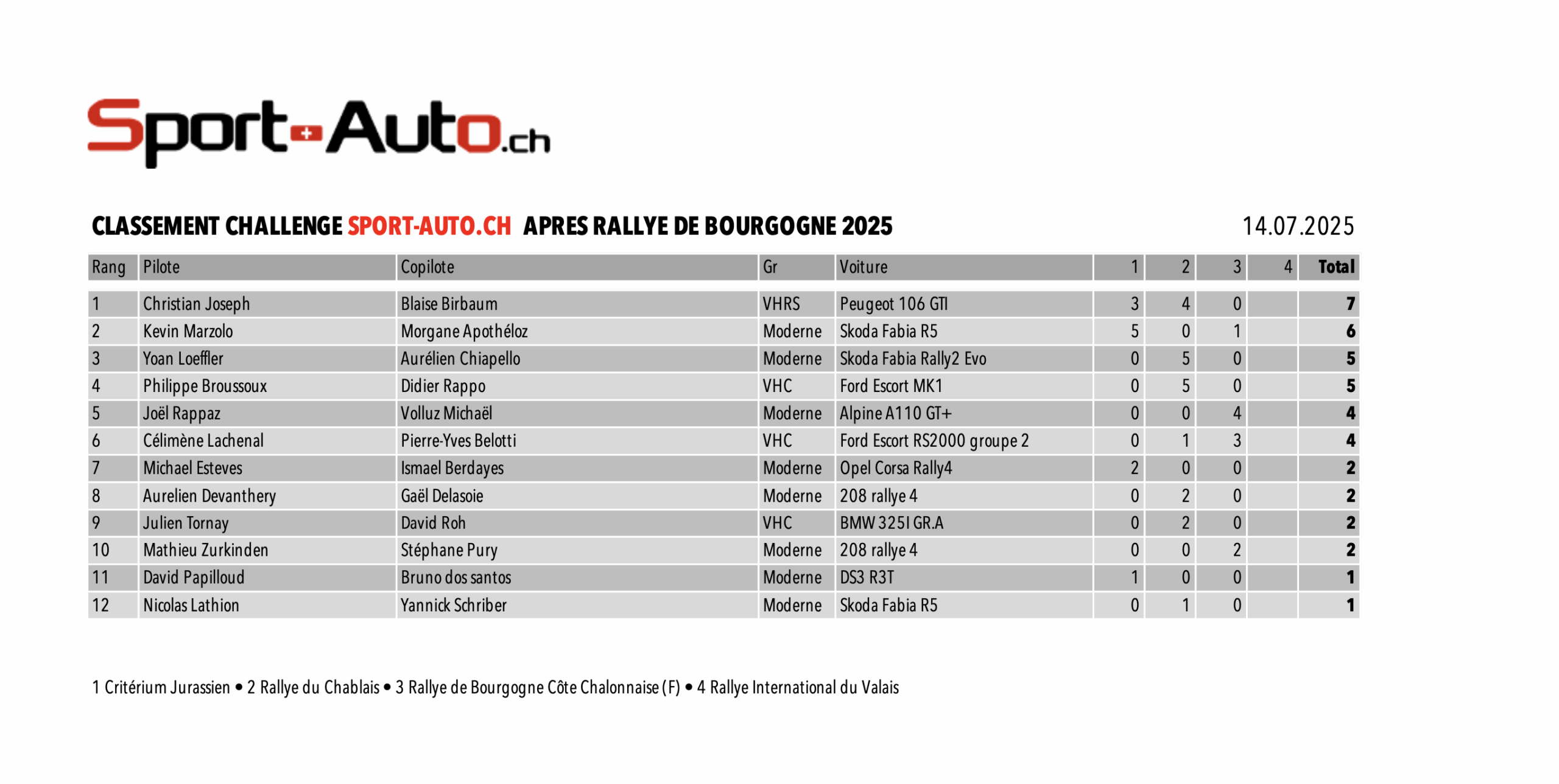 Six pilotes peuvent encore décrocher le tout premier Challenge Sport-Auto.ch… et tout engagé a encore une chance de monter sur le podium. Rien n’est joué. Le leader Christian Joseph a l’avantage… mais aussi la pression : Kevin Marzolo est dans ses rétros, Yoan Loeffler chauffe les gommes, Philippe Broussoux guette une ouverture en VHC, Célimène Lachenal rêve d’un finish à la Corse… et Joël Rappaz pourrait bien glisser son Alpine dans la brèche au moment décisif.