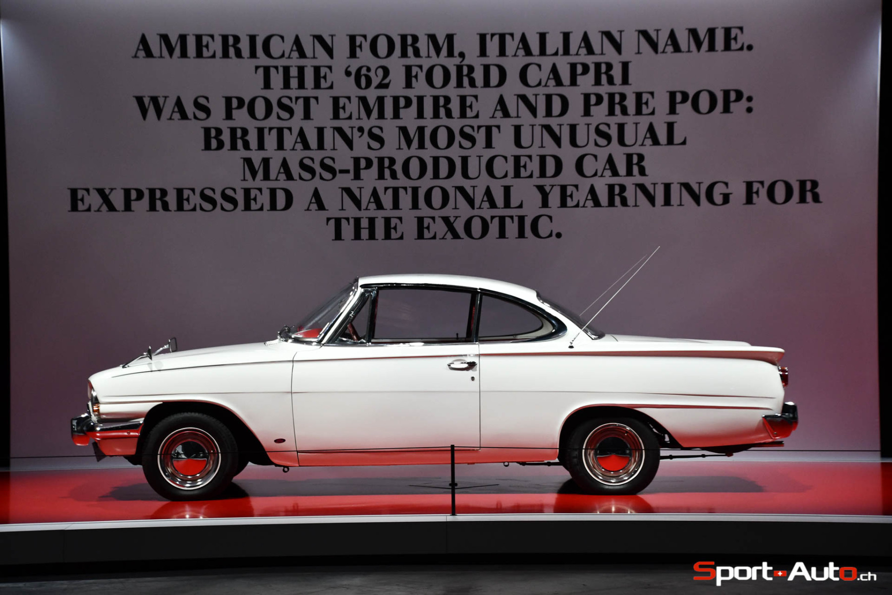 Les 113 véhicules exposés – «dont un quart était officiellement disponible à la vente » – n’étaient pas tous exclusifs ou de très haut de gamme. Il y avait également plusieurs modèles populaires, «culturellement intéressants», à l’image d’une Ford Consul Capri, «fascinant mélange de lignes américaines, de nom italien et d’exigences britanniques».