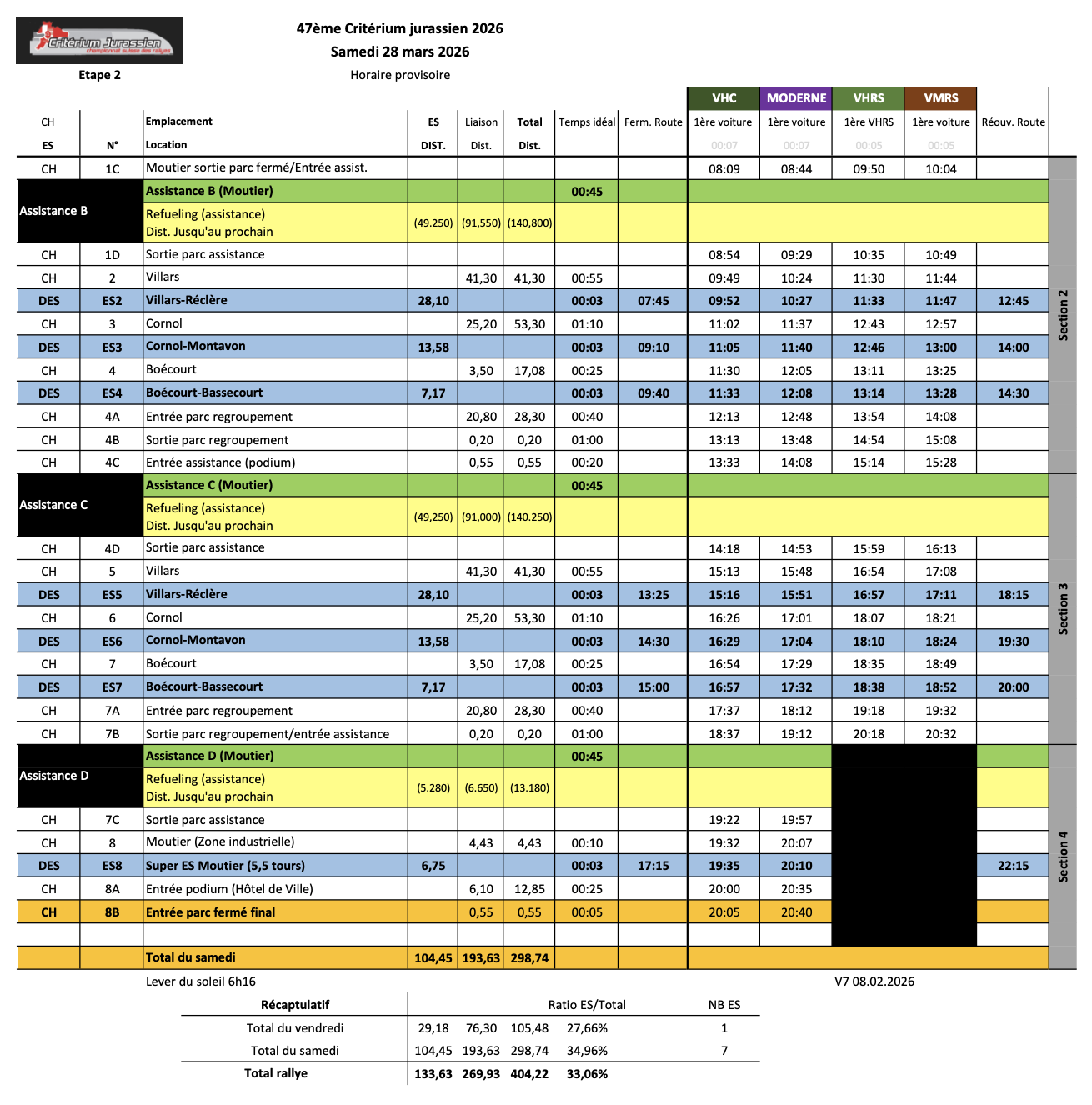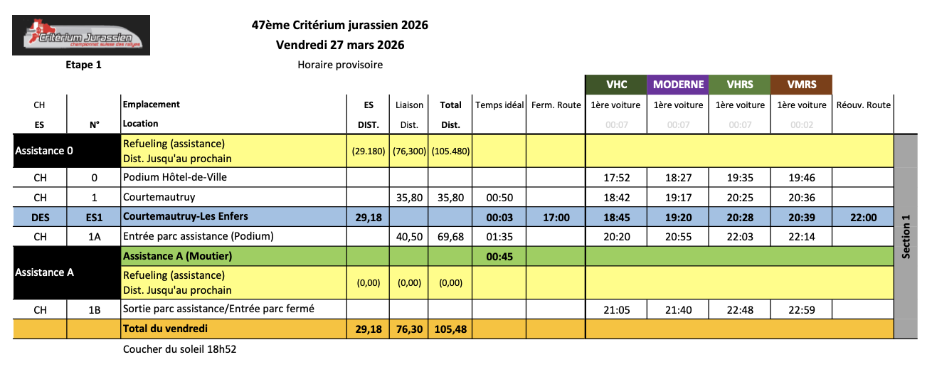 Pour la première manche du Championnat suisse des rallye 2026, les équipages suisses et étrangers se retrouveront pour la première fois à Moutier. On y verra évoluer les véhicules modernes, les VHC (Véhicules historiques de compétition) ainsi que les VHRS (Véhicules historiques de régularité sportive), VMRS (Véhicules modernes de régularité sportive) ou encore les Slowly Sideways. Dès vendredi soir, les équipages s’élanceront pour la première spéciale nocturne. Le samedi comptera 4 spéciales différentes pour un total de 7 chronos dont la Super Spéciale de Moutier. Au total, le rallye est composé de 8 épreuves chronométrées, soit 133 km, pour un total de 404 kilomètres.