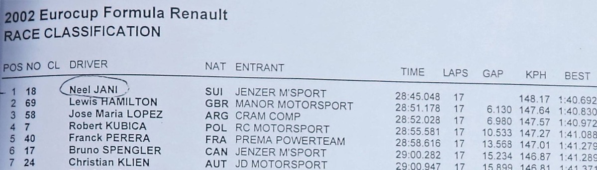 En Formule Renault européenne, il s’était en effet révélé plus rapide qu’un certain Lewis Hamilton comme le prouve le classement ci-dessous d’une course disputée sur le Hungaroring en 2002. Neel Jani ne s’y était pas seulement imposé en battant Lewis Hamilton mais il y avait également signé le record du tour en course: 1’40.692 contre 1’40.830 pour le futur septuple champion du monde de F1 !