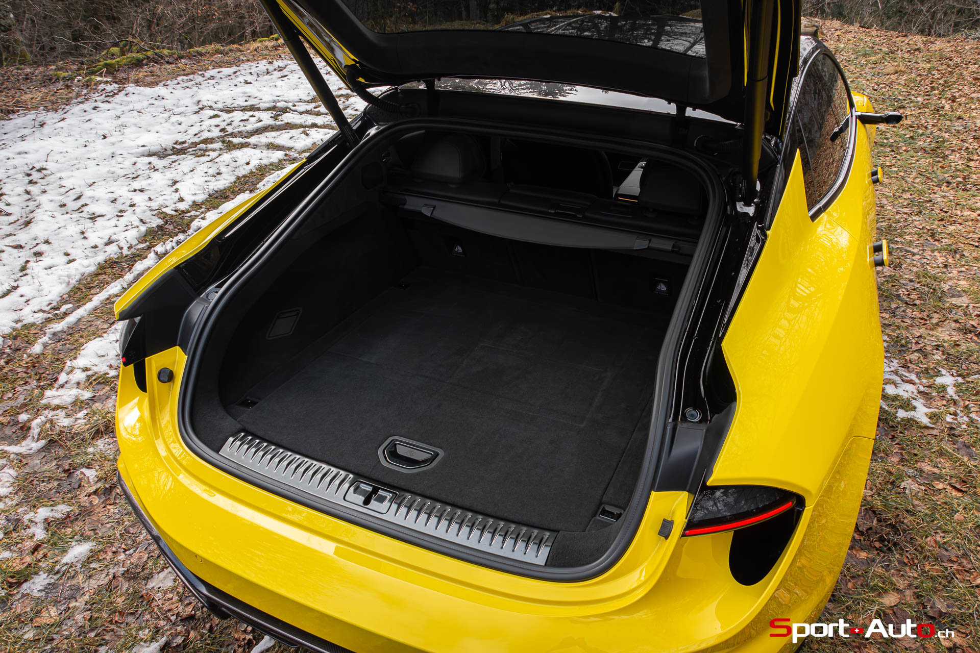 Notre véhicule est équipé du pack carbone étendu intérieur (CHF 1’830.-) et extérieur (CHF 5’460.-) qui comprend entre autres de magnifiques coques de sièges en carbone. Sièges confort (CHF 4’230.-) qui sont ventilés, chauffants et massants. Elle bénéficie également d’un toit en carbone (CHF 4’120.-). L’habitabilité est bonne, surtout aux places arrière, qui reçoivent des sièges chauffants et ventilés. En revanche, il est dommage que le coffre, ayant un plancher de chargement haut, subisse la faible hauteur du hayon, ce qui limite fortement l’espace de chargement.