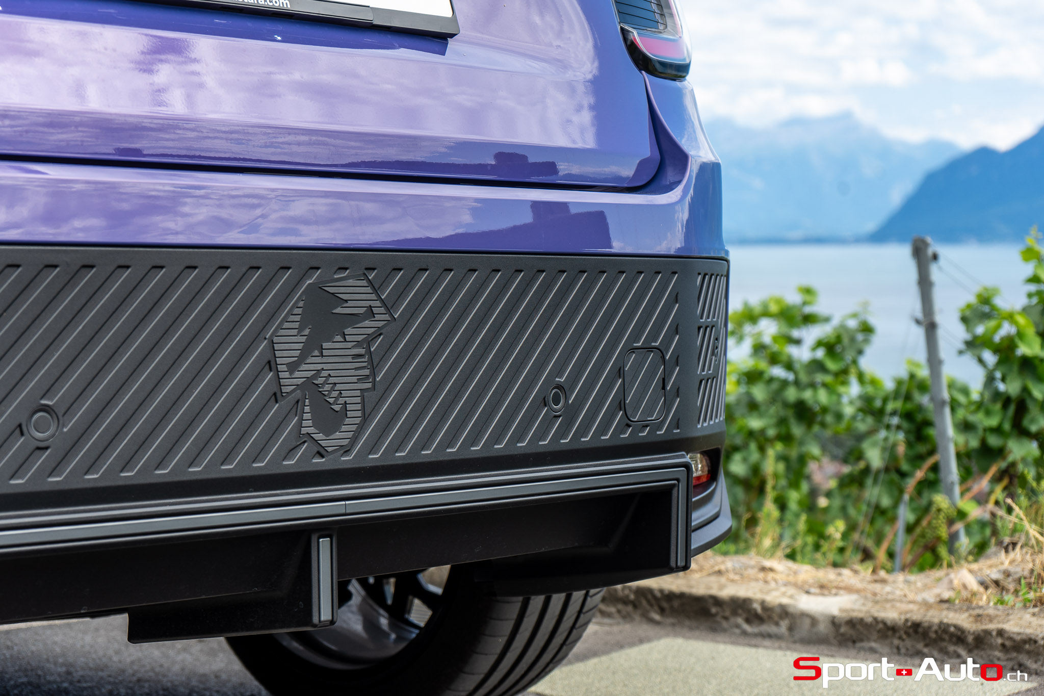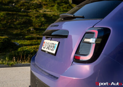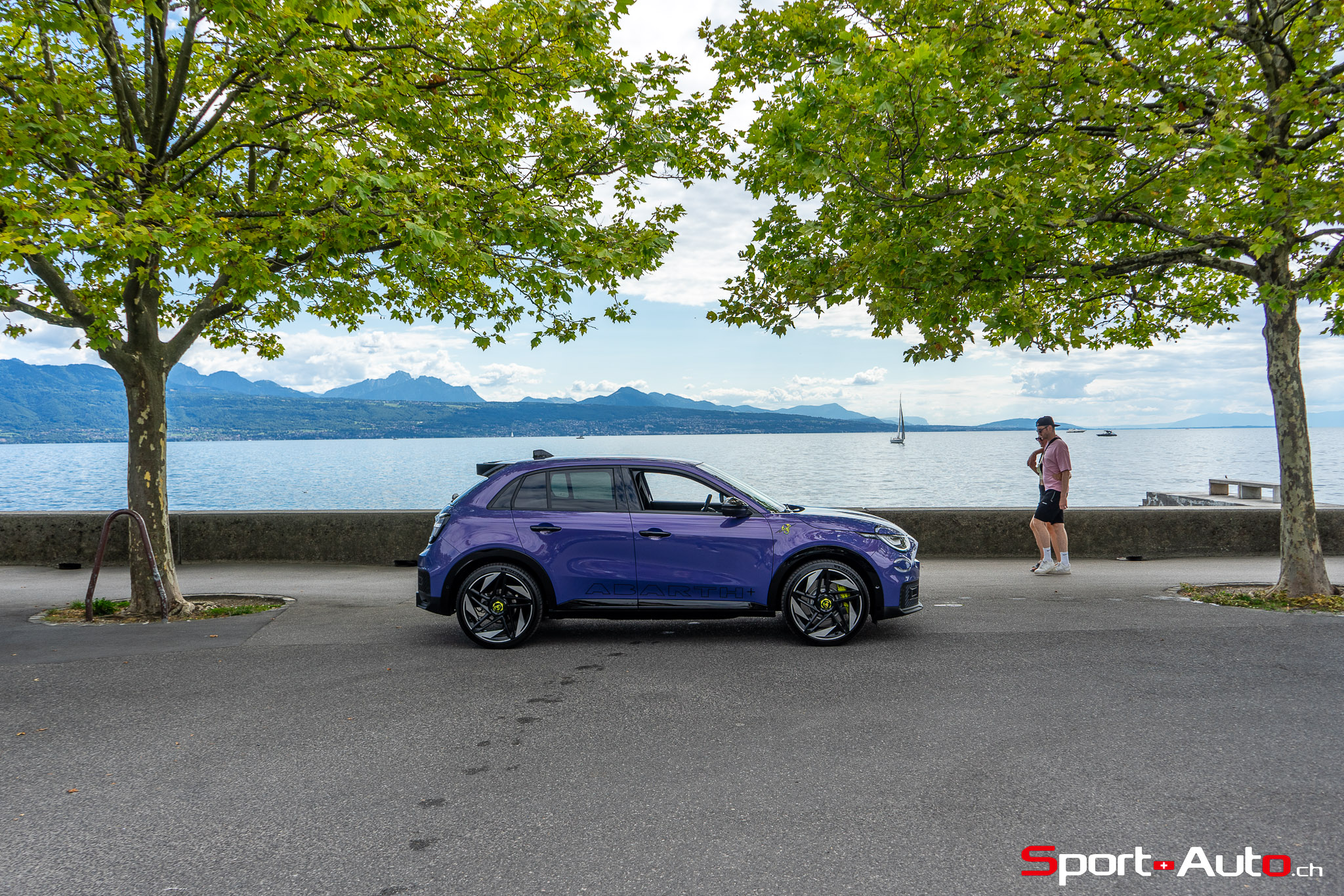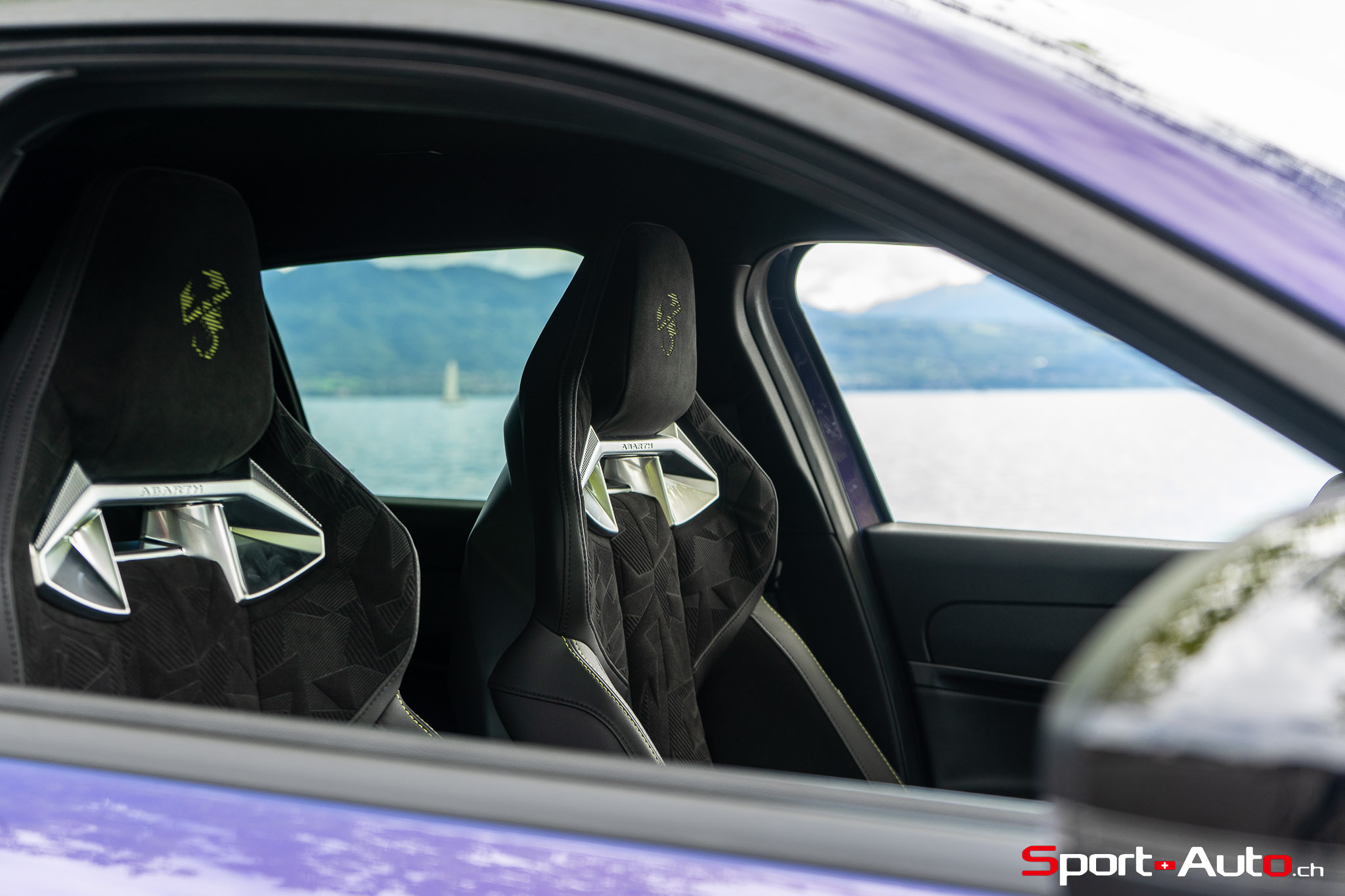 Notre Abarth 600e Scorpionissima affiche un prix de base de CHF 51’900.-, montant qui inclut un équipement standard plutôt riche : Pack ADAS+, kit mains libres, vitrage teinté arrière etc. L’unique option de notre exemplaire est la peinture violette (CHF 800.-). Un “Abarth Bonus” de CHF 3000.- allège finalement le montant final à CHF 49’700.-. La toute première voiture 5 portes du préparateur italien affronte une concurrence hétérogène : Cupra Born VZ (propulsion, 326 ch, à partir de CHF 49’400.-), ou encore Smart #1 Brabus (4×4, 428 ch, à partir de CHF 50’490.-). L’Alfa-Romeo Junior Veloce, dont nous vous proposerons prochainement l’essai, est également sur le papier une rivale très sérieuse : elle dispose de la même batterie, tout en étant légèrement plus courte et même moins lourde (4.17 m et 1635 kg, contre 4.18 m et 1716 kg pour la 600e).
