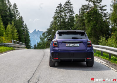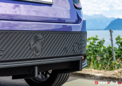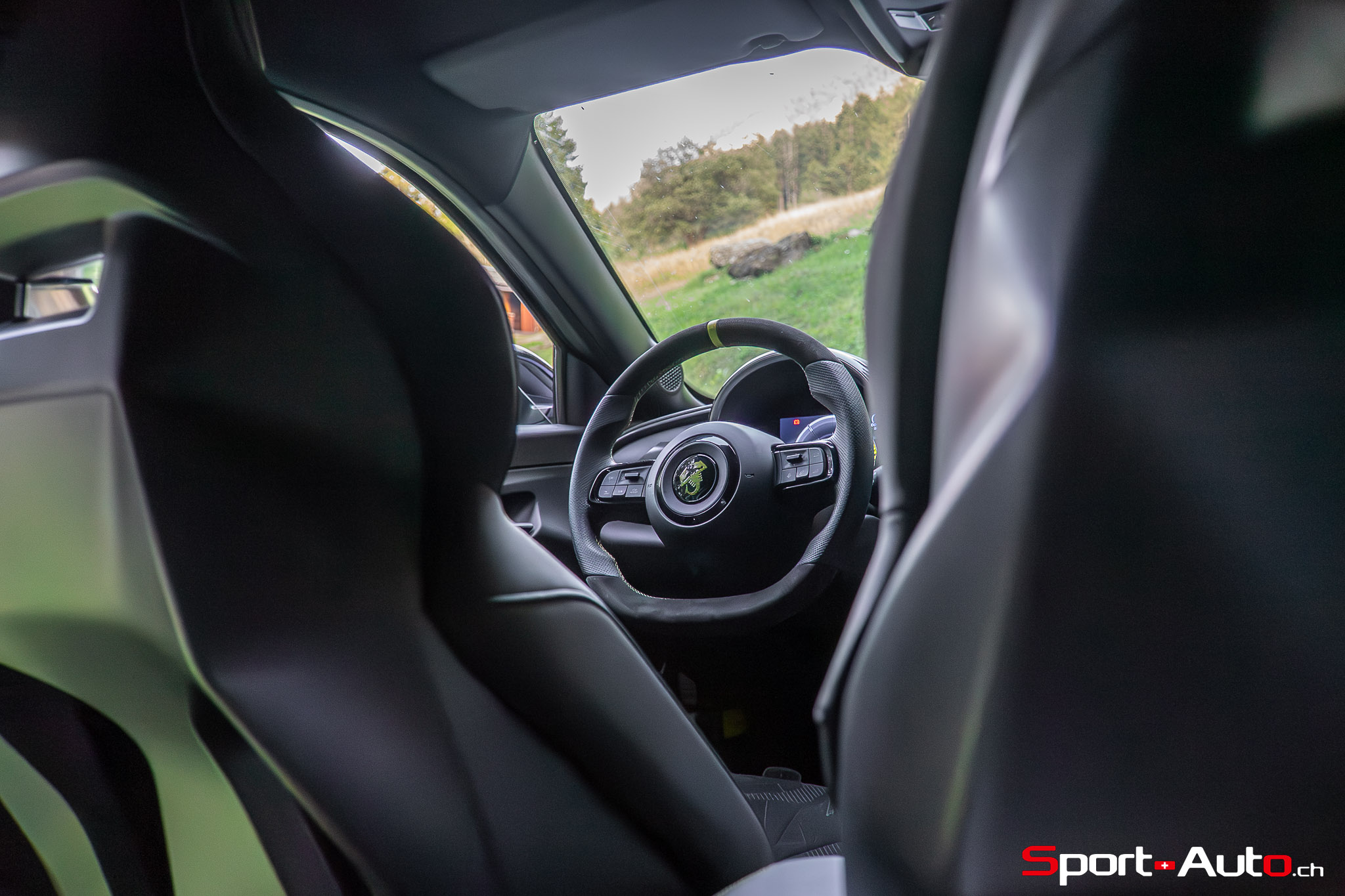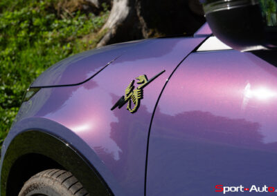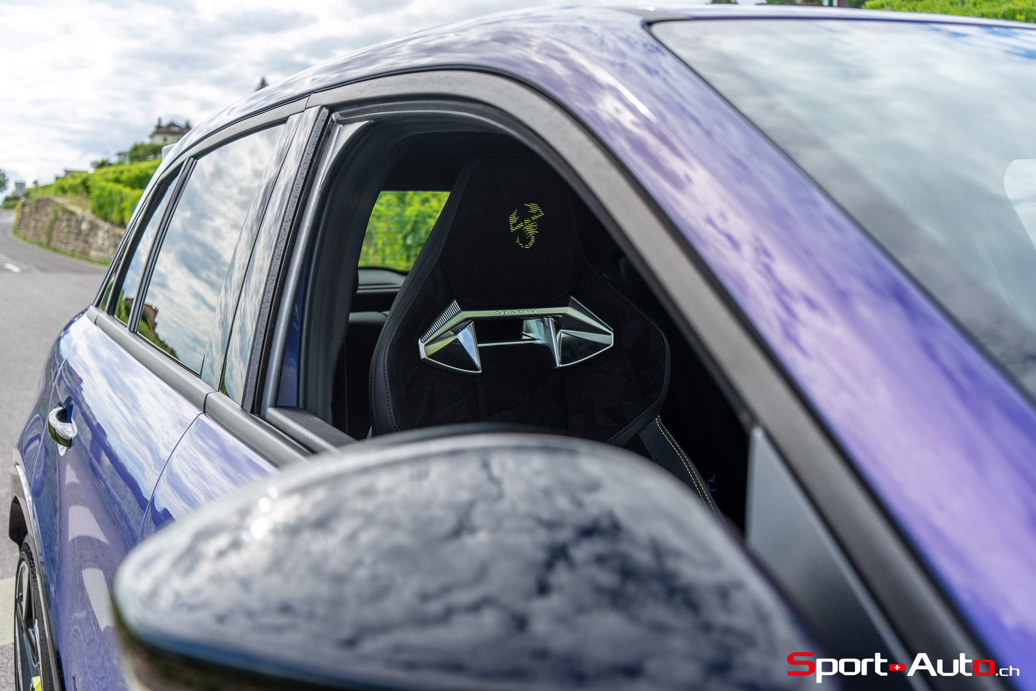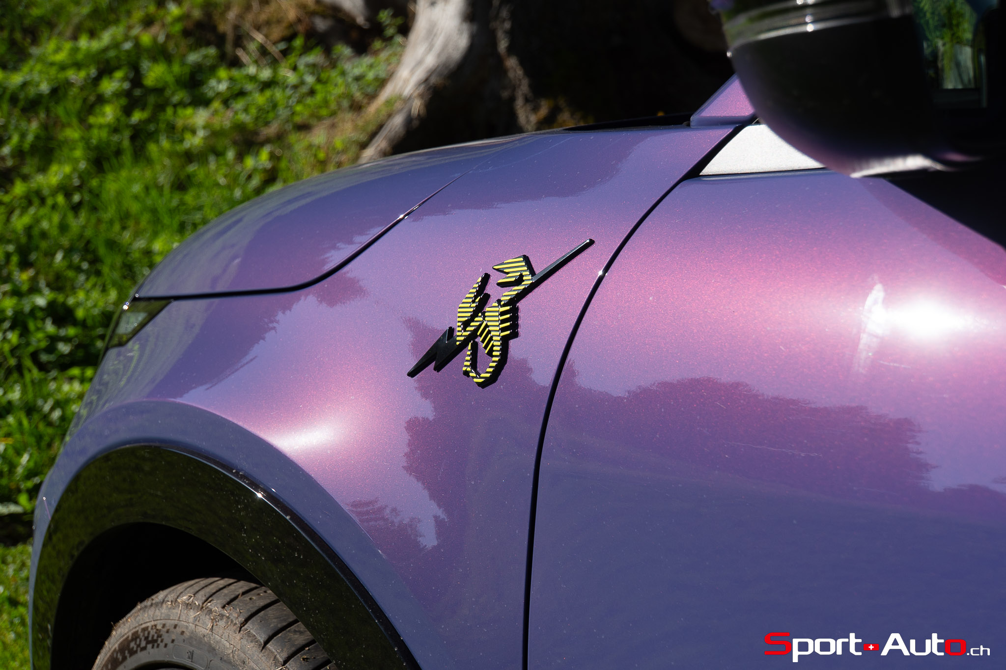 Notre Abarth 600e Scorpionissima affiche un prix de base de CHF 51’900.-, montant qui inclut un équipement standard plutôt riche : Pack ADAS+, kit mains libres, vitrage teinté arrière etc. L’unique option de notre exemplaire est la peinture violette (CHF 800.-). Un “Abarth Bonus” de CHF 3000.- allège finalement le montant final à CHF 49’700.-. La toute première voiture 5 portes du préparateur italien affronte une concurrence hétérogène : Cupra Born VZ (propulsion, 326 ch, à partir de CHF 49’400.-), ou encore Smart #1 Brabus (4×4, 428 ch, à partir de CHF 50’490.-). L’Alfa-Romeo Junior Veloce, dont nous vous proposerons prochainement l’essai, est également sur le papier une rivale très sérieuse : elle dispose de la même batterie, tout en étant légèrement plus courte et même moins lourde (4.17 m et 1635 kg, contre 4.18 m et 1716 kg pour la 600e).