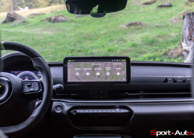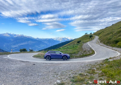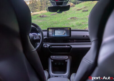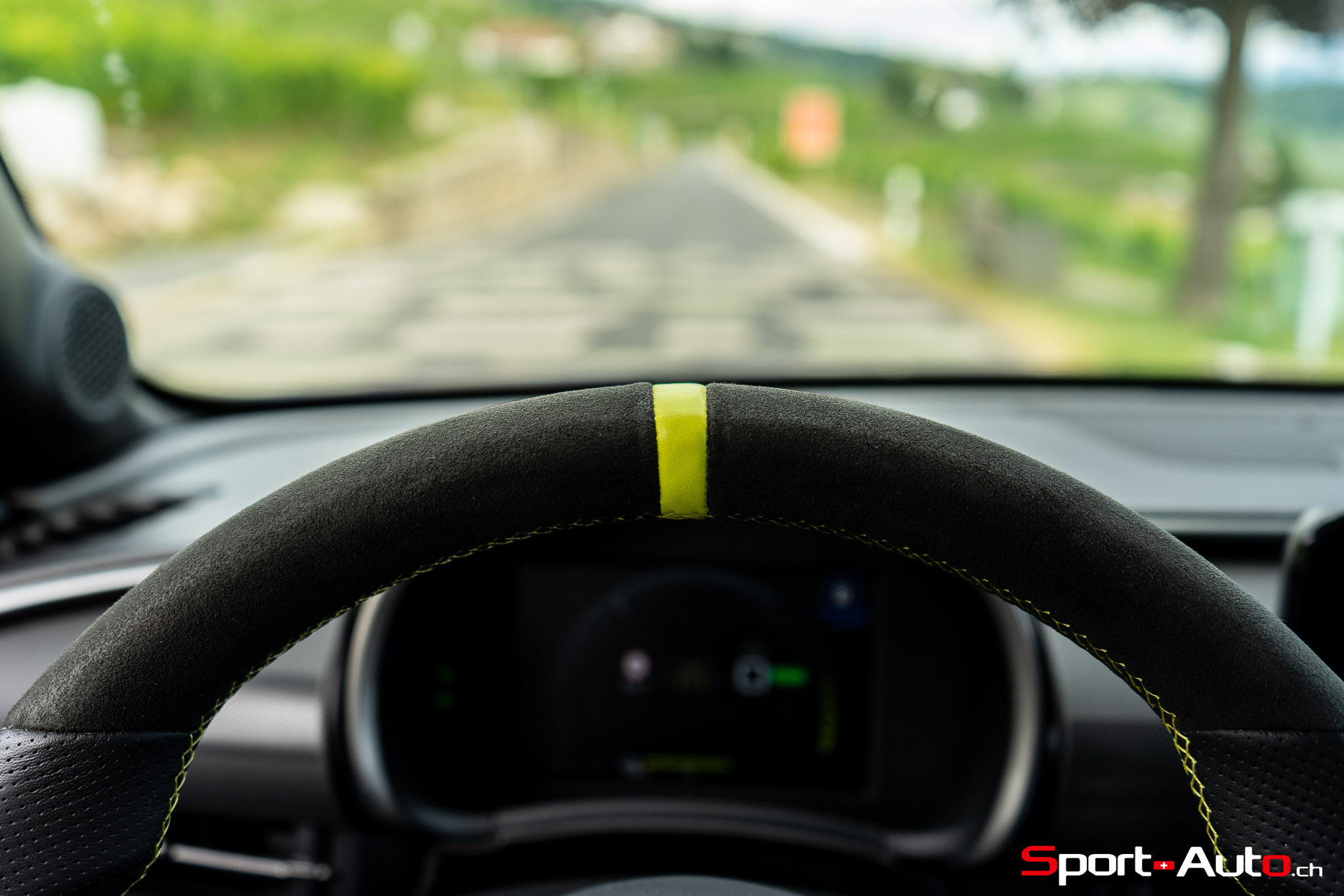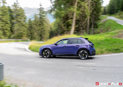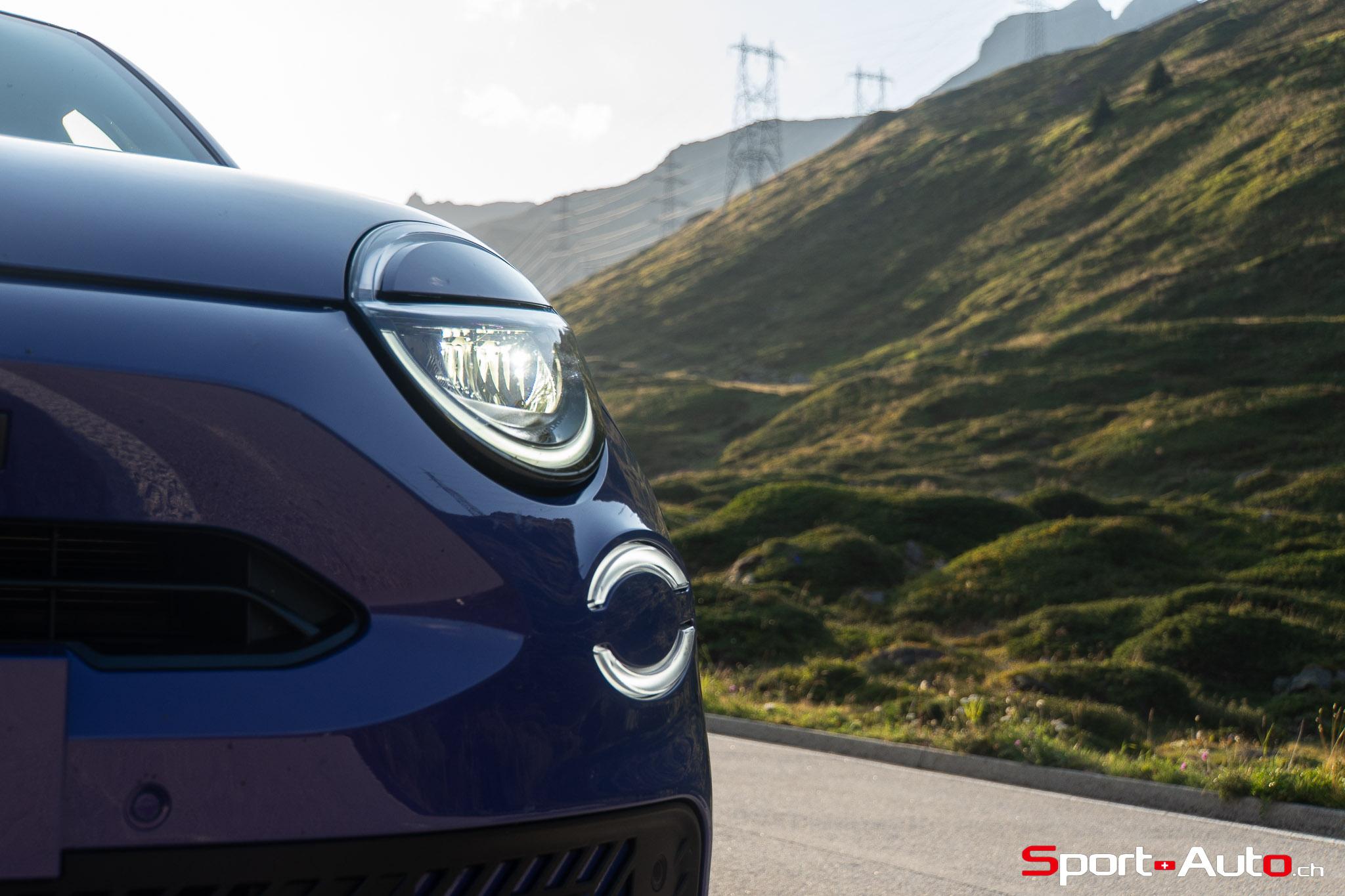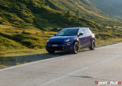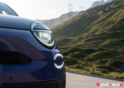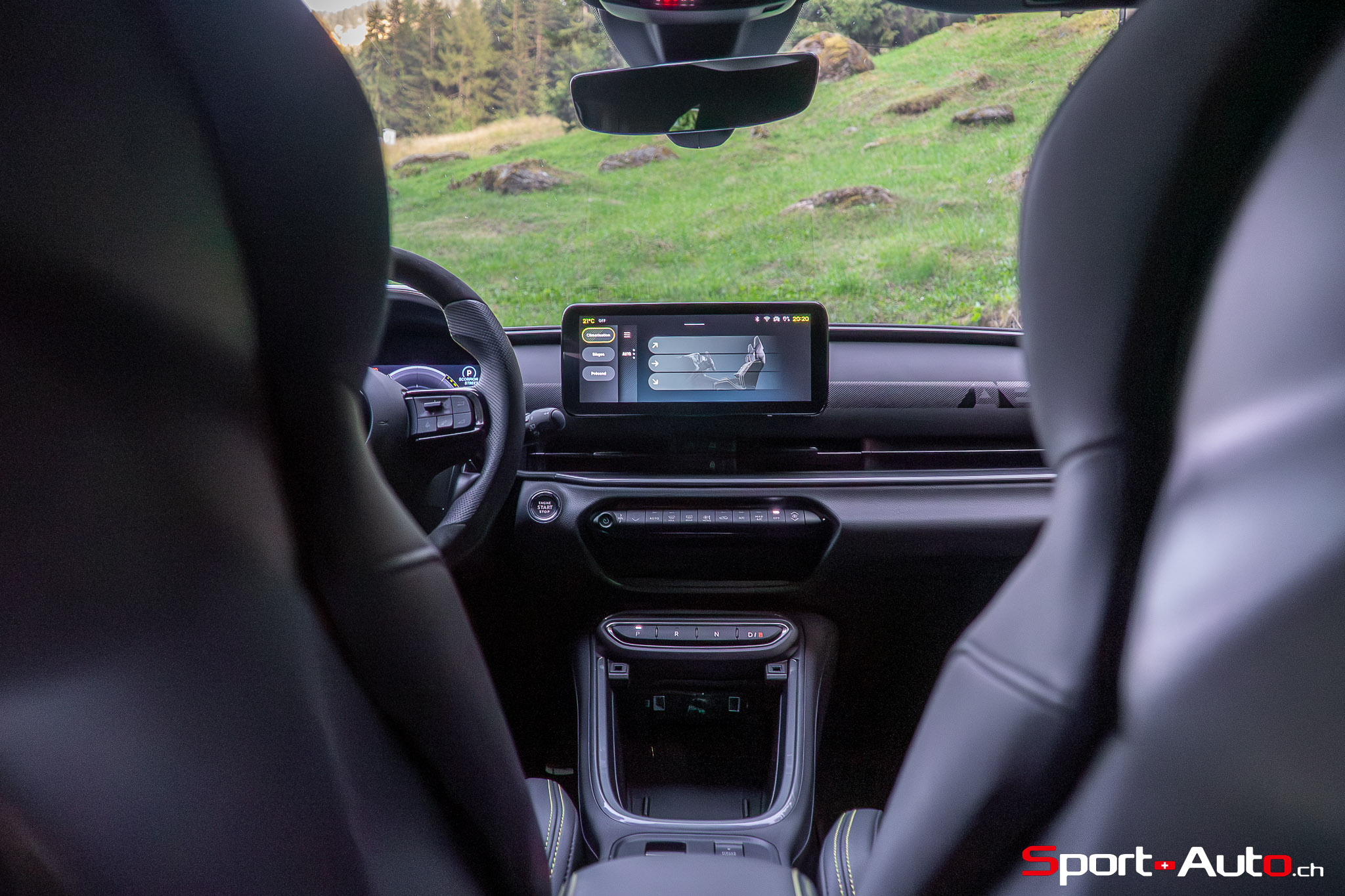 Sur les courbes sinueuses du circuit de Lignières, l’Abarth 600e nous avait fait bonne impression. Sur les routes de montagne, on retrouve cette rigueur au niveau du châssis. Certes, à l’accélération il faut bien tenir le volant entre ses mains, surtout lors des changements d’angles du volant dans les accélérations à pleine charge sur les revêtements de route inégaux. Mais le tout est bien calibré, la direction étant assez réactive et pas trop légère pour éviter des sensations floues. Côté performances, les 280 ch sont largement suffisants pour se faire plaisir. Le différentiel propulse efficacement la voiture en sortie de courbe. Avec toute cette cavalerie aux roues avant, il est mis à rude épreuve. Fait étonnant : il est désactivable… mais seulement avant 50 km/h. Autre petite surprise à relever : sur un départ arrêté en entrée d’autoroute (à plat et sans passagers) nous avons mesuré un 0 à 100 km/h en 5.5 secondes au lieu des 5.85 secondes annoncées par le constructeur !