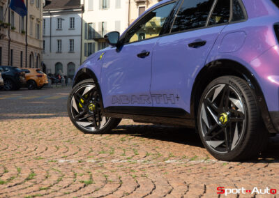 Les jantes de 20 pouces, au dessin de scorpion, donnent un effet sophistiqué et pimpant bienvenu à ce petit SUV. Les logos Abarth latéraux, les caches moyeux des roues ainsi que les pinces de freins avant sont en vert et contrastent sur l’ensemble de la carrosserie. Un aileron au dessin inédit, reprenant les codes des Abarth des années 50, trône sur la malle arrière. Les parties inférieures des boucliers avant et arrière sont en stries, et évoquent les anciens radiateurs des Abarth de course des années 60.
