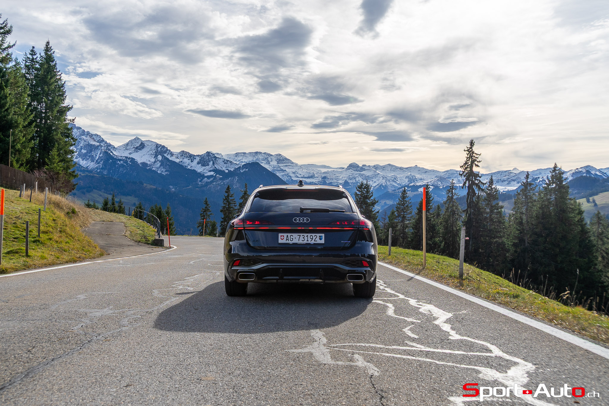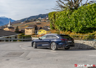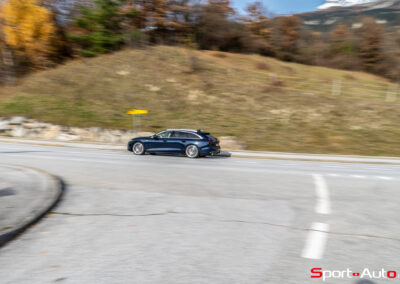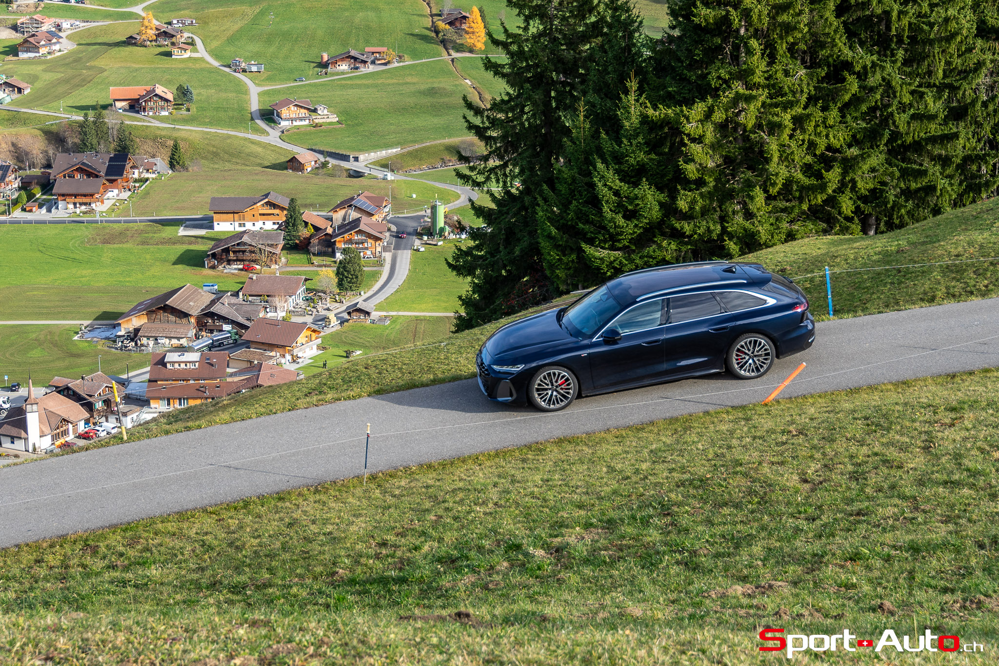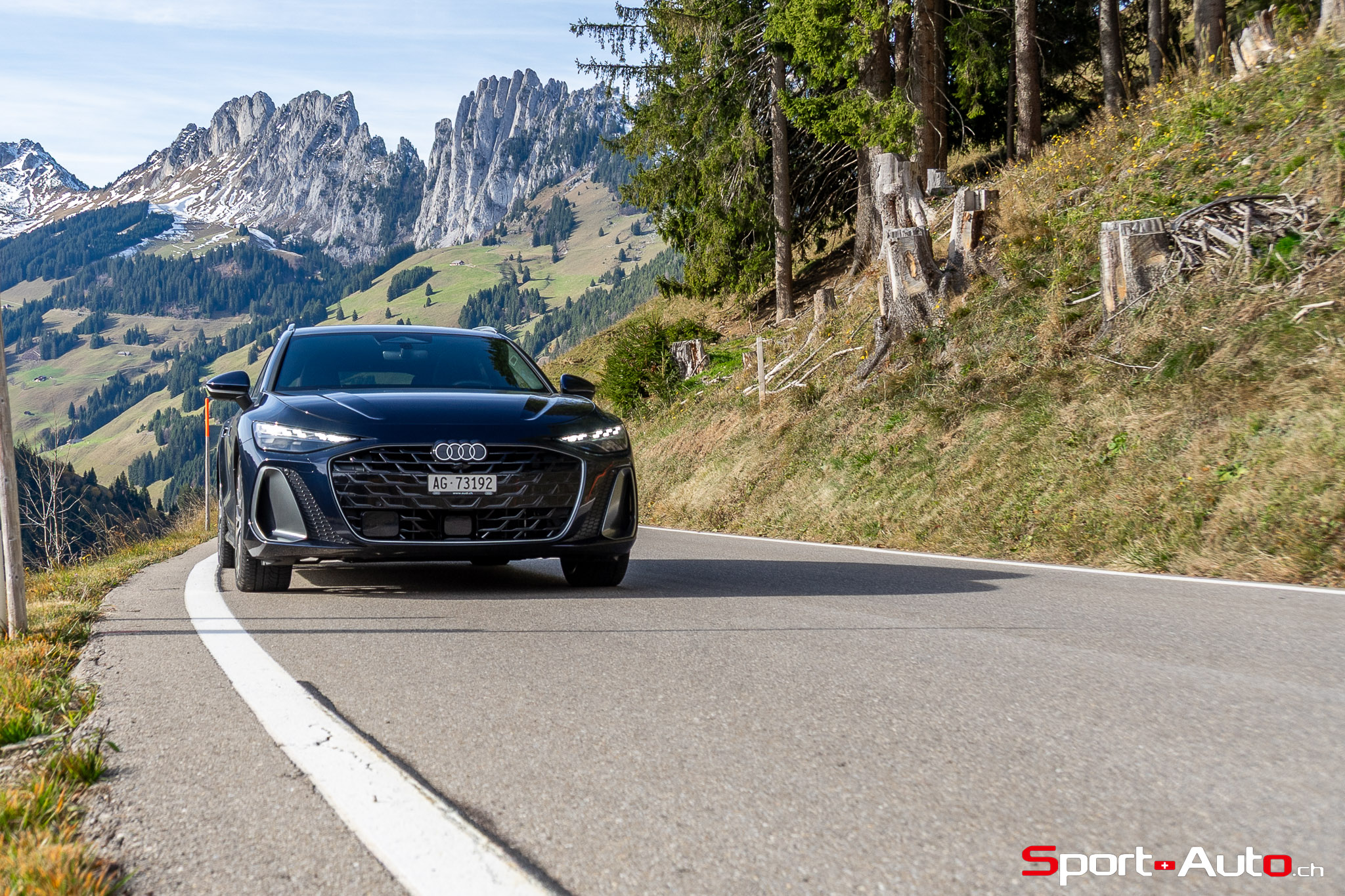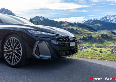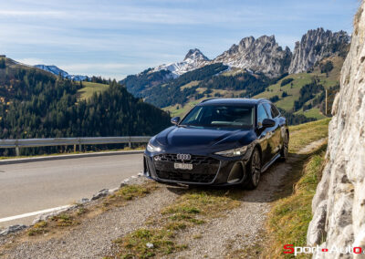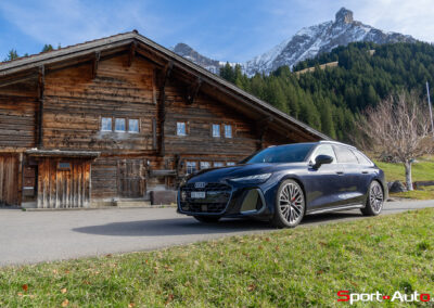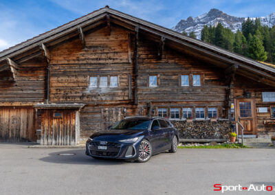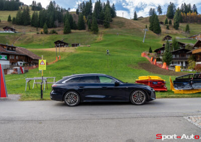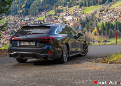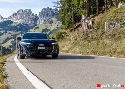 Grâce aux efforts des ingénieurs Audi sur l’hybridation légère et l’aérodynamisme, la nouvelle A6 sait se montrer sobre : nous avons mesuré une consommation moyenne de 7.9l/100km sur autoroute, et 8.3l/100km sur routes secondaires. Celles-ci nous mènent à présent au « Chuenisbärgli » près d’Adelboden, un endroit mythique du ski alpin suisse. C’est sur ce flanc de montagne que se situe l’une des pistes de slalom les plus difficiles du championnat du monde. Lorsque la neige ne le recouvre pas, on y retrouve des petites routes étroites sinueuses. Voyons à présent comment l’A6 Avant s‘y comporte !