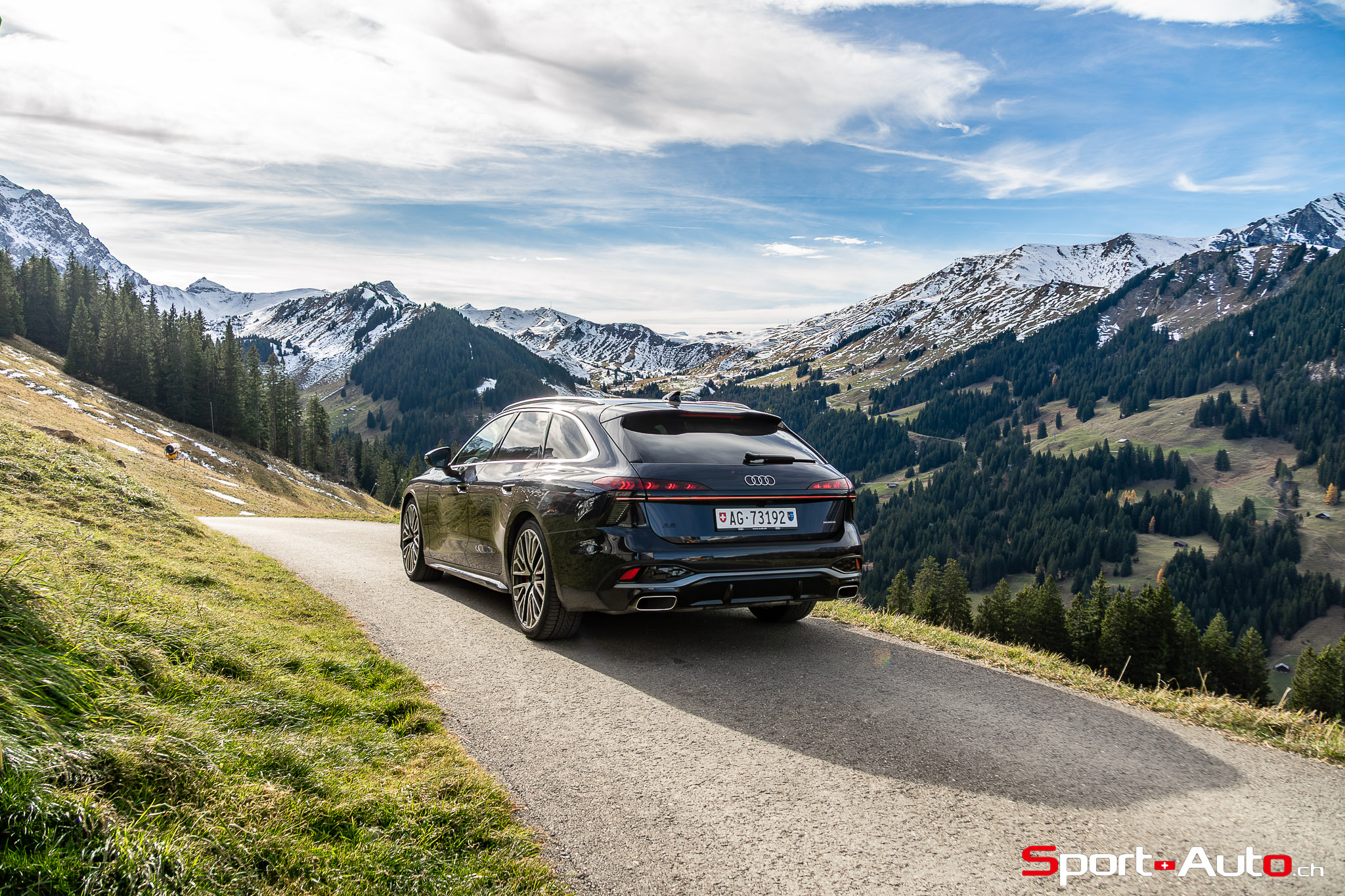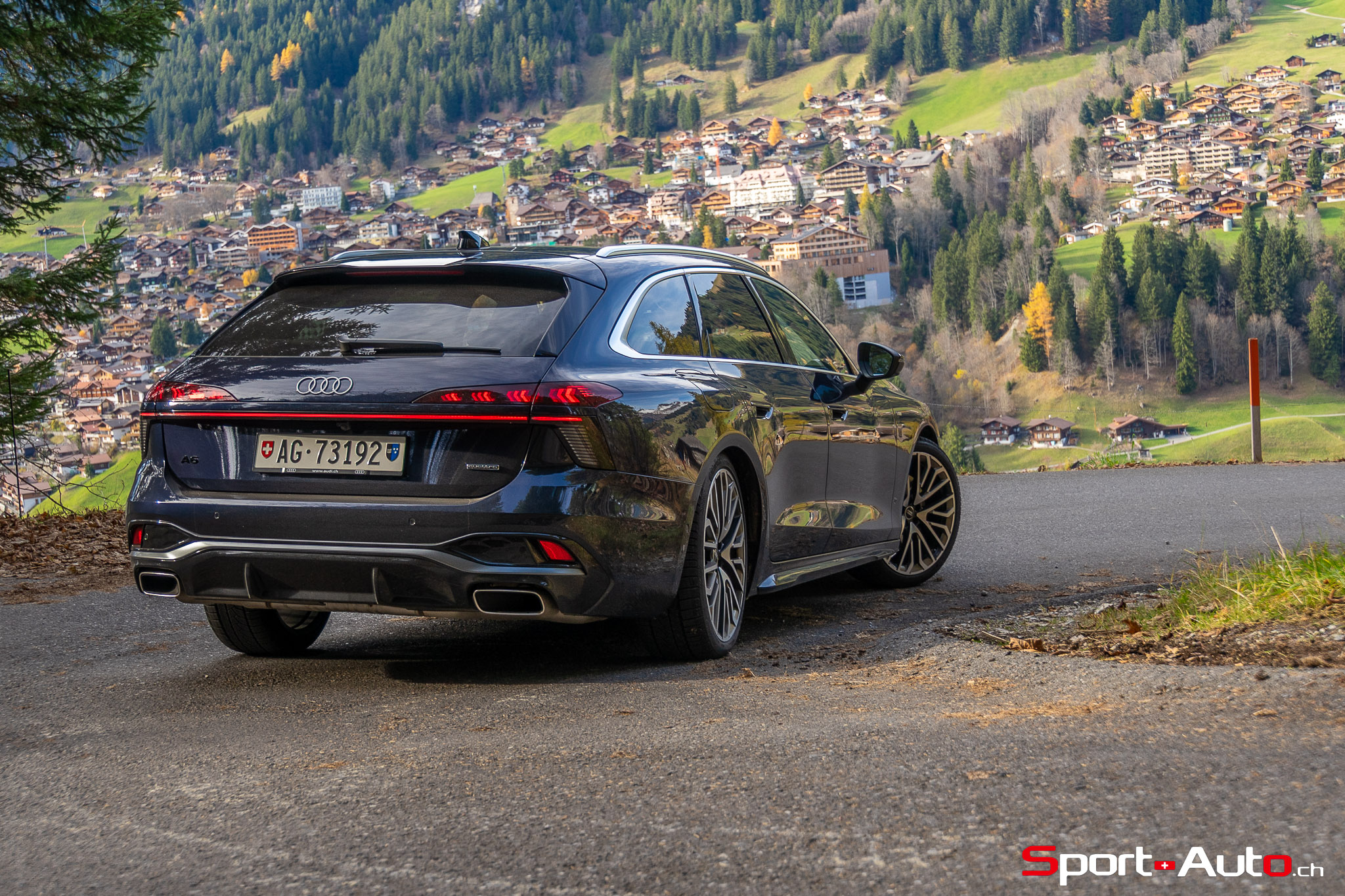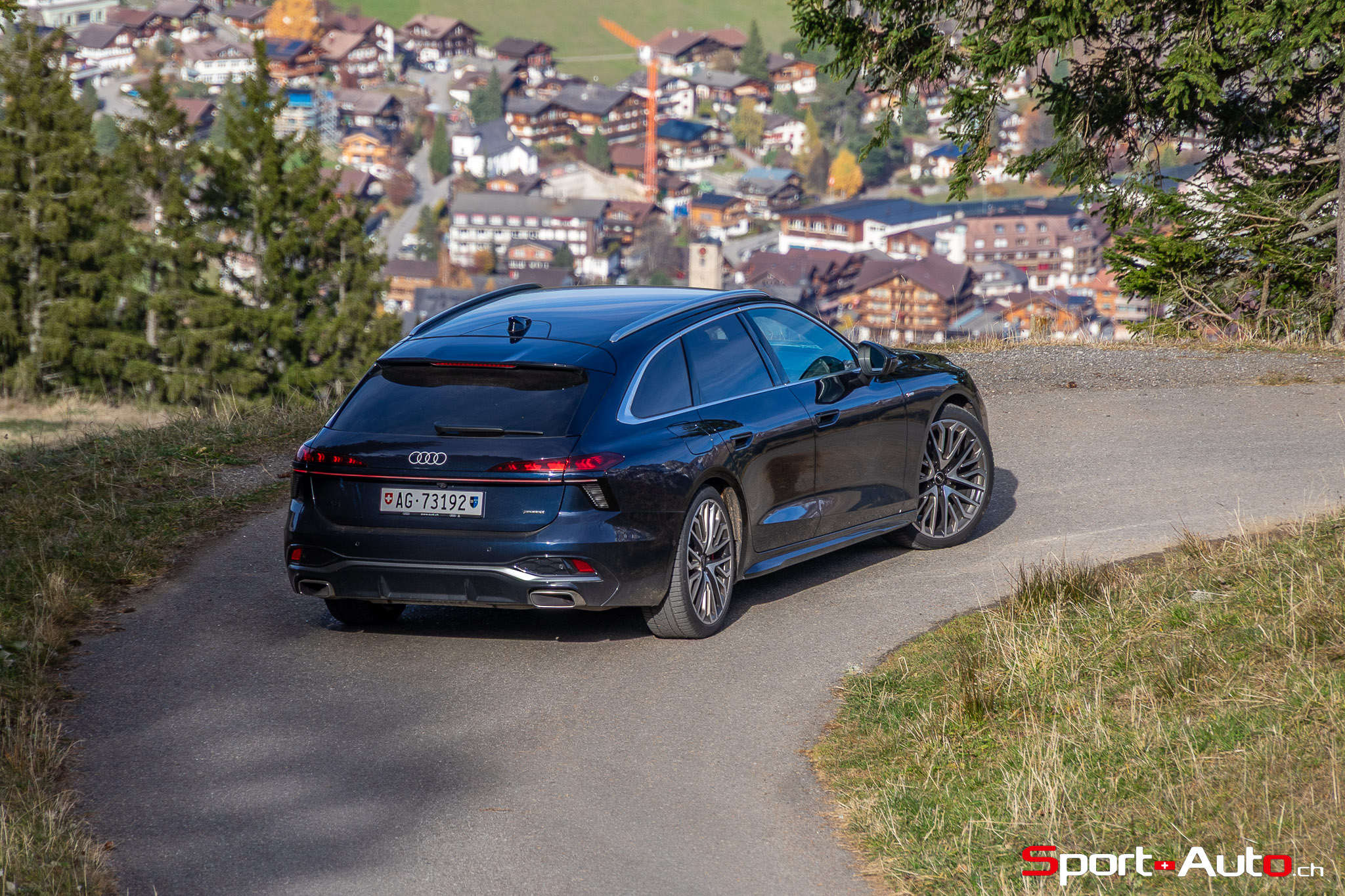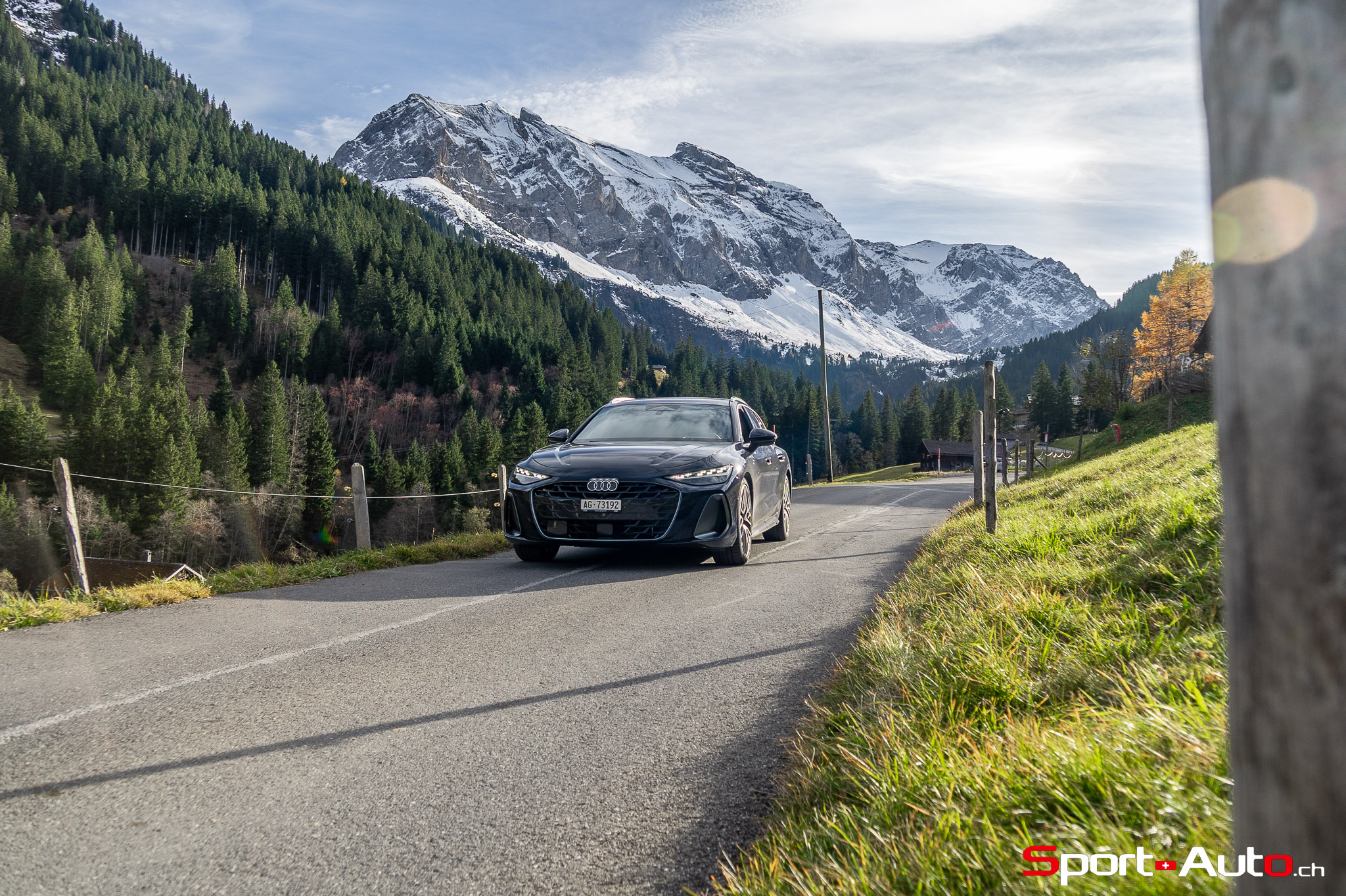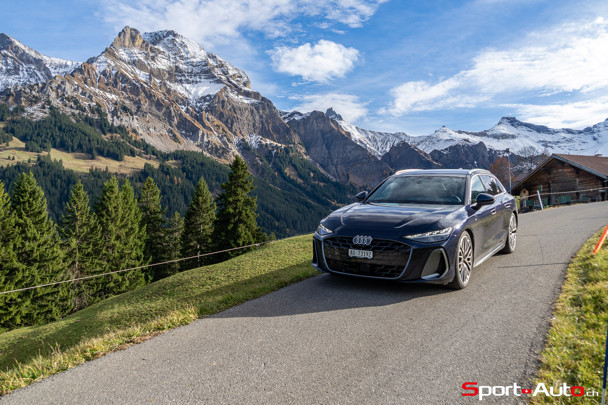 Grâce aux efforts des ingénieurs Audi sur l’hybridation légère et l’aérodynamisme, la nouvelle A6 sait se montrer sobre : nous avons mesuré une consommation moyenne de 7.9l/100km sur autoroute, et 8.3l/100km sur routes secondaires. Celles-ci nous mènent à présent au « Chuenisbärgli » près d’Adelboden, un endroit mythique du ski alpin suisse. C’est sur ce flanc de montagne que se situe l’une des pistes de slalom les plus difficiles du championnat du monde. Lorsque la neige ne le recouvre pas, on y retrouve des petites routes étroites sinueuses. Voyons à présent comment l’A6 Avant s‘y comporte !