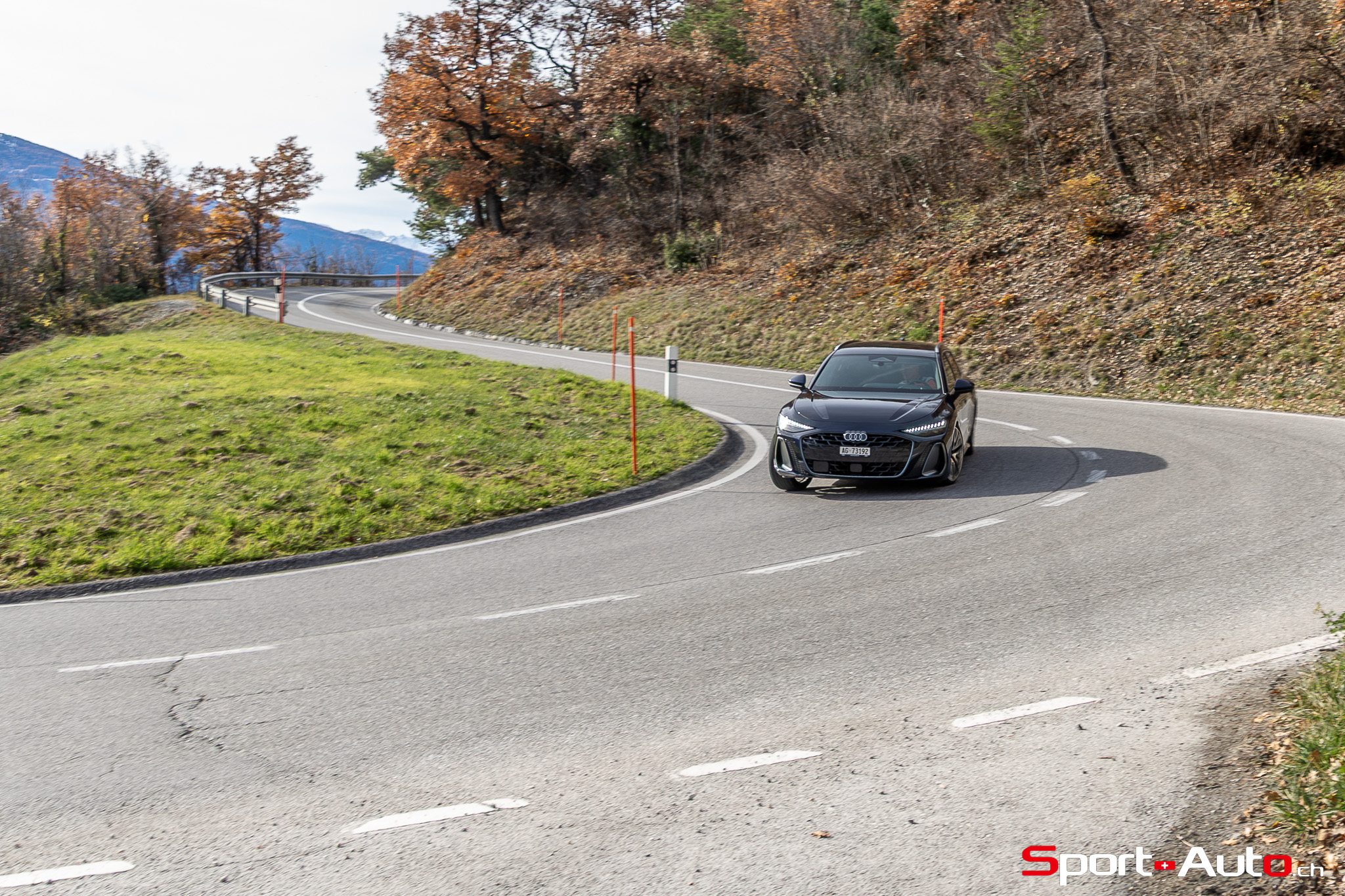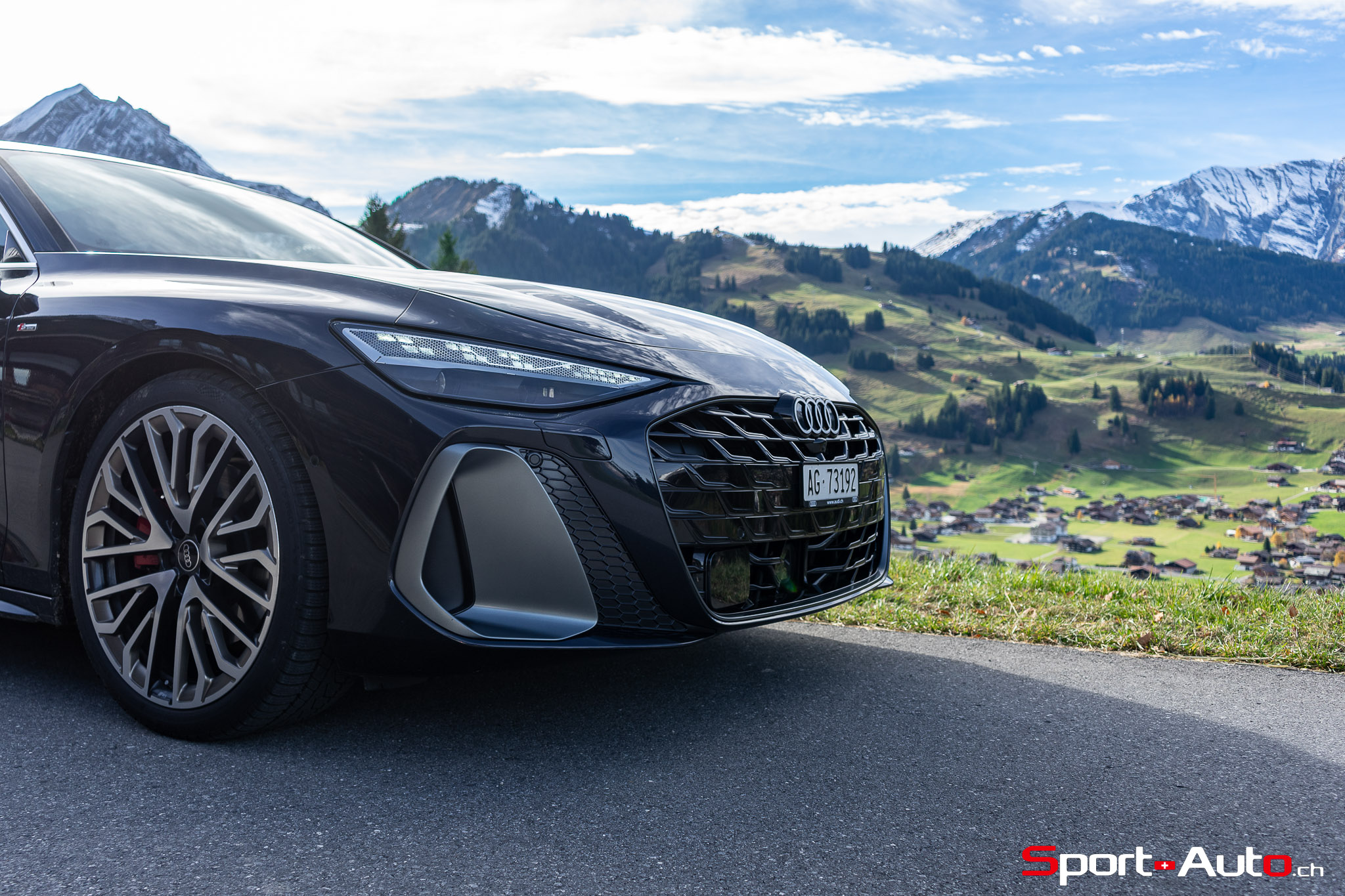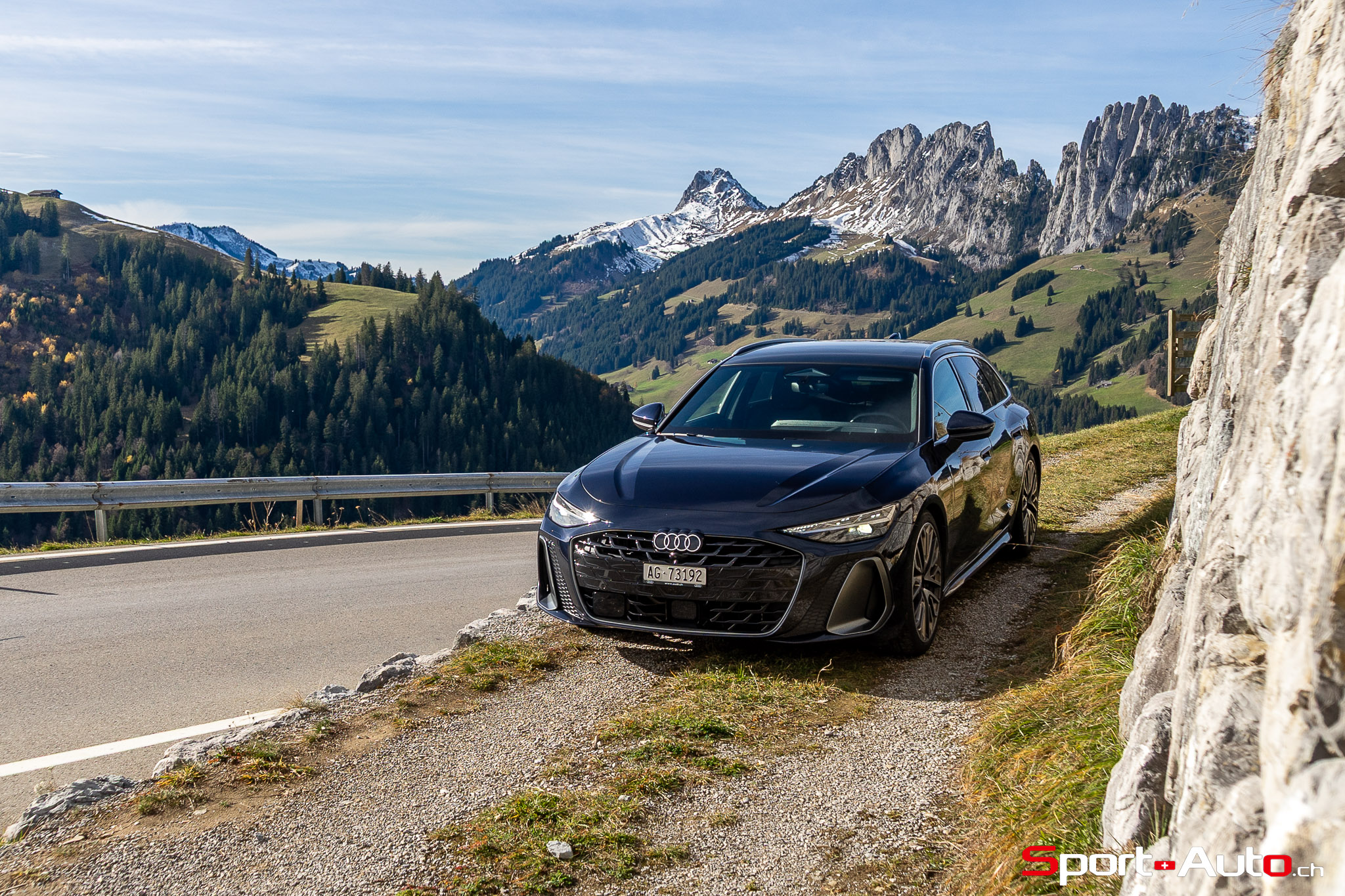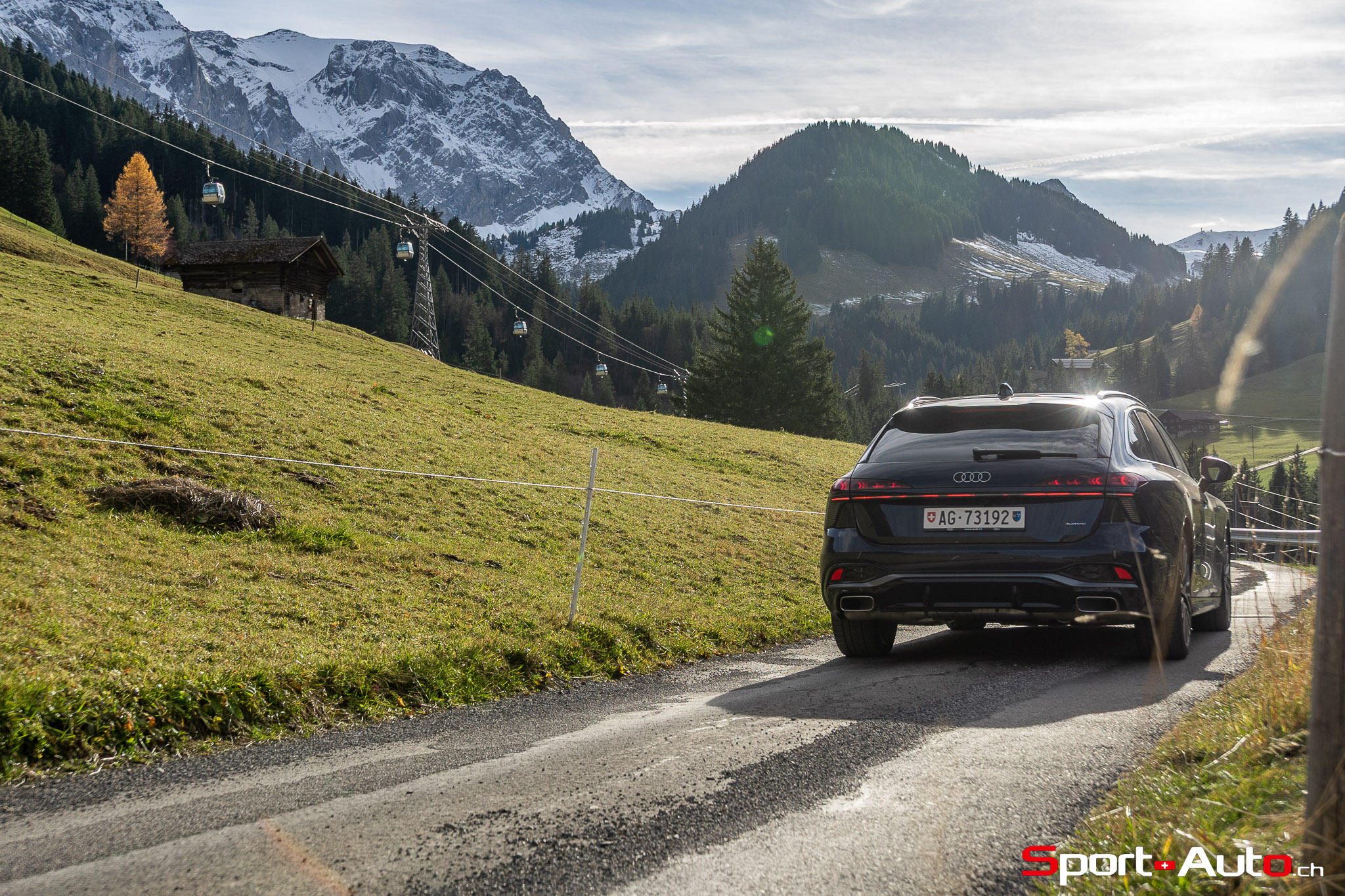 Grâce aux efforts des ingénieurs Audi sur l’hybridation légère et l’aérodynamisme, la nouvelle A6 sait se montrer sobre : nous avons mesuré une consommation moyenne de 7.9l/100km sur autoroute, et 8.3l/100km sur routes secondaires. Celles-ci nous mènent à présent au « Chuenisbärgli » près d’Adelboden, un endroit mythique du ski alpin suisse. C’est sur ce flanc de montagne que se situe l’une des pistes de slalom les plus difficiles du championnat du monde. Lorsque la neige ne le recouvre pas, on y retrouve des petites routes étroites sinueuses. Voyons à présent comment l’A6 Avant s‘y comporte !