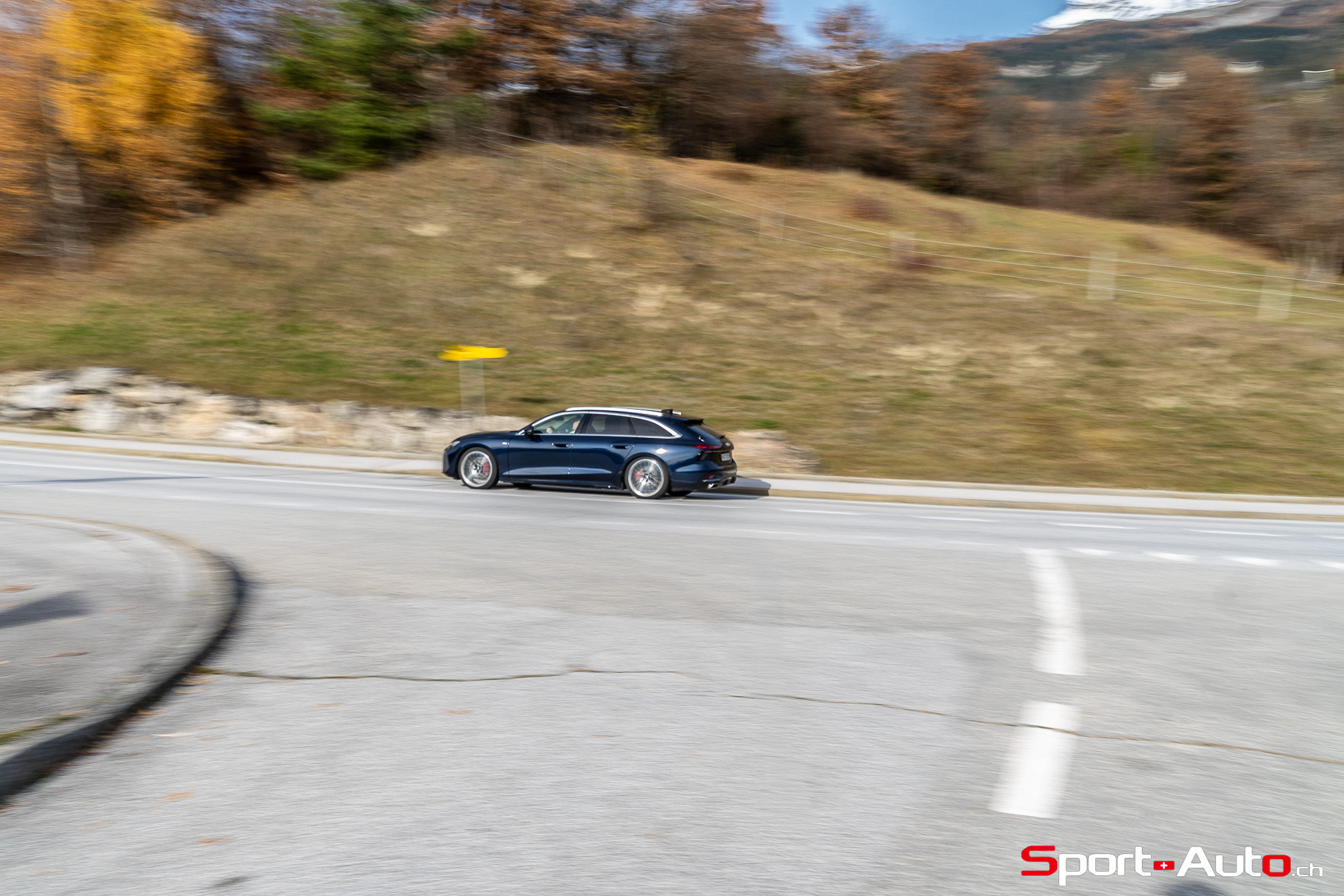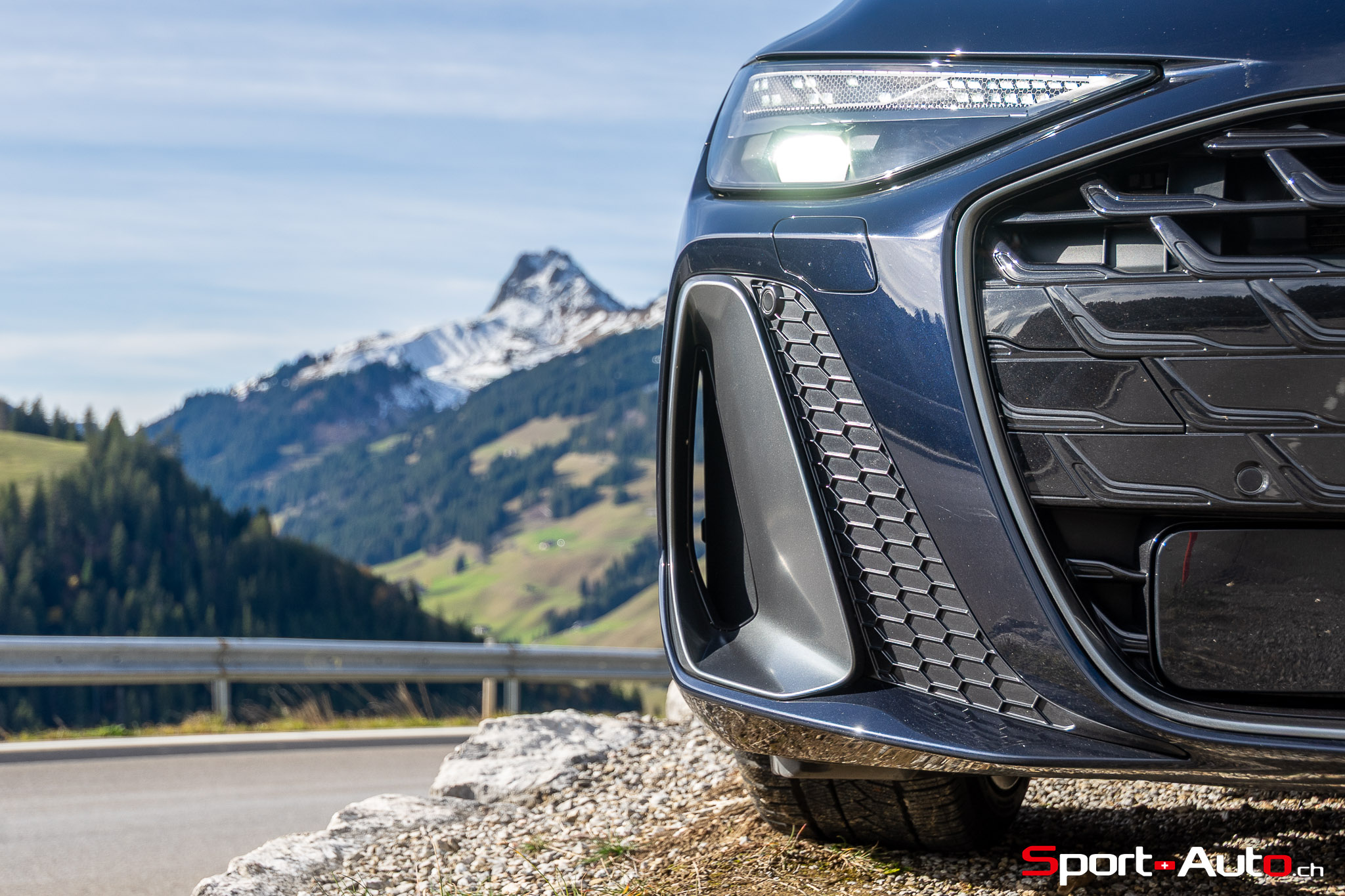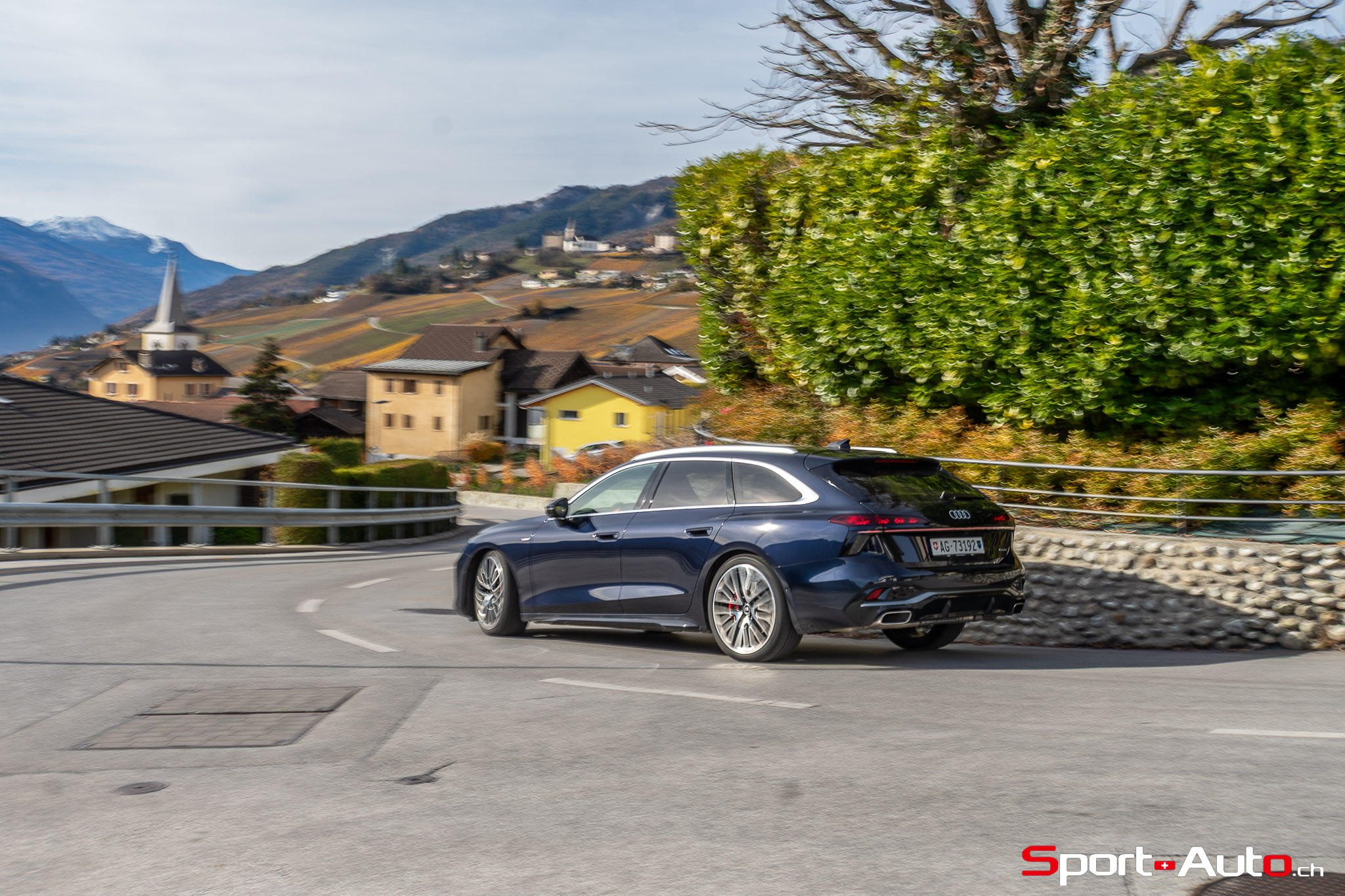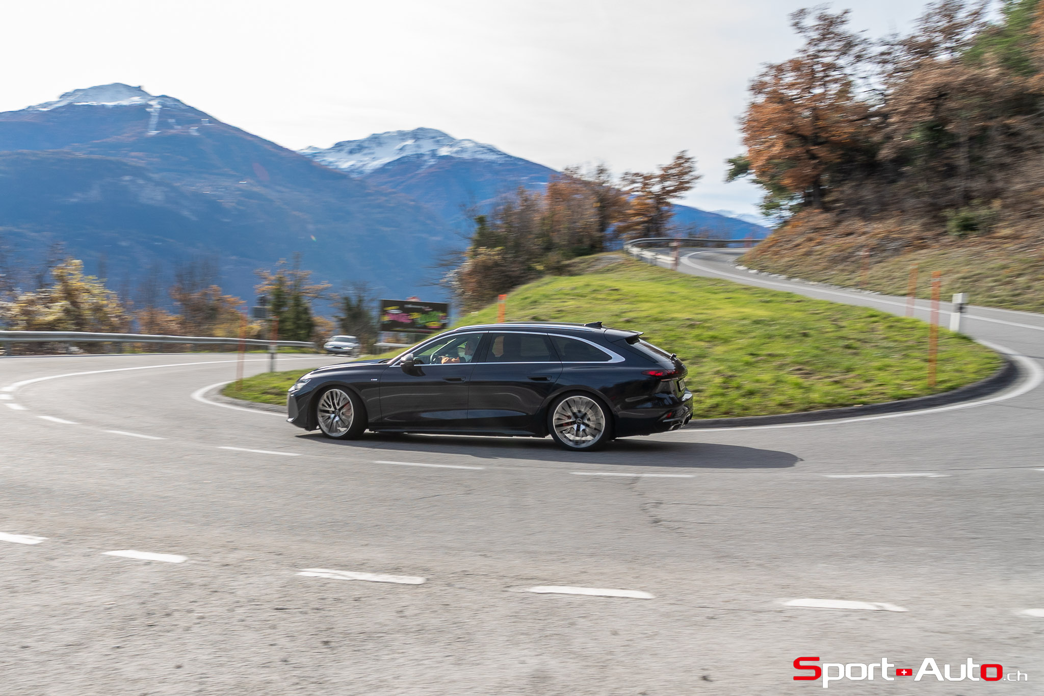 Grâce aux efforts des ingénieurs Audi sur l’hybridation légère et l’aérodynamisme, la nouvelle A6 sait se montrer sobre : nous avons mesuré une consommation moyenne de 7.9l/100km sur autoroute, et 8.3l/100km sur routes secondaires. Celles-ci nous mènent à présent au « Chuenisbärgli » près d’Adelboden, un endroit mythique du ski alpin suisse. C’est sur ce flanc de montagne que se situe l’une des pistes de slalom les plus difficiles du championnat du monde. Lorsque la neige ne le recouvre pas, on y retrouve des petites routes étroites sinueuses. Voyons à présent comment l’A6 Avant s‘y comporte !