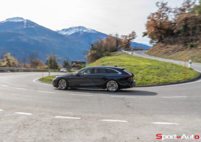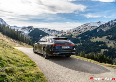 La nouvelle génération de ce grand break (4.94 m de longueur) mise sur un design moderne et élégant, privilégiant la fluidité des lignes. Sa silhouette aérodynamique génère un CX de seulement 0,25, un record sur sa lignée. Notre exemplaire, généreusement optionné, se pare de grandes jantes multirayons-S (CHF 4950.-) avec étriers de frein rouges (CHF 530.-), qui contrastent bien avec la discrète teinte métallisée « bleu firmament » (CHF 1370.-).