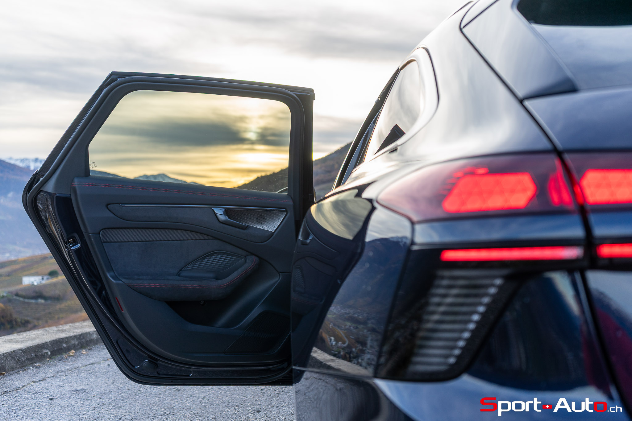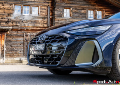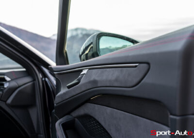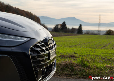 On retrouve sur la face avant de notre modèle, équipé du pack extérieur S line (CHF 1490.-), de larges prises d’air avec évents latéraux qui redirigent l’air vers les roues. Au centre trône un élégant logo Audi blanc en relief, et non pas plastiqué comme sur l’actuelle RS3. Quelques capteurs et senseurs greffés asymétriquement dans la calandre rendent l’apparence à l’avant légèrement moins « propre » qu’une SQ8 par exemple. Tout comme cette dernière, les signatures lumineuses des phares avant et arrière peuvent être personnalisées. À noter également qu’on retrouve ici de vraies sorties d’échappement, et non factices comme sur l’ancienne génération.