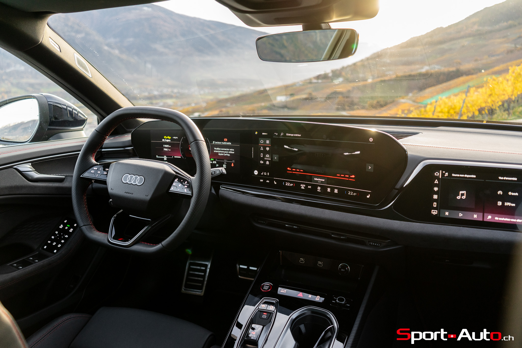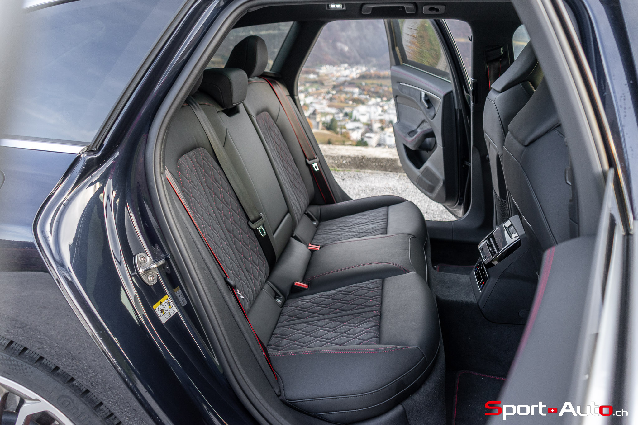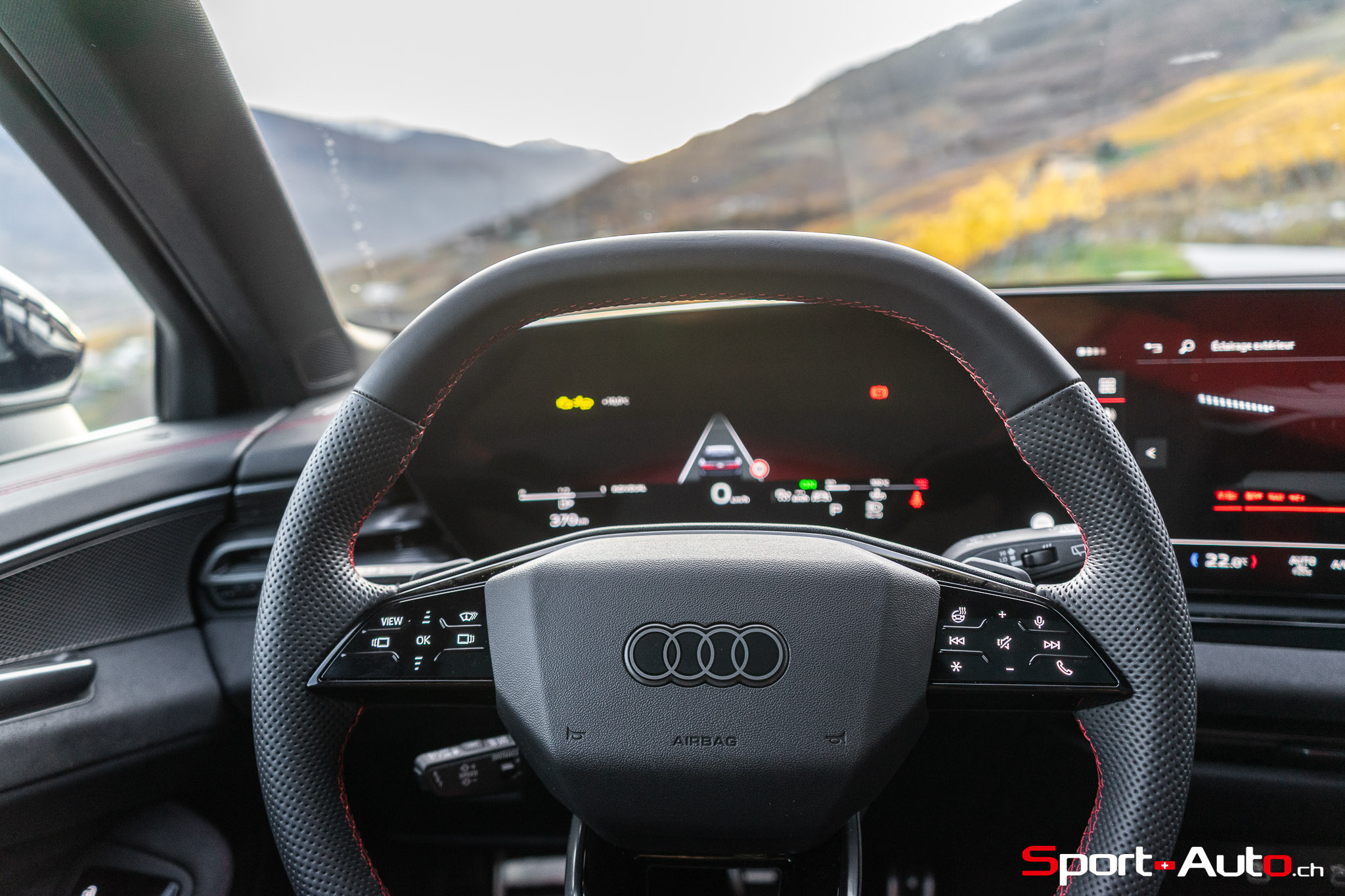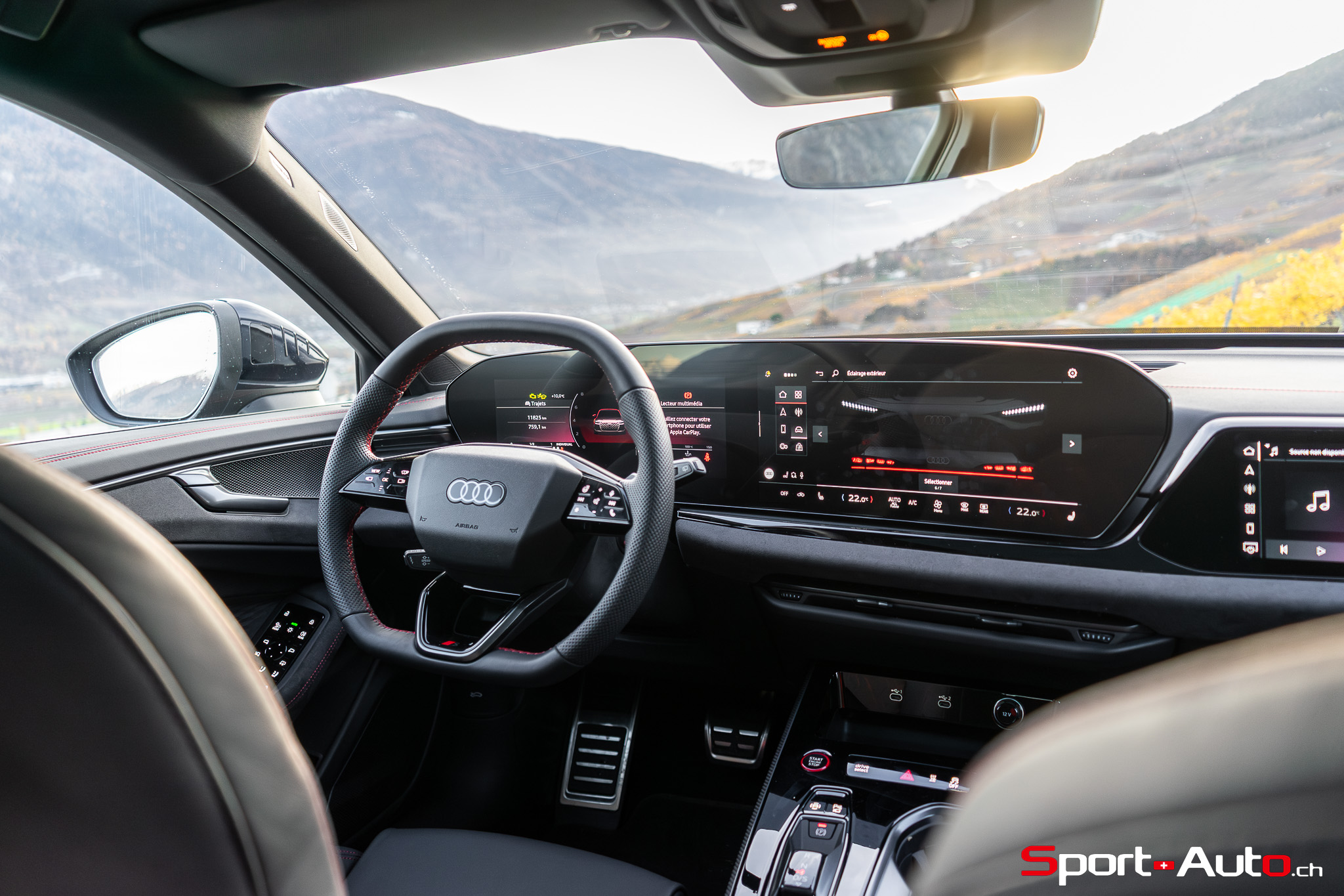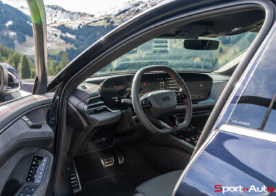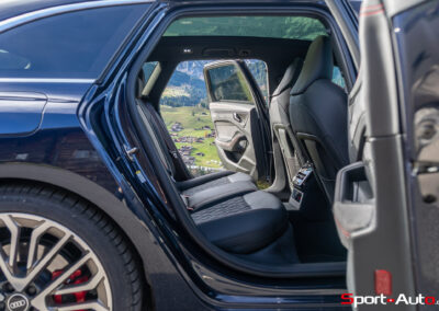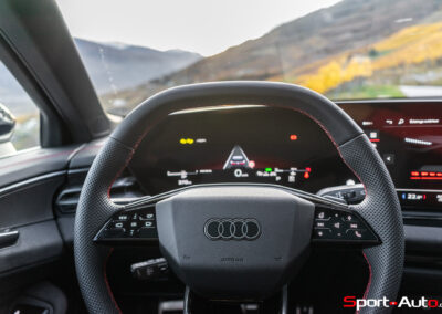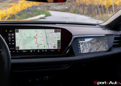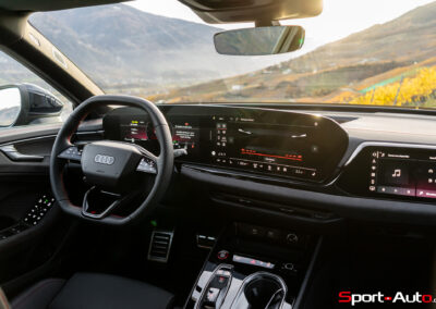 Sans surprise, l’habitacle est spacieux et offre un espace généreux aux passagers arrière notamment. On dispose ici de l’intérieur S Dinamica/cuir (CHF 3230.-), dont les accents en « rouge express » réduisent l’austérité de l’habitacle de notre modèle. Pour ceux qui recherchent plus de gaité, pas de soucis : Audi offre plusieurs teintes de cuir à choix, dont le brun ou beige. La qualité des matériaux est bonne et le mobilier robuste : le socle de la dalle de l’écran principal ne bouge et craque pas. On retrouve ici un écran passager tactile de 10,9 pouces compris dans le pack « Tech Pro » en option (CHF 2630.-).