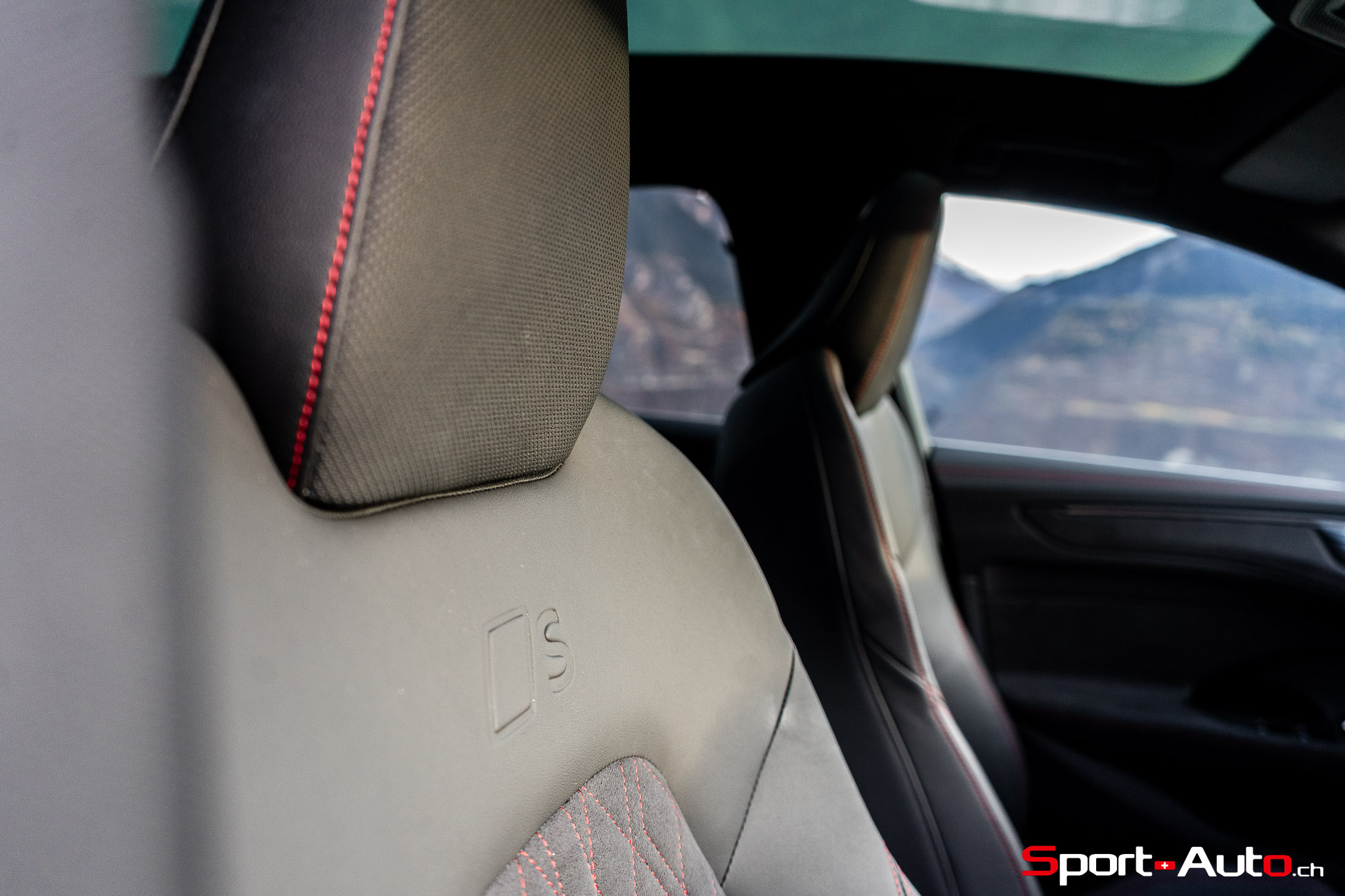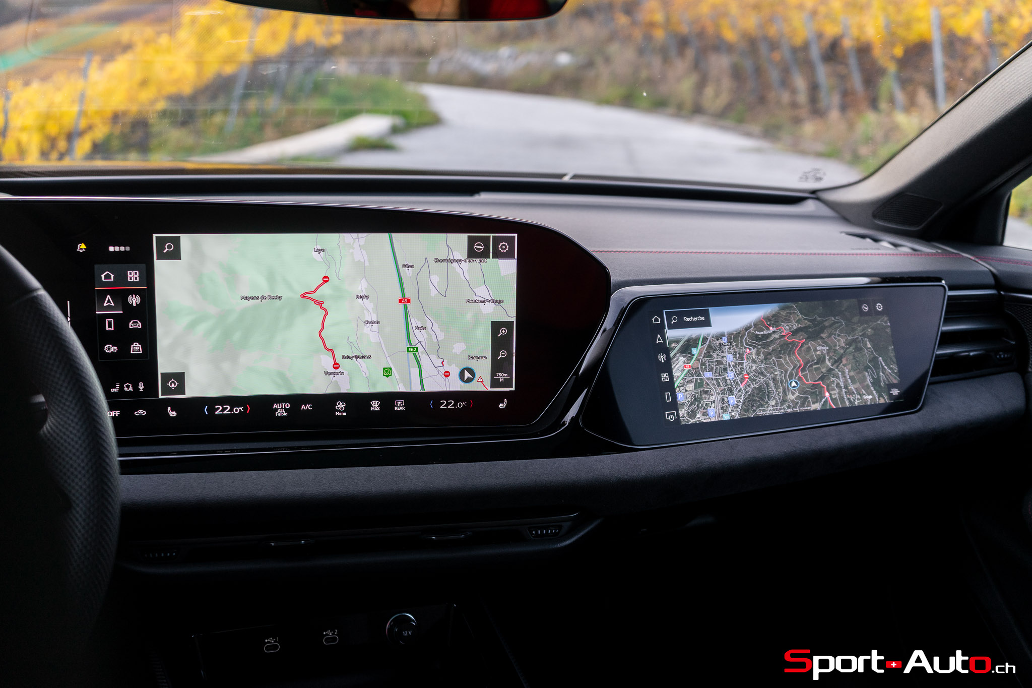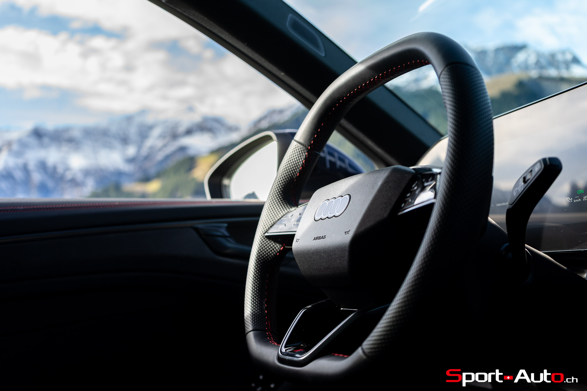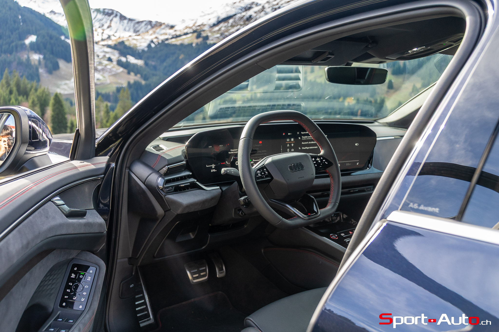 Sans surprise, l’habitacle est spacieux et offre un espace généreux aux passagers arrière notamment. On dispose ici de l’intérieur S Dinamica/cuir (CHF 3230.-), dont les accents en « rouge express » réduisent l’austérité de l’habitacle de notre modèle. Pour ceux qui recherchent plus de gaité, pas de soucis : Audi offre plusieurs teintes de cuir à choix, dont le brun ou beige. La qualité des matériaux est bonne et le mobilier robuste : le socle de la dalle de l’écran principal ne bouge et craque pas. On retrouve ici un écran passager tactile de 10,9 pouces compris dans le pack « Tech Pro » en option (CHF 2630.-).