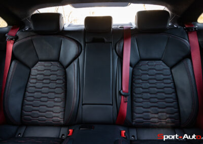 Lorsqu’on ouvre la porte, la voiture s’élève de plus de 50 mm pour faciliter l’accès à bord. Oui, parce qu’Audi soigne ses occupants en les accueillant dans de beaux sièges baquets aux réglages multiples, chauffants, ventilés et même massants. On s’installe en prenant soin d’éviter le montant de porte et le toit qui sont relativement bas. Une fois à l’intérieur, le regard se dépose sur un tableau de bord, une console centrale et des panneaux de portes aux finitions impeccables. Du cuir, des surpiqûres rouges, du carbone camouflage et de l’alcantara sont autant de matériaux à la hauteur de la réputation d’Audi en la matière. La qualité perçue est excellente et les assemblages aux petits oignons.