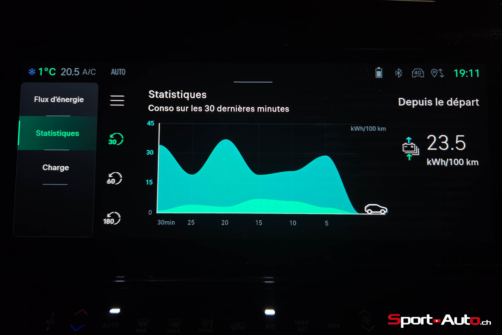 La consommation relevée est de 21,9 kWh/100 km sur les 1092 km du test, soit 38 % de plus que la consommation WLTP. Il faut toutefois pondérer ce résultat par le fait que même avec une météo optimale, la consommation WLTP ne peut être atteinte qu’en ayant une conduite anticipative, sans exploiter toute la puissance du véhicule et sans effectuer des arrêts photo avec phares allumés (ce qui n’est jamais le cas durant l’intégralité d’un essai de deux semaines). En appliquant la même conduite sur les mêmes itinéraires, la consommation de cet essai se serait probablement située autour des 19 kWh/100 km en été, soit une valeur environ 15 % inférieure (selon les écarts généralement observés avec les valeurs WLTP durant nos essais).
