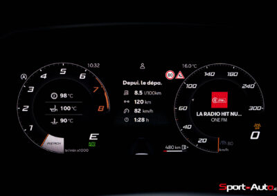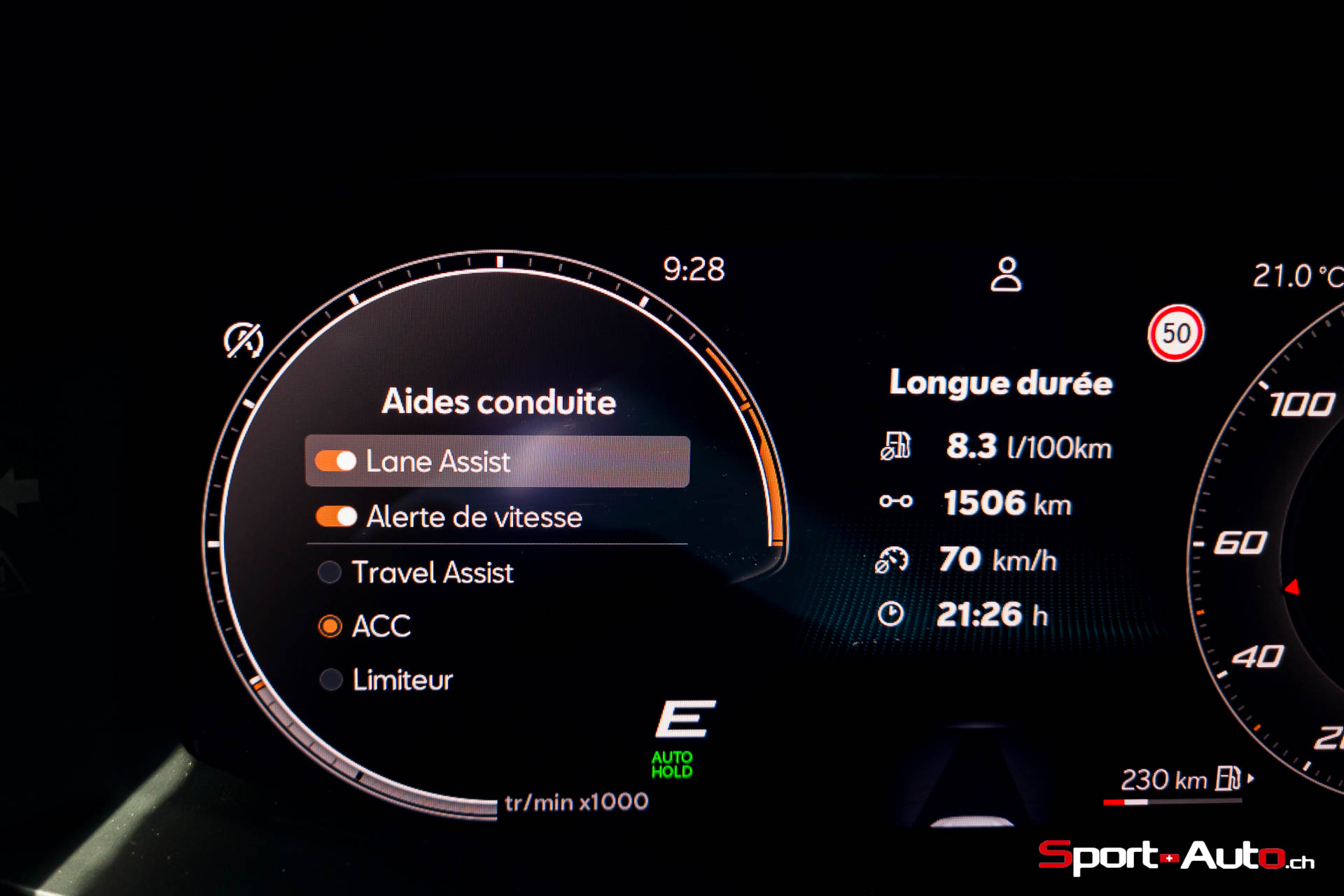 Si ce dispositif révolutionne positivement le comportement de la voiture, on peut regretter que la direction manque toujours de feeling et que la sonorité fasse appel à des haut-parleurs en mode Cupra. Pour n’entendre que les notes de l’échappement à clapet actif, il est toutefois possible de régler le son moteur sur « Pure » dans le mode de conduite Individuel, lequel permet aussi de paramétrer la dureté des excellentes suspensions pilotées DCC sur 15 niveaux.