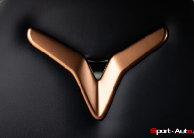 La face avant est réalisée en deux couleurs, Tavascan Blue metallic pour la couleur carrosserie (CHF 1’200.-) et noir brillant. Les surfaces noires sont agrémentées d’engravures de forme triangulaire. Le triangle, parlons-en. C’est une forme que l’on retrouve un peu partout sur et dans la voiture. Il s’agit justement de la signature de la marque.