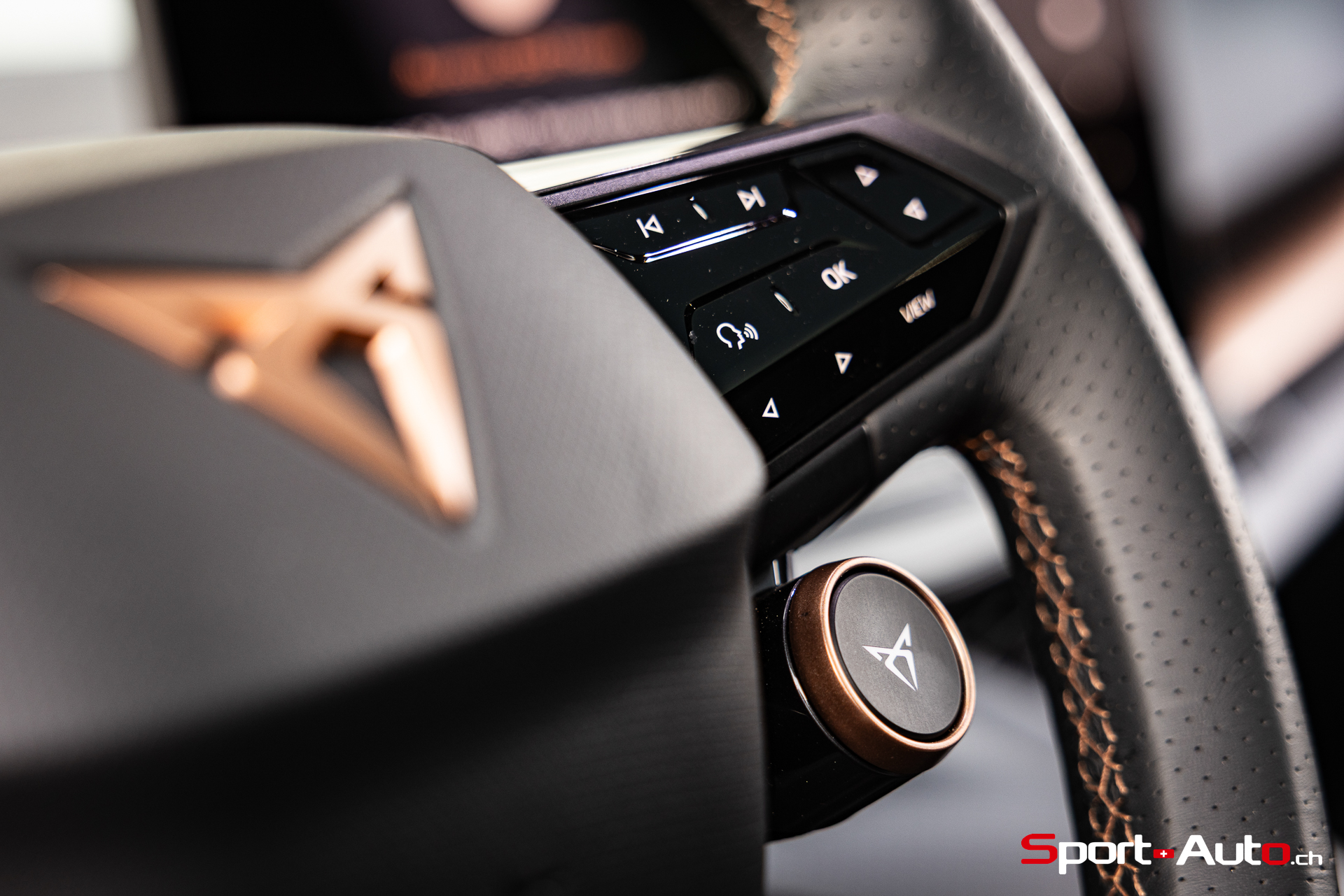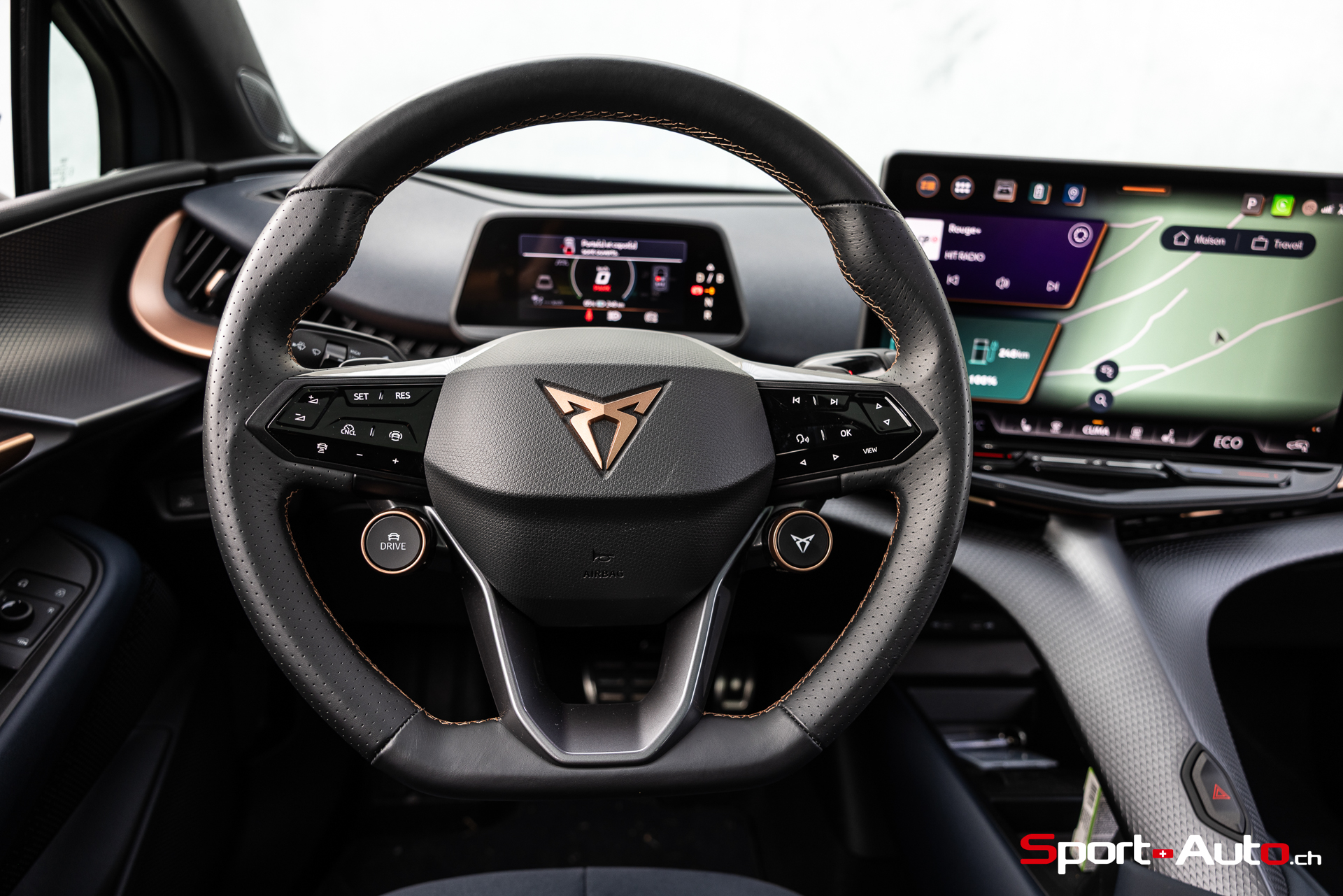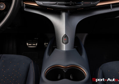 On s’installe dans de confortables sièges revêtus d’un tissu à l’aspect d’Alcantara avec de petites perforations triangulaires et des surpiqures cuivrées. Nos yeux sont attirés par l’écran central d’infodivertissement de 15 pouces qui semble rapporté à l’habitacle. Le volant à méplat (bas) dispose de nombreux boutons tactiles donc la manipulation est toujours aussi peu pratique. On retrouve également les boutons Drive et Cupra déjà présents sur la Born. Ceux-ci permettent d’accéder rapidement aux modes de conduite disponibles (Range, Comfort, Performance, Cupra, Individual et Traction).