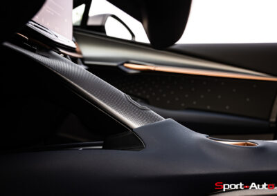 Entre les sièges, on retrouve “la colonne vertébrale de l’habitacle”, sorte d’arche en forme de Y à la structure de type écailles. Cet élément de style est très présent entre les sièges conducteur et passager. Les occupants de la banquette arrière sont également soignés puisqu’ils bénéficient de sièges chauffants et même de 2 prises USB-C (également 2 USB-C à l’avant) tout en profitant de la vue à travers le toit panoramique.