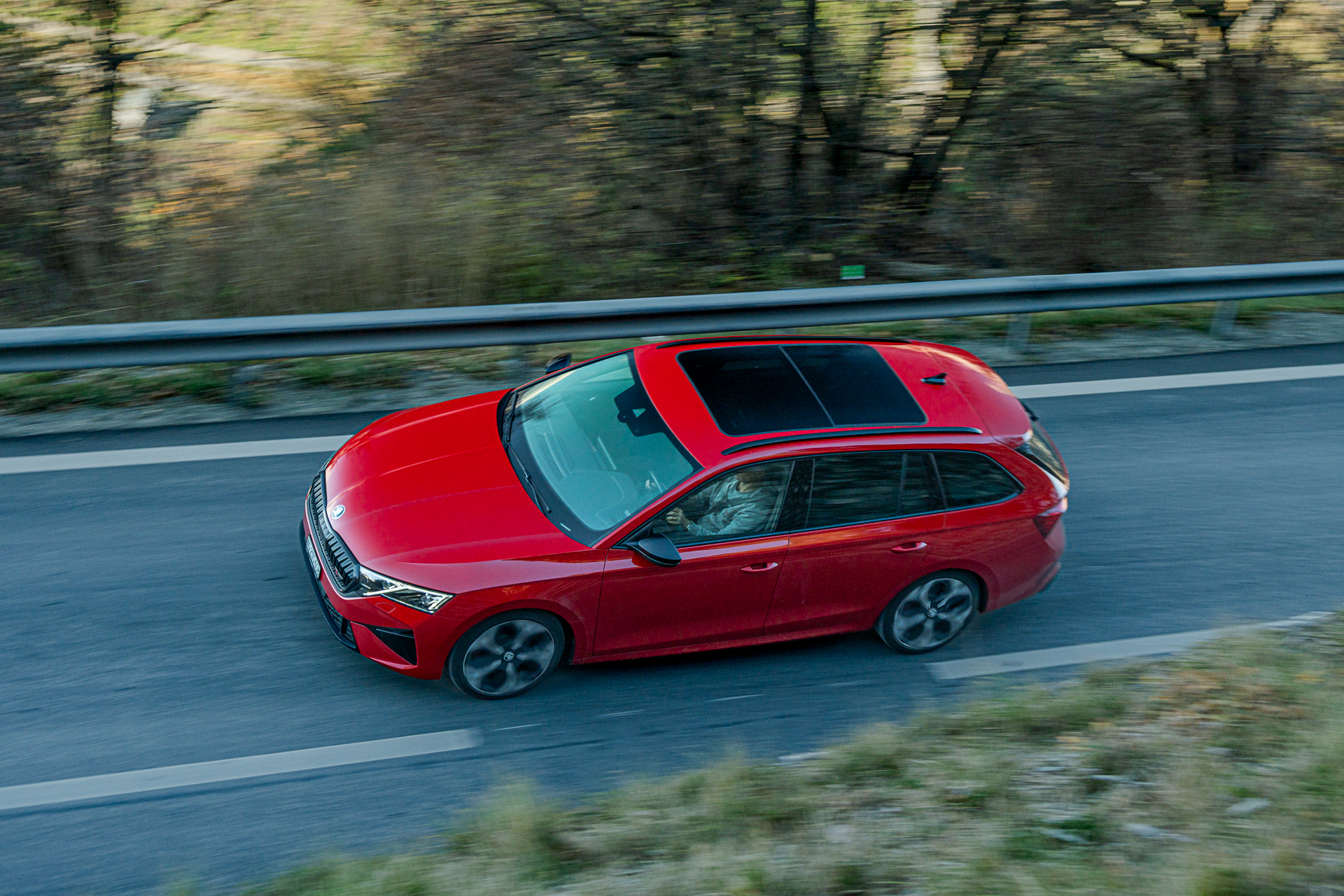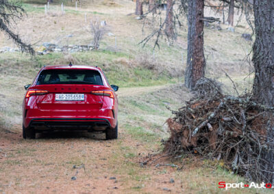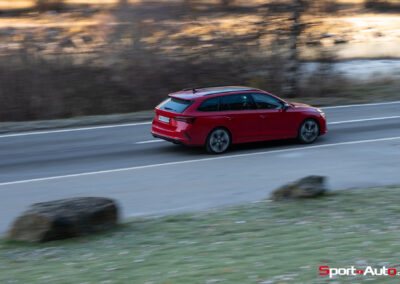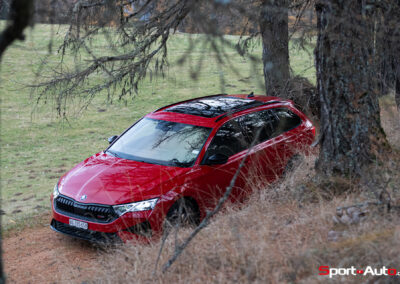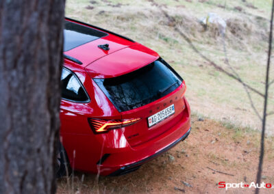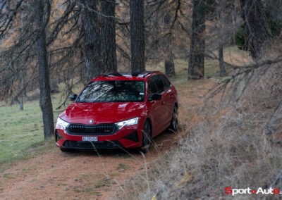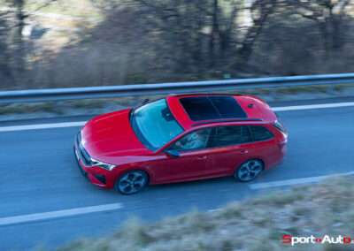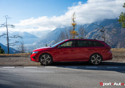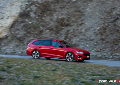 Les choses deviennent plus intéressantes dès que la route se resserre et commence à serpenter. En direction de la montagne, sur route sèche, l’Octavia RS dévoile un bel équilibre. La direction est précise, le train avant accroche bien et le châssis encaisse le rythme sans broncher. La voiture reste saine, prévisible, jamais piégeuse. On sent que ce break sportif a été conçu pour avaler ce genre de tracés, avec une efficacité qui donne envie d’insister.