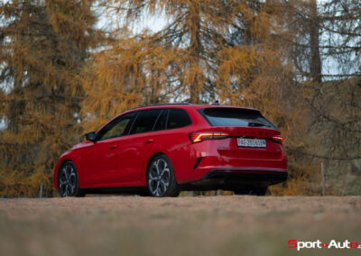 À l’arrière, l’évolution est encore plus timide : feux légèrement retravaillés, diffuseur subtilement redessiné, mais une silhouette strictement identique à celle de la génération précédente. Si cette retenue confère à l’Octavia RS Combi une élégance intemporelle et un excellent vieillissement, elle pourra aussi décevoir ceux qui espéraient un vrai saut stylistique. À force de vouloir rester discrète, la RS finit presque par diluer son identité sportive et se confondre avec les versions plus sages.