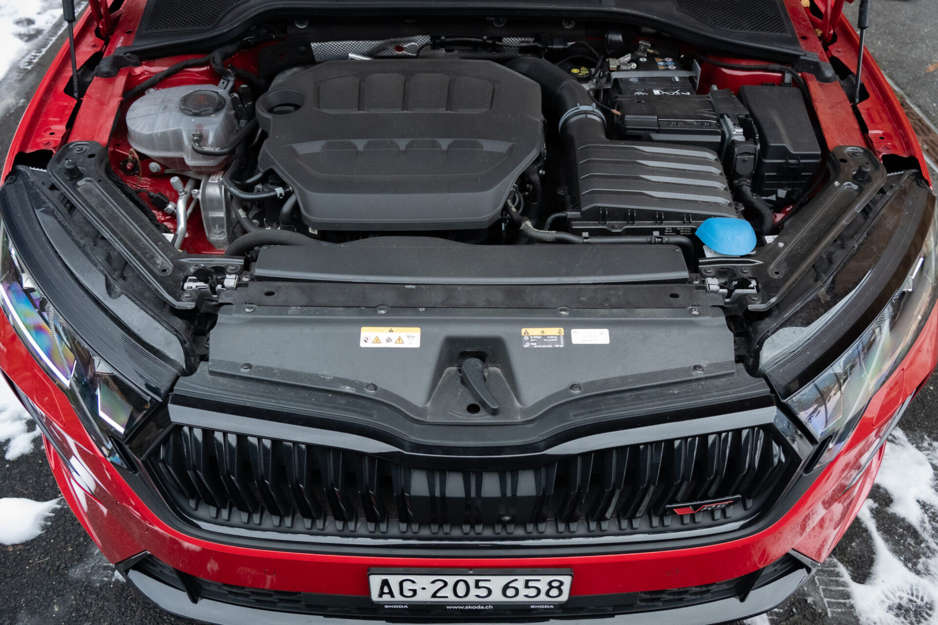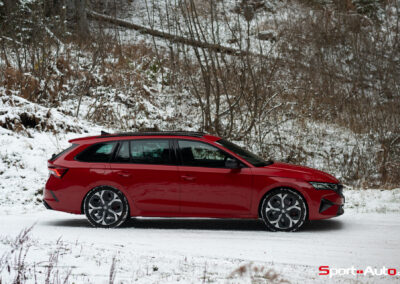 Là, l’expérience se complique nettement, au point de devenir presque désagréable. Sur chaussée enneigée, malgré une monte hivernale, la motricité montre rapidement ses limites. En montée comme en sortie de virage, le train avant patine, cherche son adhérence et impose une anticipation constante et une gestion très mesurée de l’accélérateur. L’Octavia RS reste exploitable, mais elle ne pardonne pas l’optimisme. Dans ces conditions, l’absence de traction intégrale se fait clairement sentir, surtout pour un modèle historiquement associé à l’hiver suisse.
