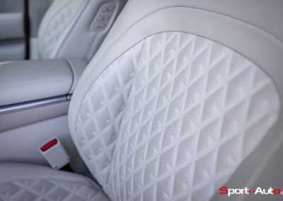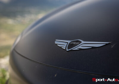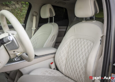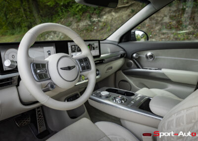 Lorsqu’on prend la route, on apprécie le confort général qu’offre la GV60. Bien installés dans les sièges gainés de cuir perforé, on est presque invités à « cruiser » sur les routes plutôt que d’attaquer le parcours à vive allure. En effet, les performances sont remarquables avec un 0-100 km/h en 4.0 secondes et une vitesse de pointe de 235 km/h mais le comportement général de la Genesis n’est pas vraiment sportif.