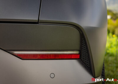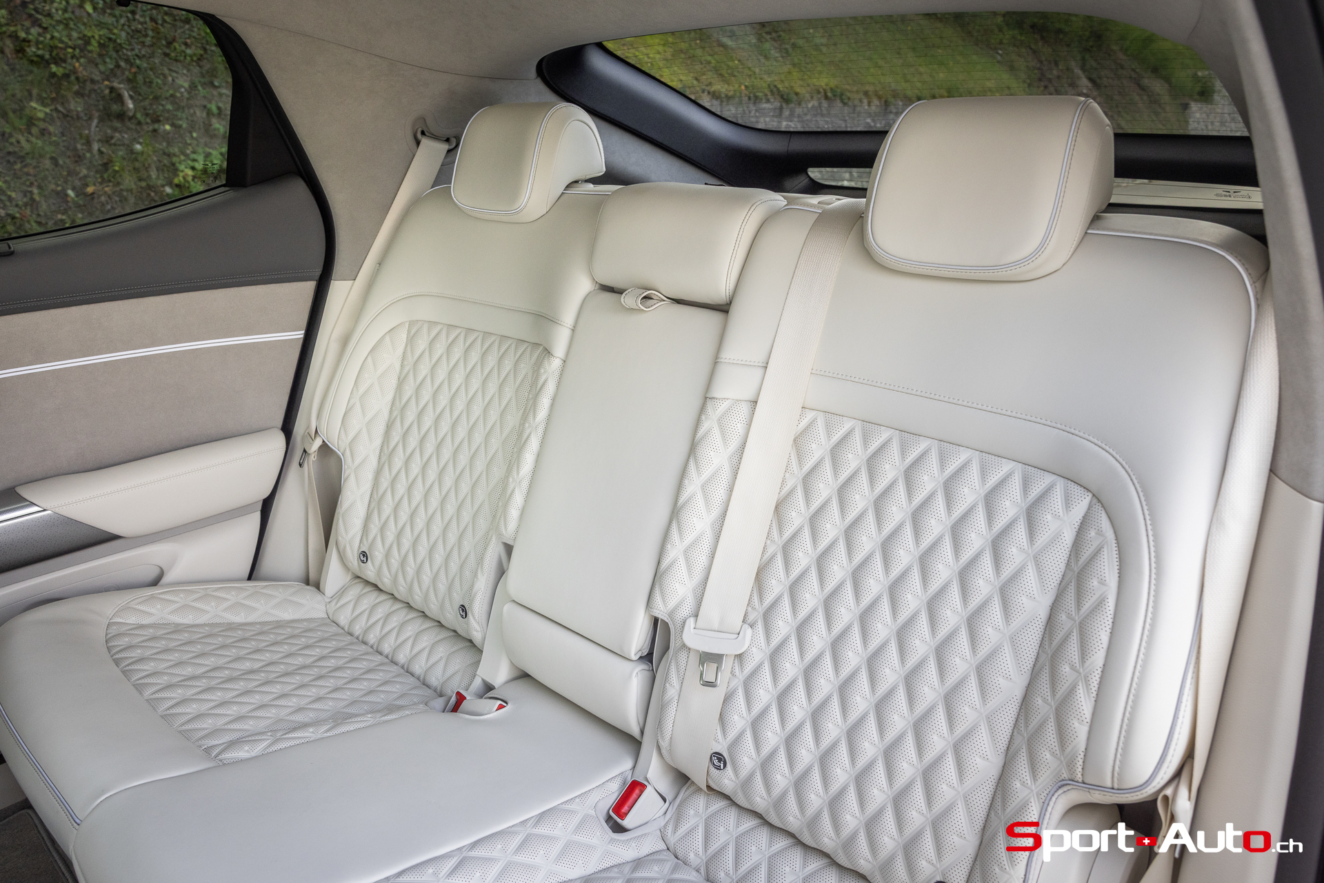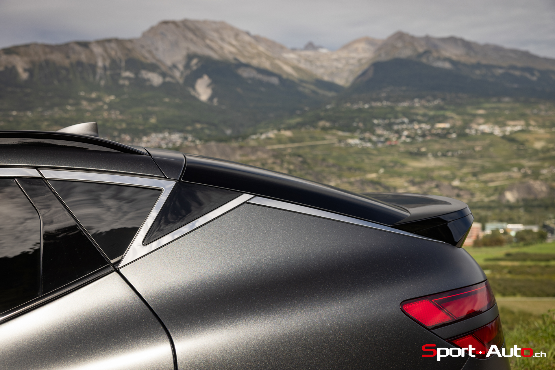A l’avant comme à l’arrière, on remarque la présence d’optiques en deux parties superposées, ce qui fait d’ailleurs partie de la signature lumineuse de la marque. Un aileron massif surplombe la malle arrière. Le tout repose sur des jantes de 21’’ et des pneus en 255/40 R21 à travers lesquels on aperçoit des étriers de freins jaune-vert acide.