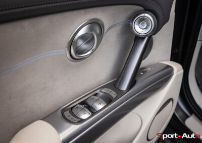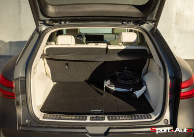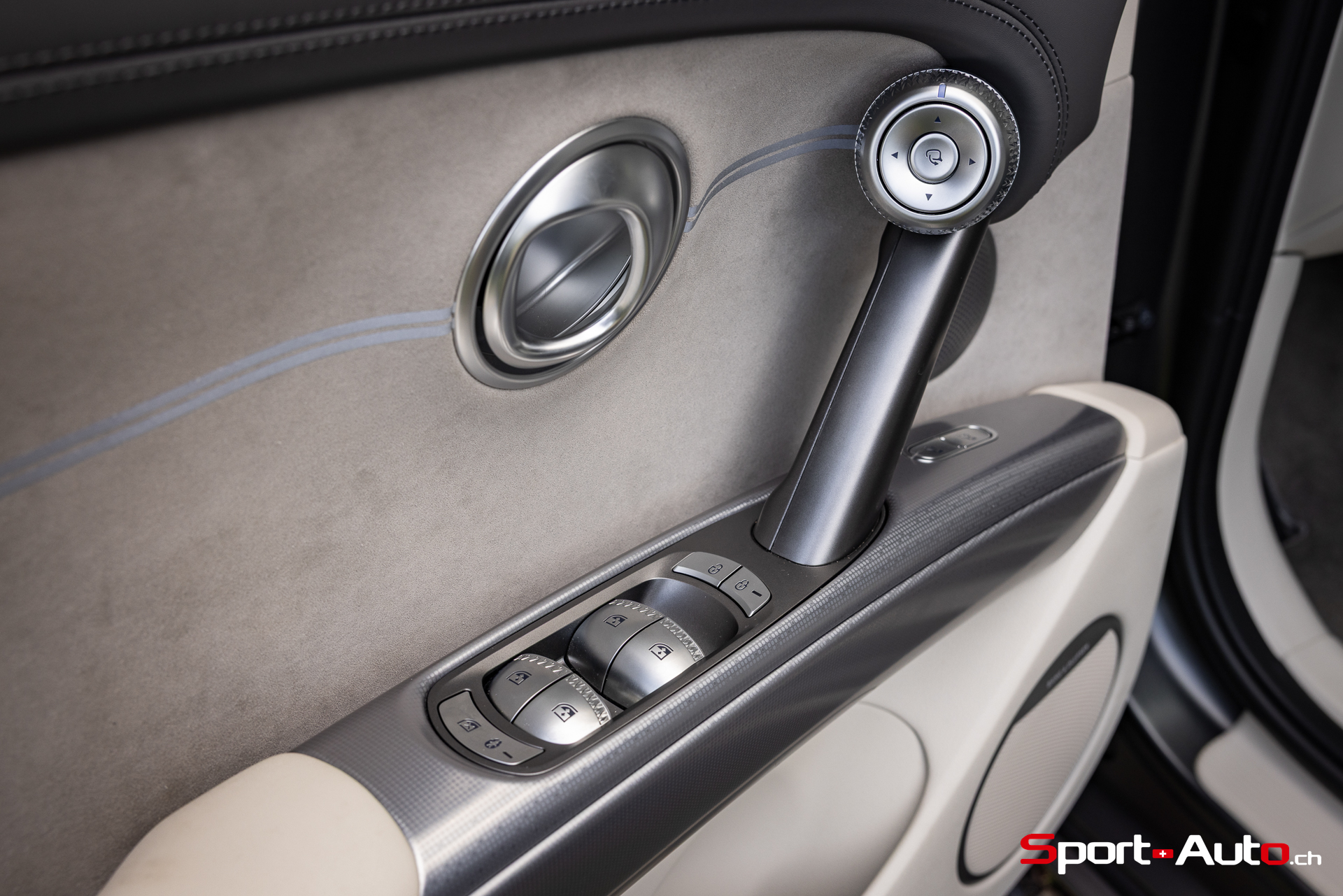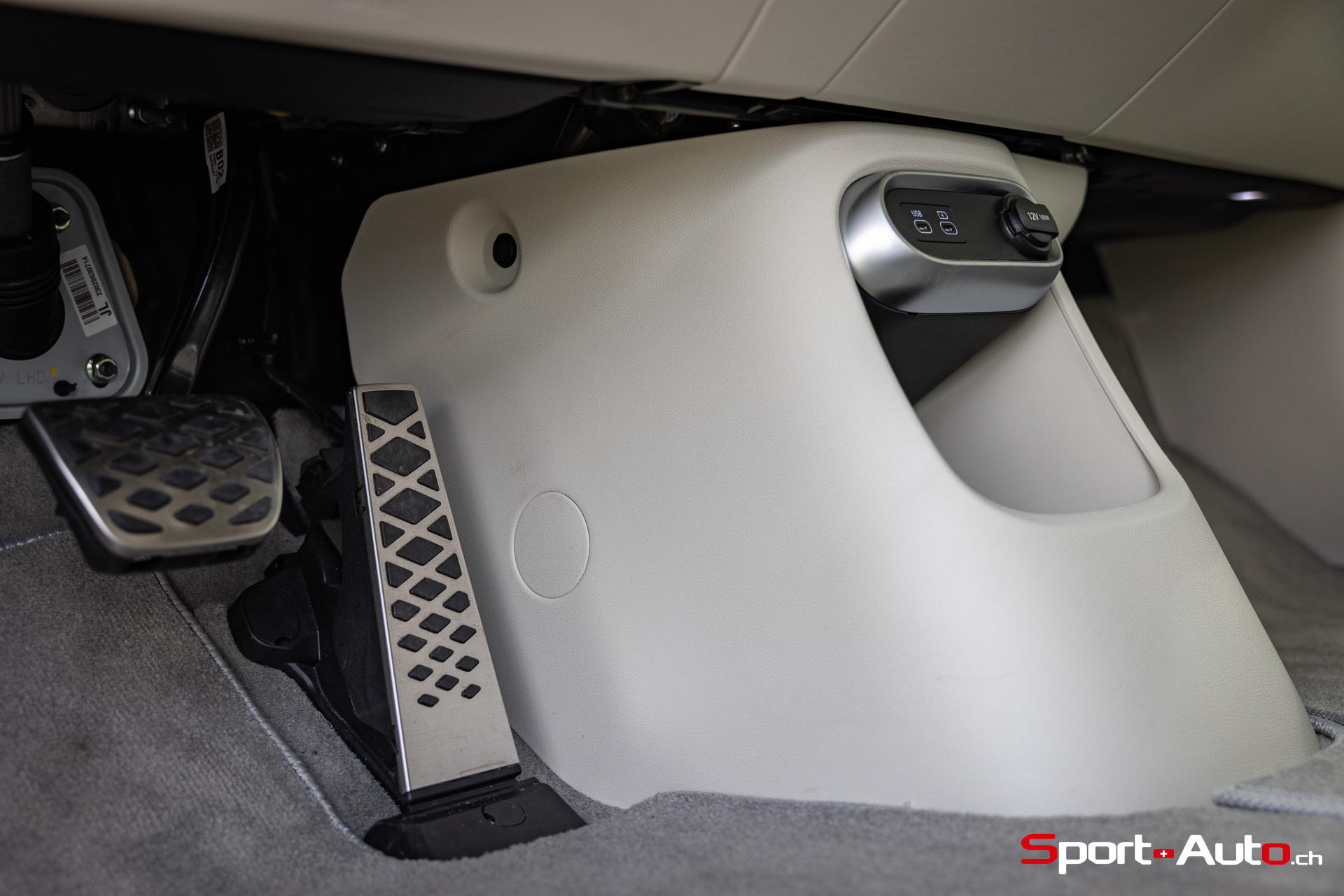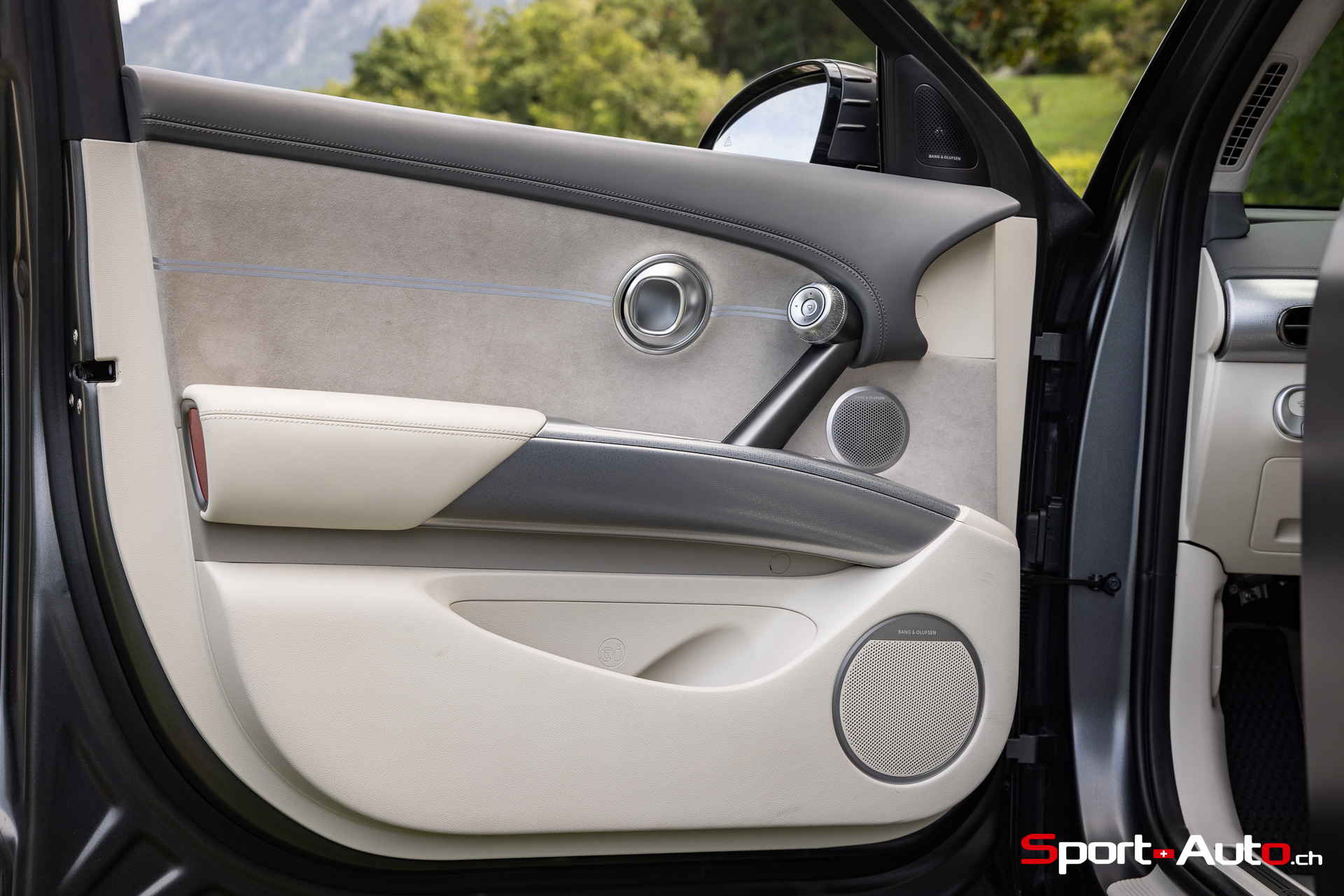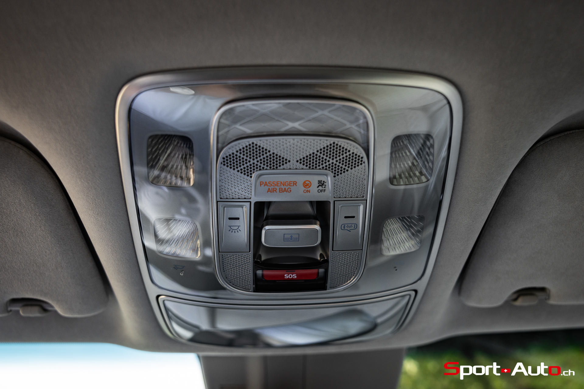 L’ambiance générale joue la carte de la sobriété technologique, agrémentée par des matériaux de qualité, agréables au toucher et des ajustements soignés. Les teintes claires des revêtements en cuir, alcantara et aluminium sont baignées de lumière provenant des vitres latérales mais aussi du toit panoramique, rendant l’ensemble presque éblouissant suivant les conditions de lumière extérieure.