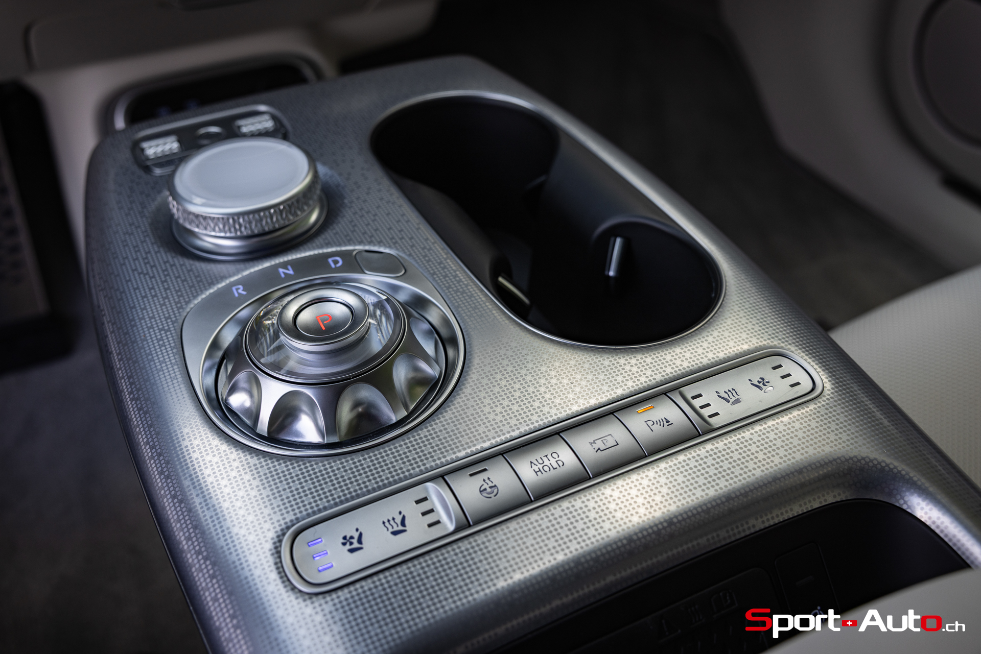 En ouvrant la voiture, on découvre un habitacle spacieux et bien agencé. La console centrale suspendue est l’un des éléments marquants : elle dégage visuellement le plancher tout en regroupant les principales commandes. On y trouve notamment un sélecteur de marche présenté sous forme d’un module sphérique rétroéclairé. Ce dernier pivote sur lui-même pour permettre de choisir les rapports (R, N, D, P). La couleur de l’éclairage d’ambiance, et donc de la sphère, varie en fonction du mode de conduite engagé.