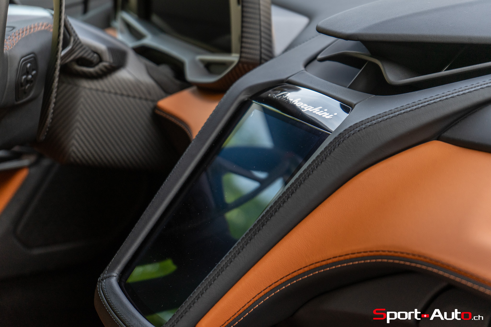 Effectivement, on retrouve un pot d’échappement central placé sur le haut de l’arrière, comme une moto GP, et les roues postérieures saillantes permettront aux voitures qui vous suivront d’examiner votre profil de pneus… ou ramasser vos gravillons, selon le contexte. Le moteur central arrière est partiellement visible depuis l’extérieur, contrairement aux Porsche 911 modernes. L’approche est cependant moins extrême que sa grande sœur, la Revuelto, dont le V12 est complètement apparent. Nous avions été parmi les premiers à le constater en janvier 2024, à l’occasion de l’évènement hivernal Lamborghini Academia Neve à Livigno en Italie. Nul doute que la Temerario sera également protagoniste pour les prochaines éditions de ces roulages sur glace, grâce à ses quatre roues motrices lui assurant une bonne motricité, même sur neige.