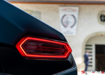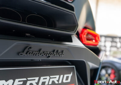 La foule se presse à présent autour de la Temerario et admire ses éléments stylistiques cachés de sa carrosserie, signée par le designer Mitja Borkert. Par exemple, on constate que les feux de route avant, horizontaux si on les regarde de face, deviennent en réalité des éléments aérodynamiques grâce à des prises d’air dotées de déflecteurs juste en dessous d’eux. Quant à la signature lumineuse des feux de jour, elle reprend l’une des formes géométriques typique du design Lamborghini : l’octogone. Elle est reprise dans les phares arrière également. En contrebas de ceux-ci, les radiateurs sont apparents. Vu de l’arrière, la Temerario propose une impression dynamique et athlétique d’un bel effet, de près comme de loin.