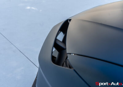 Passons à présent à l’intérieur du bolide. Sans surprise, les matériaux sont très qualitatifs. On retrouve sur cet exemplaire des sièges baquets, mais il est possible d’opter pour une autre variante plus confortable. Le cockpit a été pensé avec la philosophie “feel like a pilot”. Le conducteur et son passager sont assis très bas et disposent de trois écrans de bord (compte-tour derrière le volant, système multimédia au centre, et écran passager en option). Tout comme un jet de combat, un head up display sera disponible pour le conducteur… ou pilote selon le contexte.