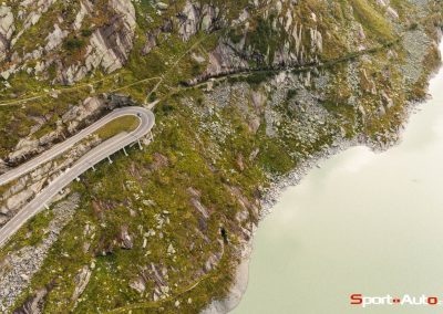La dernière partie de la montée – la plus belle – longe le lac du Grimsel avant de serpenter jusqu’au col. La route est toujours très large et plusieurs places de stationnement offrent une vue imprenable sur le lac. Parcourir ce tronçon est un régal pour tous les sens, en particulier à bord de voitures aussi performantes que la Maserati MC20 Cielo ou la Porsche 718 Spyder. Quoiqu’avec son V6 bi-turbo de 450 ch, l’Audi RS4 Avant, bien que plus civilisée, n’était pas en reste !