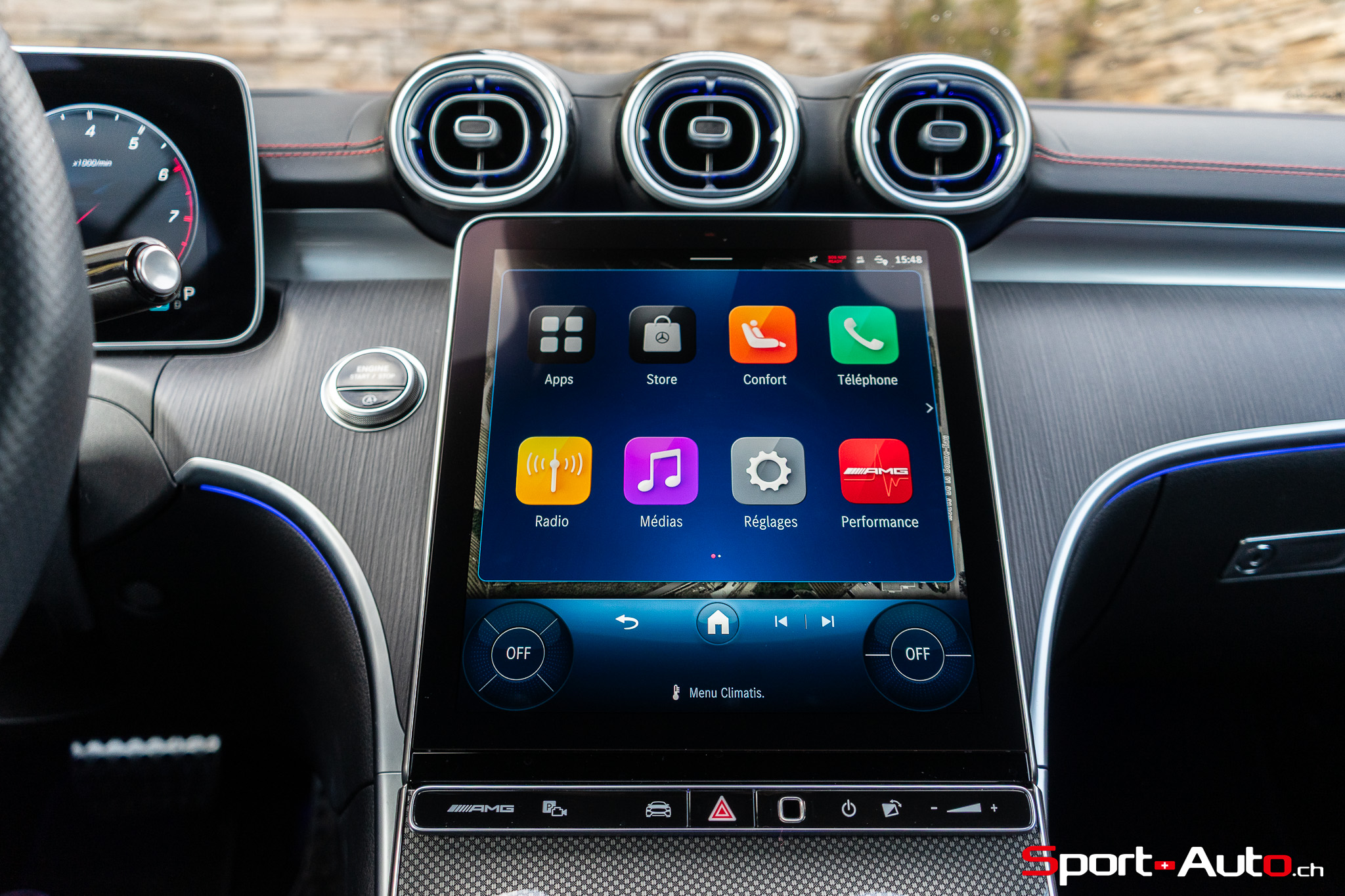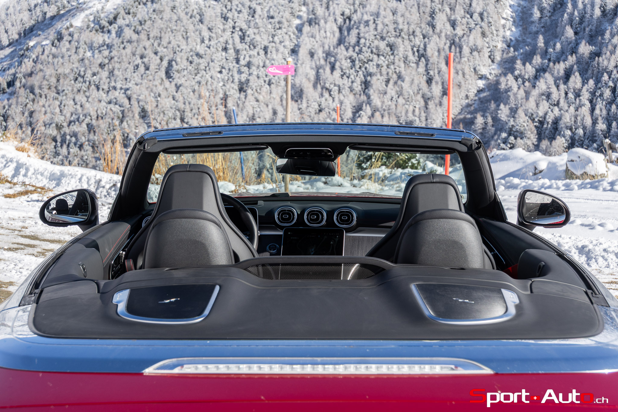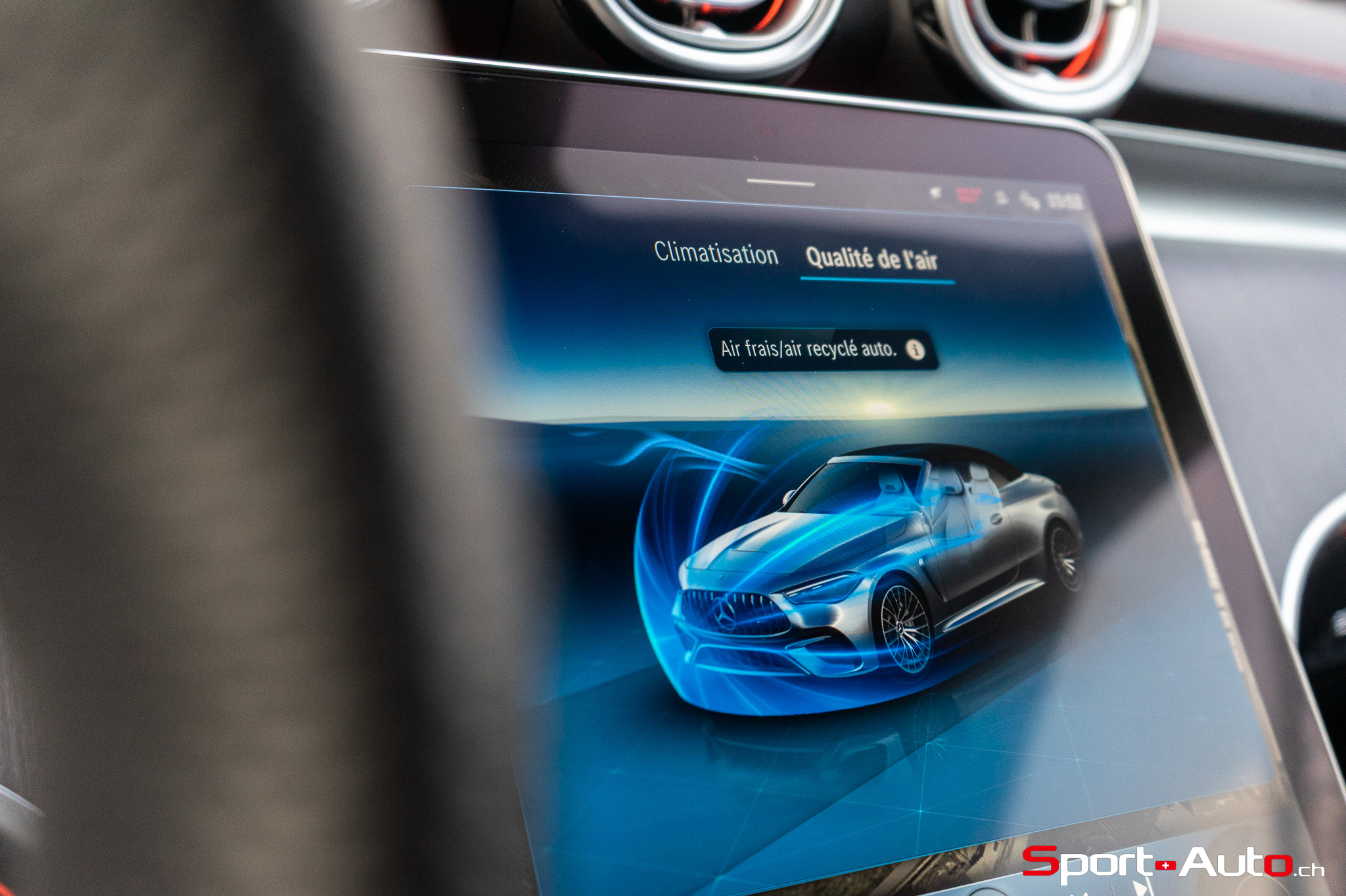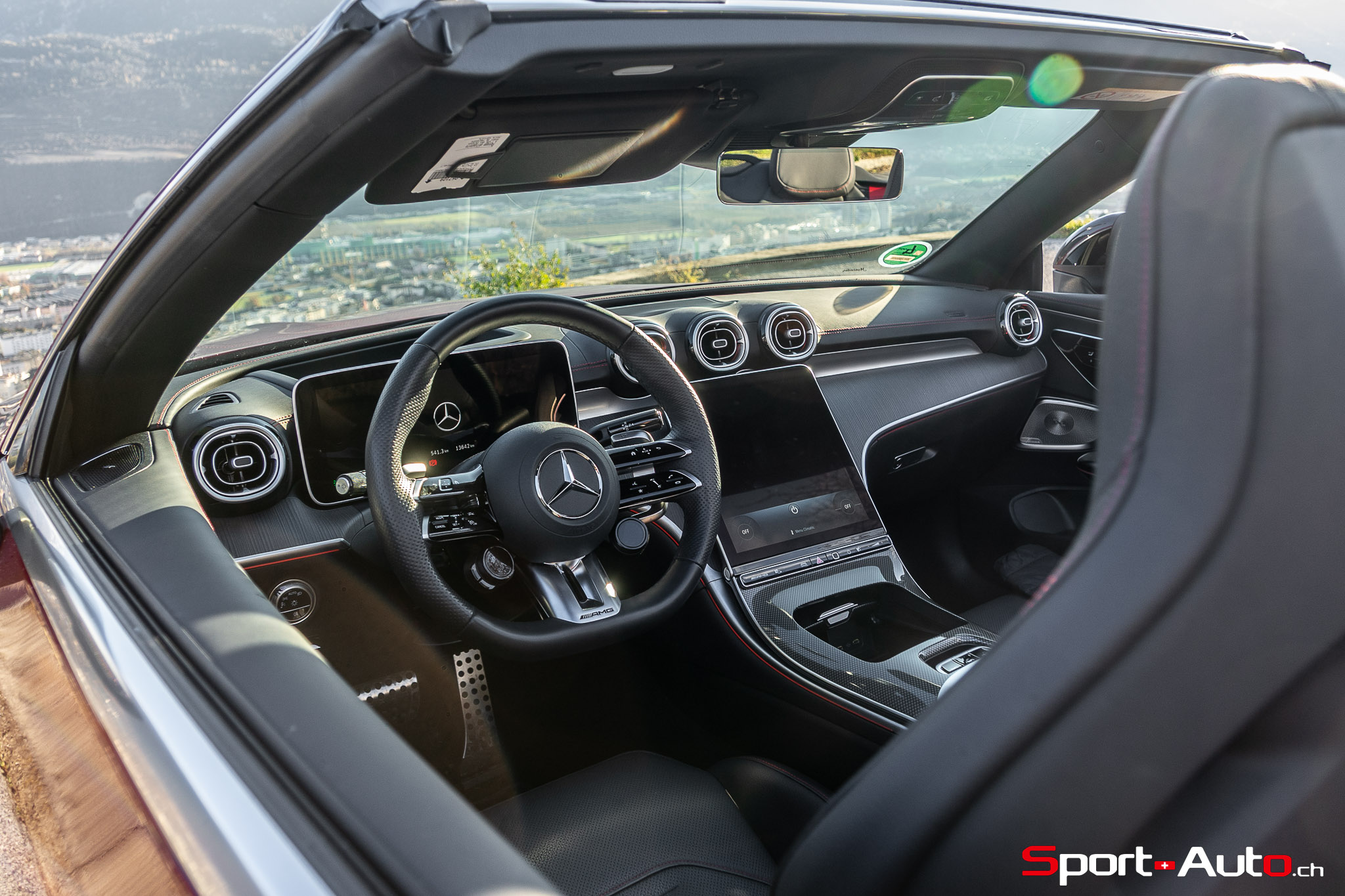 L’intérieur de la CLE 53 combine luxe et matériaux qualitatifs. Les cuirs ont été spécialement conçus pour être résistants à l’air libre, avec un revêtement spécial qui réfléchit les ondes infrarouges du soleil pour qu’ils ne deviennent pas brûlants l’été. A l’avant, on retrouve les excellents sièges Performance AMG enveloppants (compris dans le Pack Siège High-End Performance AMG, CHF 5212.-), quasi identiques à ceux de la C 63 S E Performance. Ils sont chauffants, mais il vous faudra encore cocher une case dans les options pour qu’ils soient climatisés (CHF 906.-). En revanche, les ceintures rouges et le chauffe nuque AIRSCARF sont fournies de série. Ce dernier permet de rouler décapoté sans problèmes, même à des températures avoisinant les – 10 degrés comme dans notre cas.