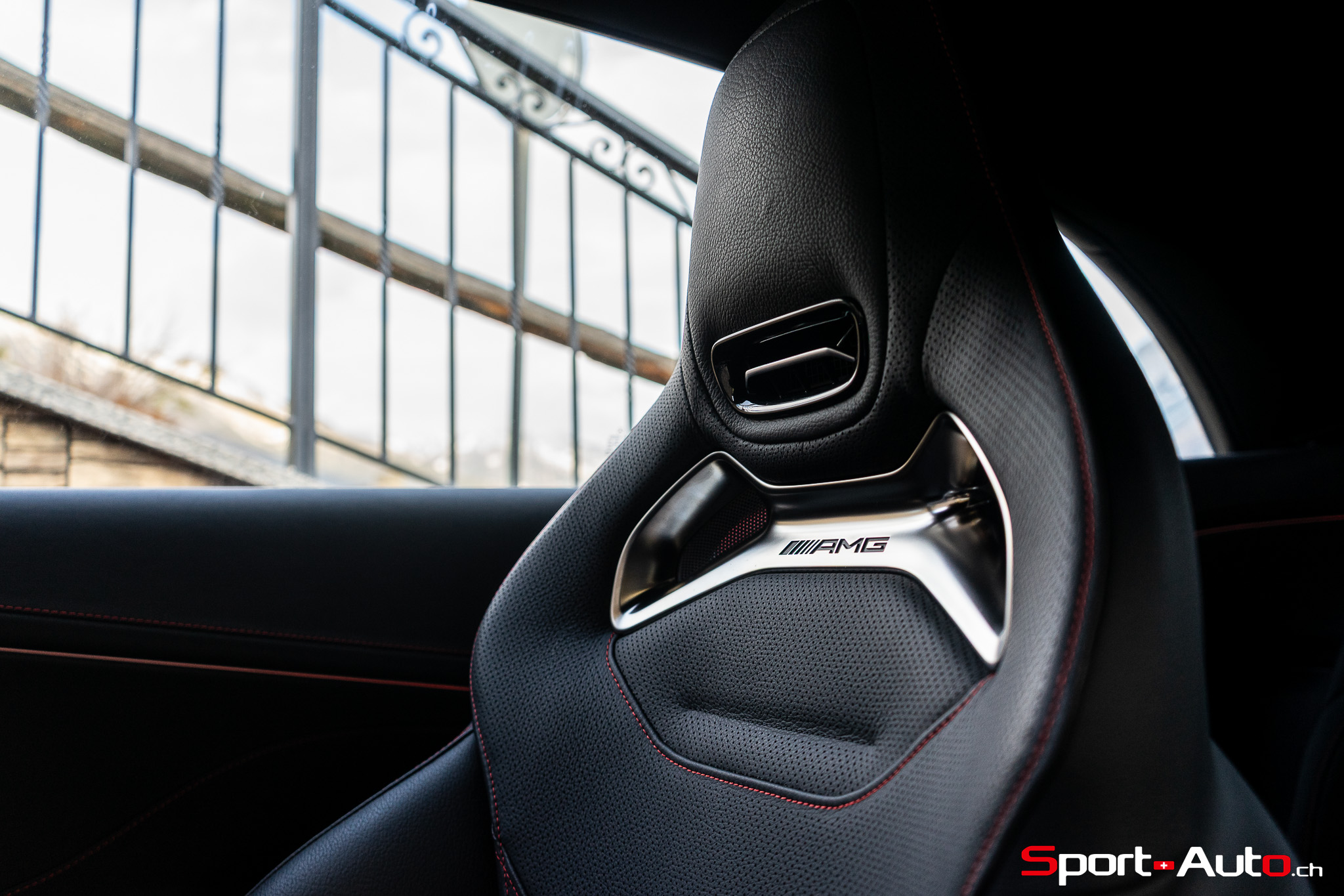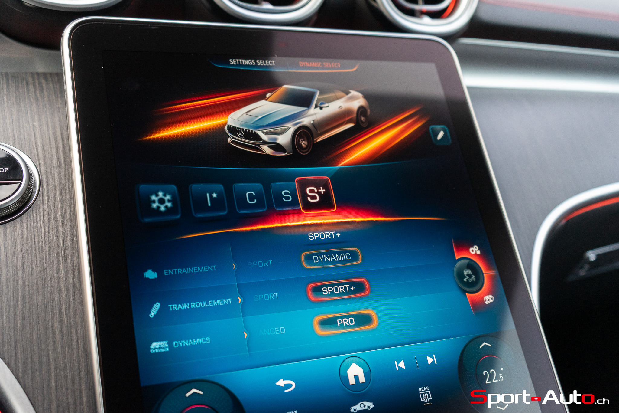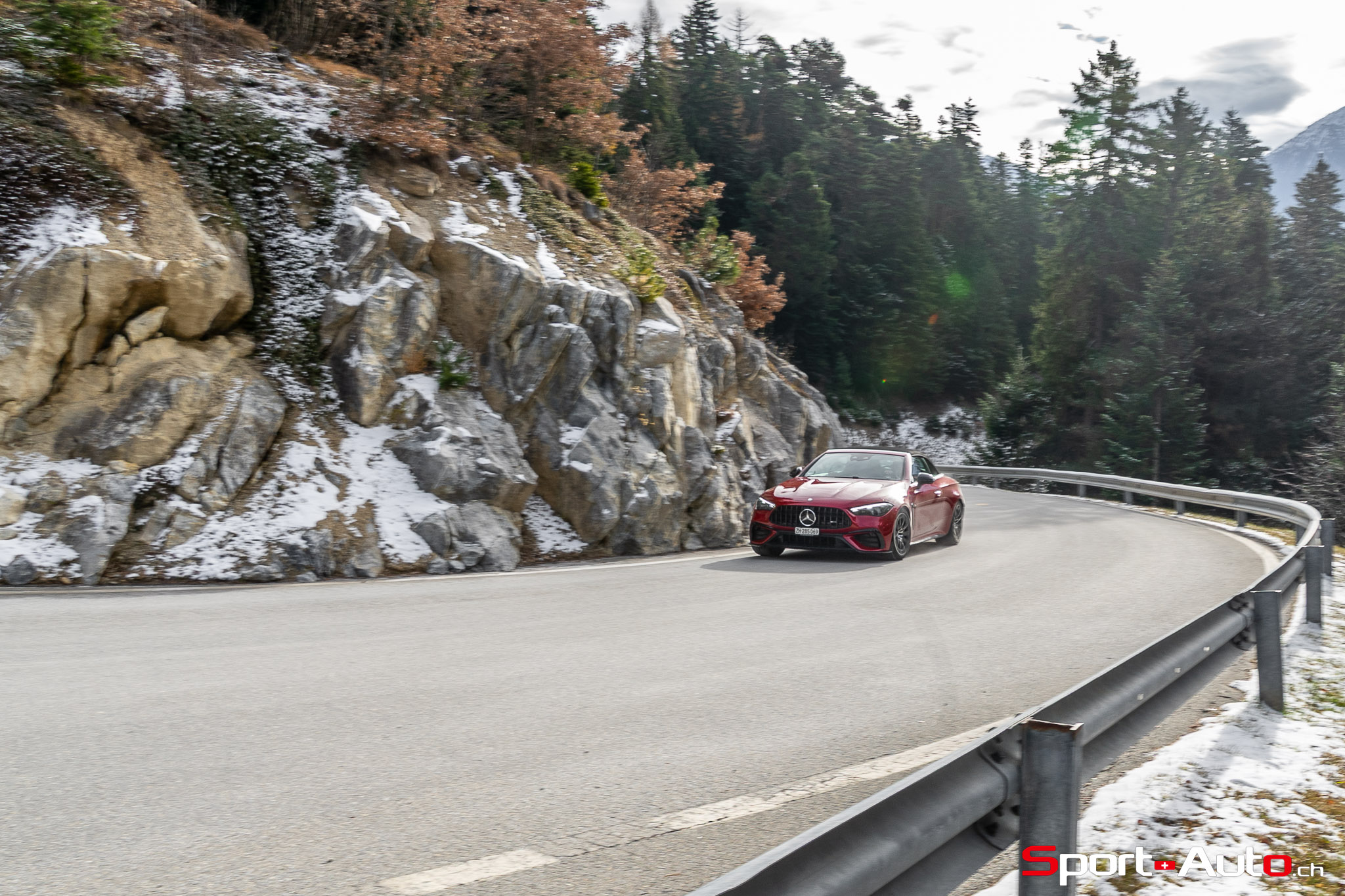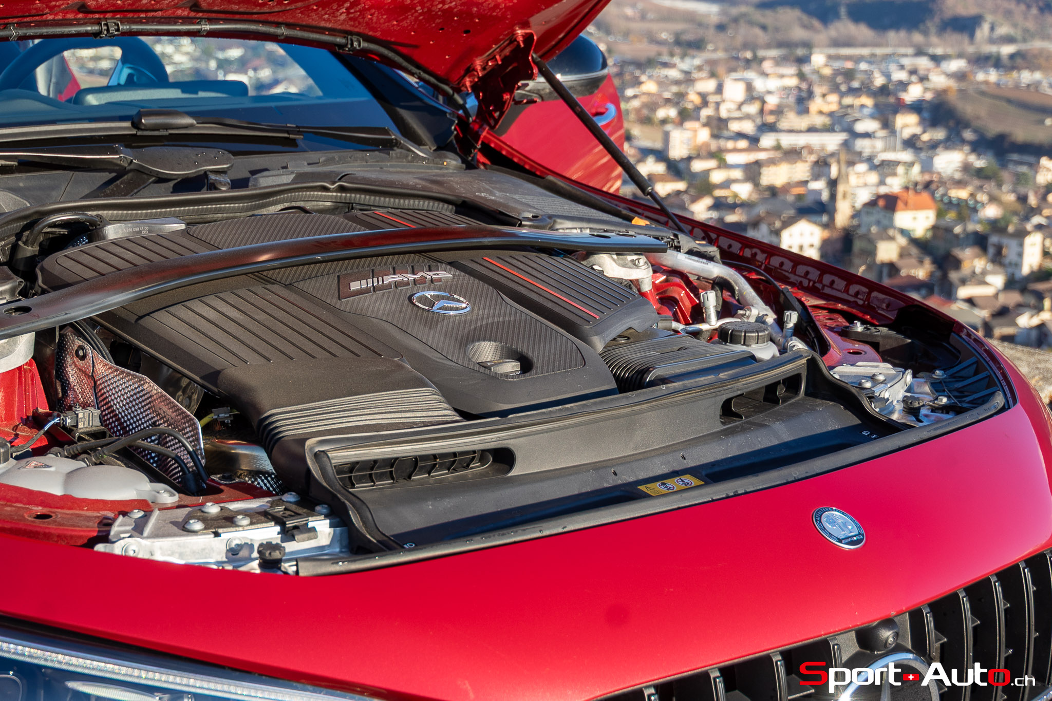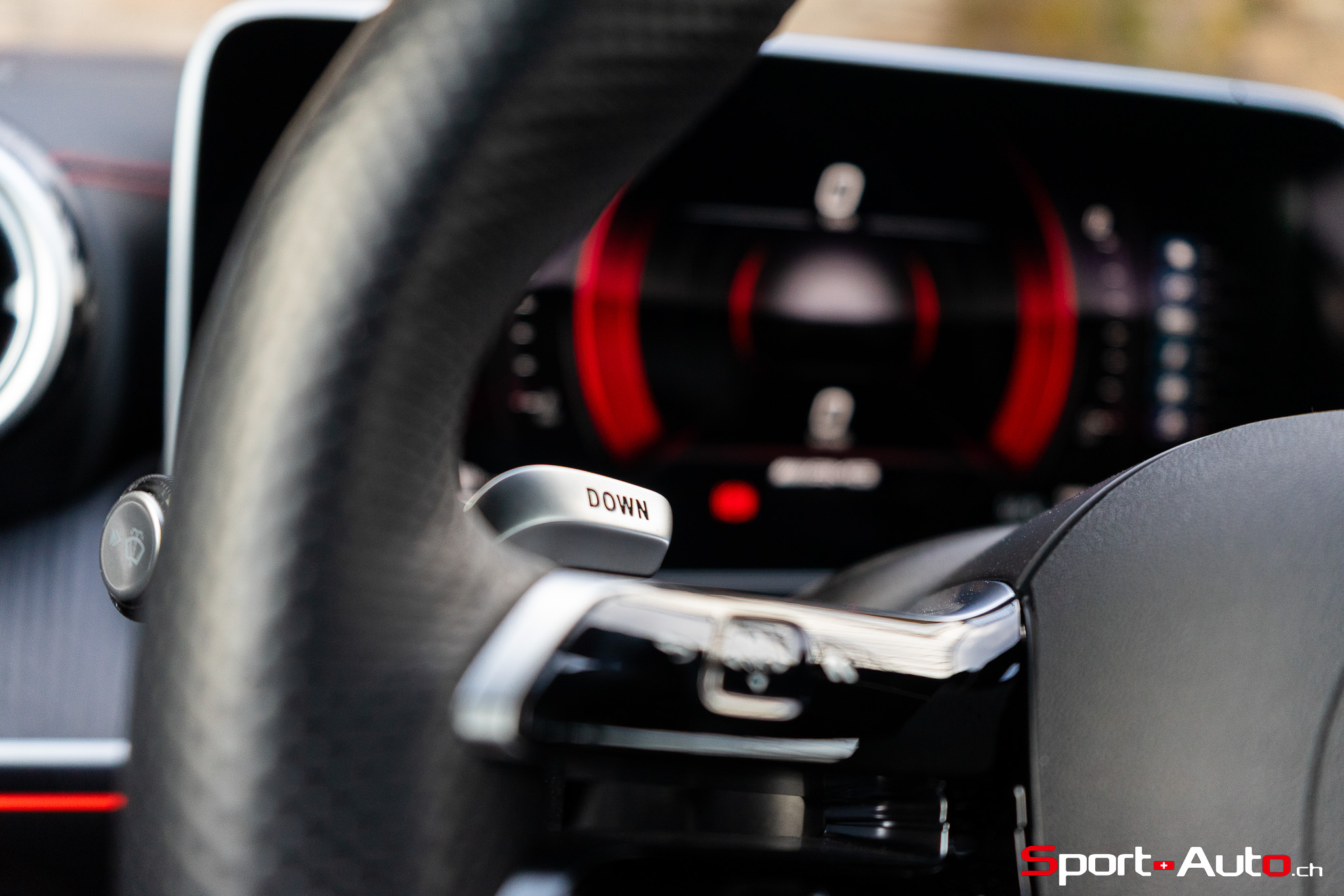 La sonorité du moteur est agréable à entendre. Les mauvaises langues diront que c’est grandement amplifié par les hauts parleurs “AMG Real Performance Sound” (CHF 639.-) présents. En réalité non : les plaisirs auditifs des pétarades aux rétrogradages raviront les passagers en mode cabriolet… surtout à l’intérieur des tunnels rocheux de nos routes alpines. Admirable pour une voiture de 2025 soumise aux réglementations de bruit !