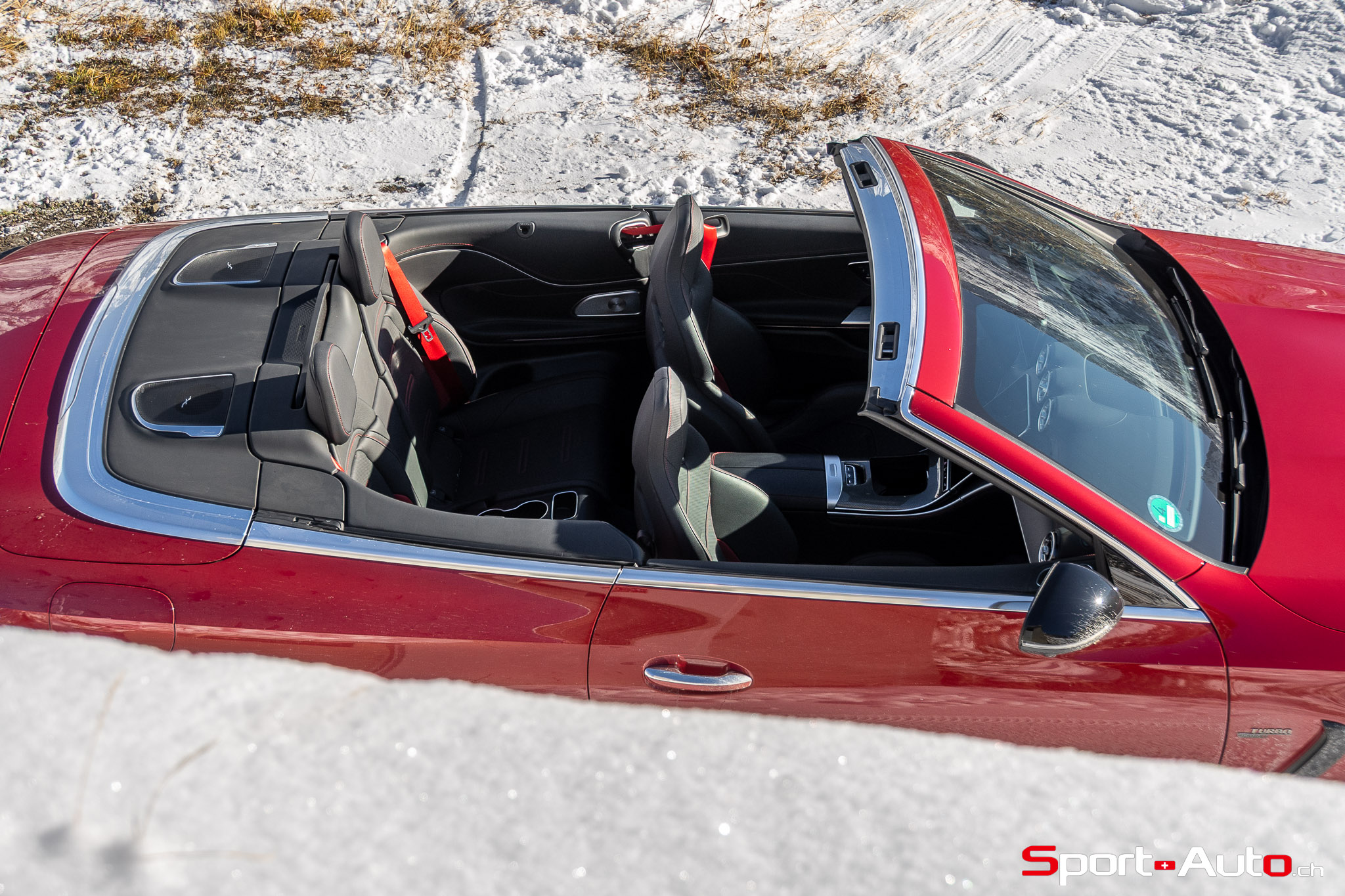 Notre exemplaire en Rouge Patagonie MANUFAKTUR (CHF 2400.-) est équipé de roues d’hiver (285/40 R17). Quant à la capote, elle peut être ouverte en 20 secondes et jusqu’à 60 km/h. La silhouette latérale de la CLE 53 donne presque un faux air de yacht sur roues, grâce à la partie plane au-dessus de son essieu arrière. Sous cette longue poupe, le coffre dispose d’une capacité de 385 litres en capote fermée et de 285 litres une fois celle-ci ouverte. Ce volume peut être agrandi en rabattant les sièges. Ceux-ci sont suffisamment grands pour accueillir des adultes à l’arrière, comme dans une Maserati Granturismo par exemple.