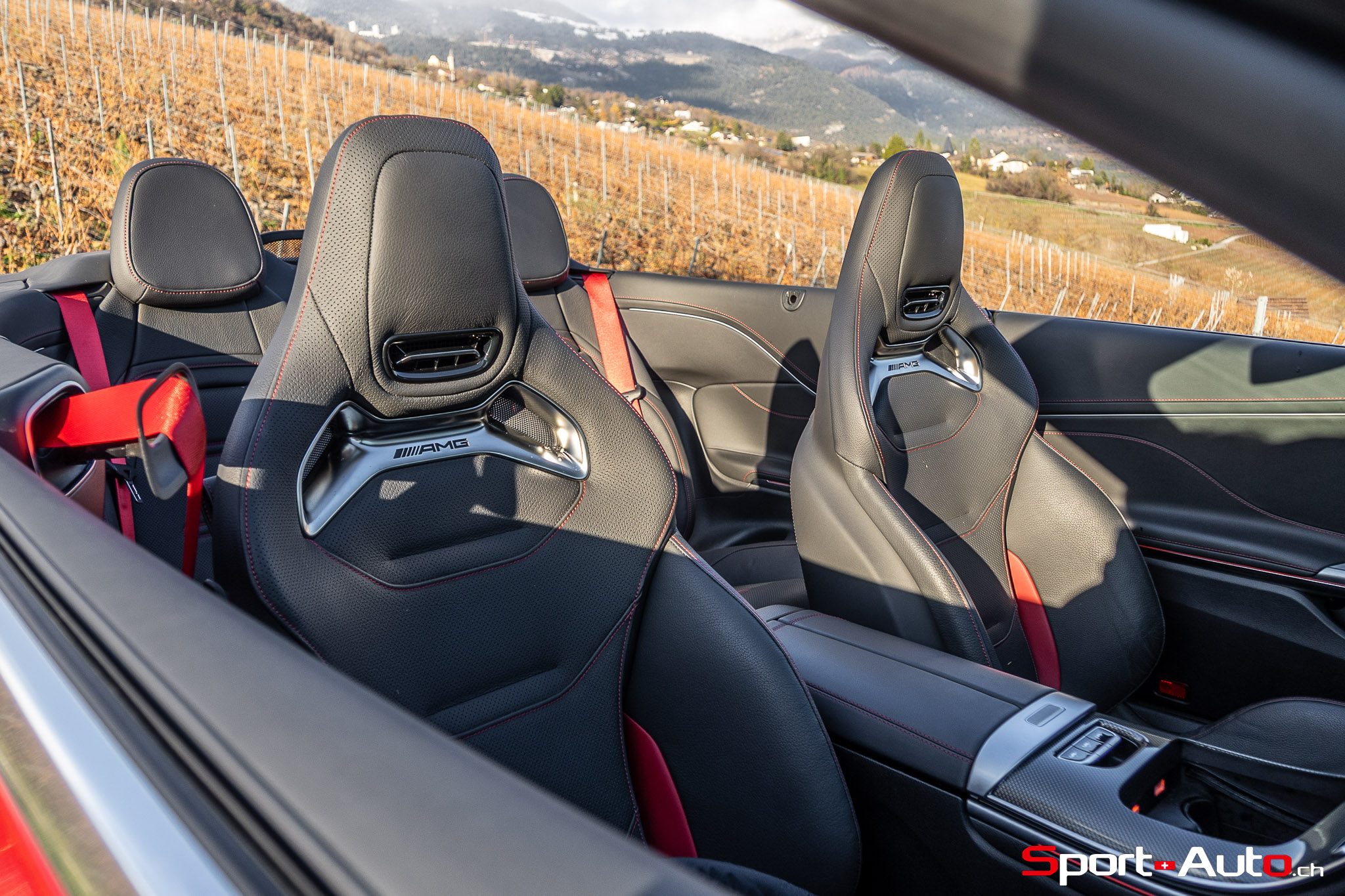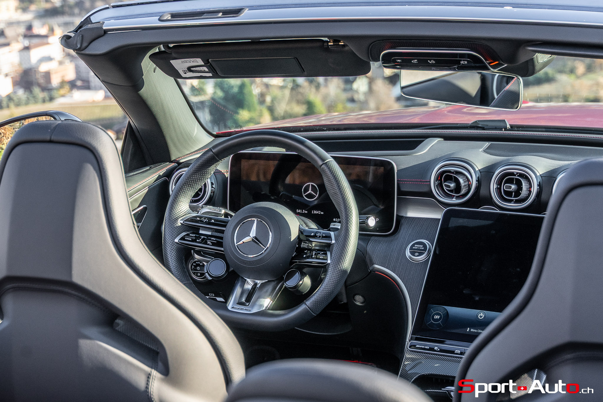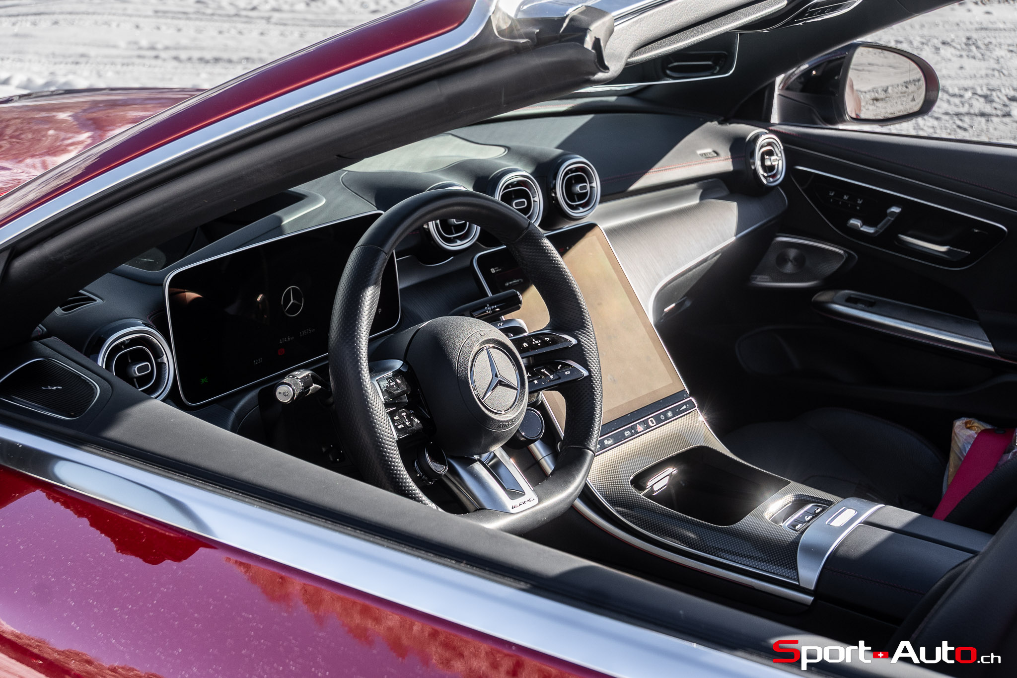 L’intérieur de la CLE 53 combine luxe et matériaux qualitatifs. Les cuirs ont été spécialement conçus pour être résistants à l’air libre, avec un revêtement spécial qui réfléchit les ondes infrarouges du soleil pour qu’ils ne deviennent pas brûlants l’été. A l’avant, on retrouve les excellents sièges Performance AMG enveloppants (compris dans le Pack Siège High-End Performance AMG, CHF 5212.-), quasi identiques à ceux de la C 63 S E Performance. Ils sont chauffants, mais il vous faudra encore cocher une case dans les options pour qu’ils soient climatisés (CHF 906.-). En revanche, les ceintures rouges et le chauffe nuque AIRSCARF sont fournies de série. Ce dernier permet de rouler décapoté sans problèmes, même à des températures avoisinant les – 10 degrés comme dans notre cas.