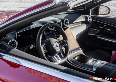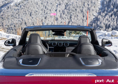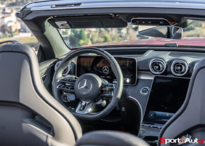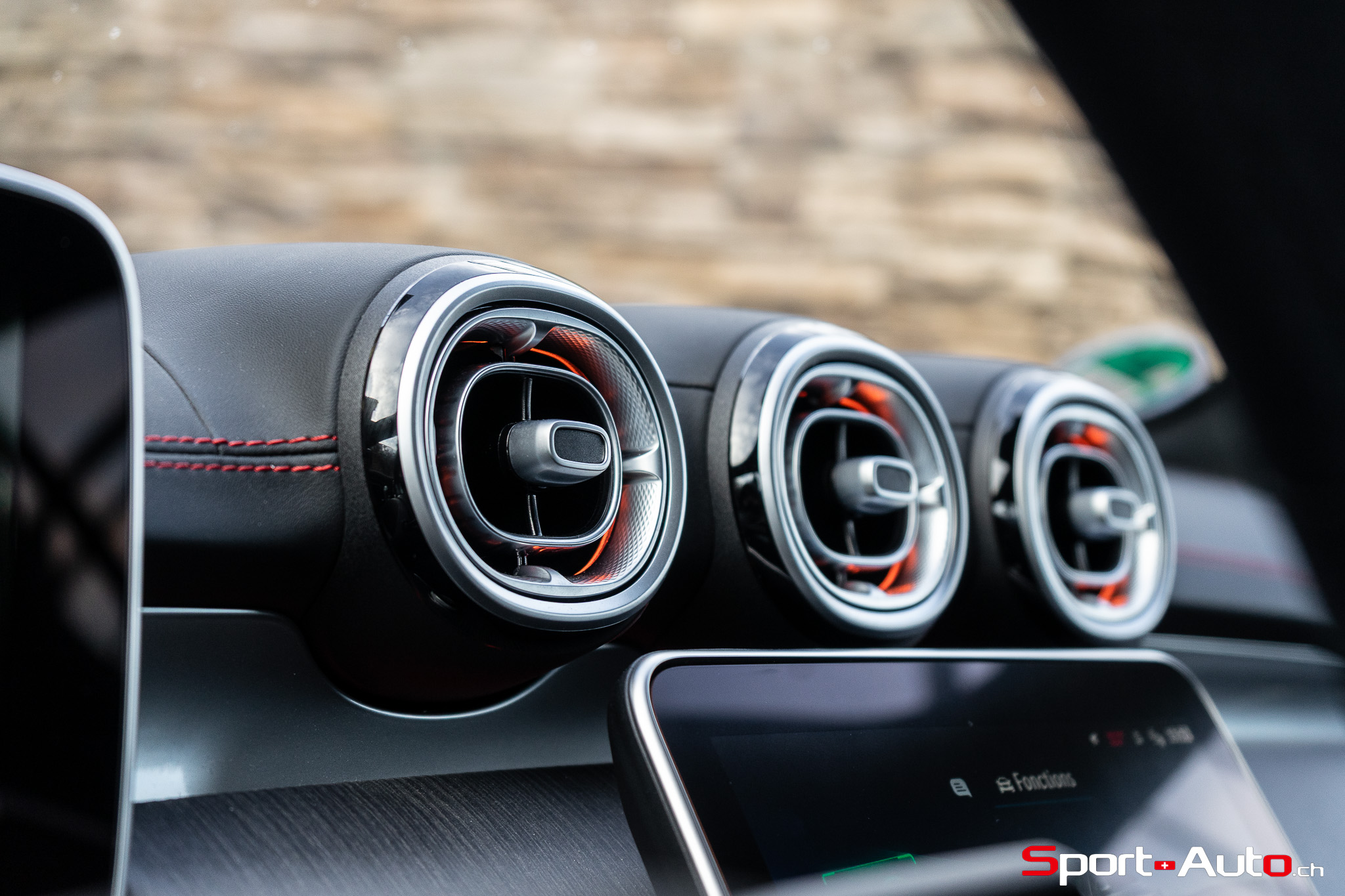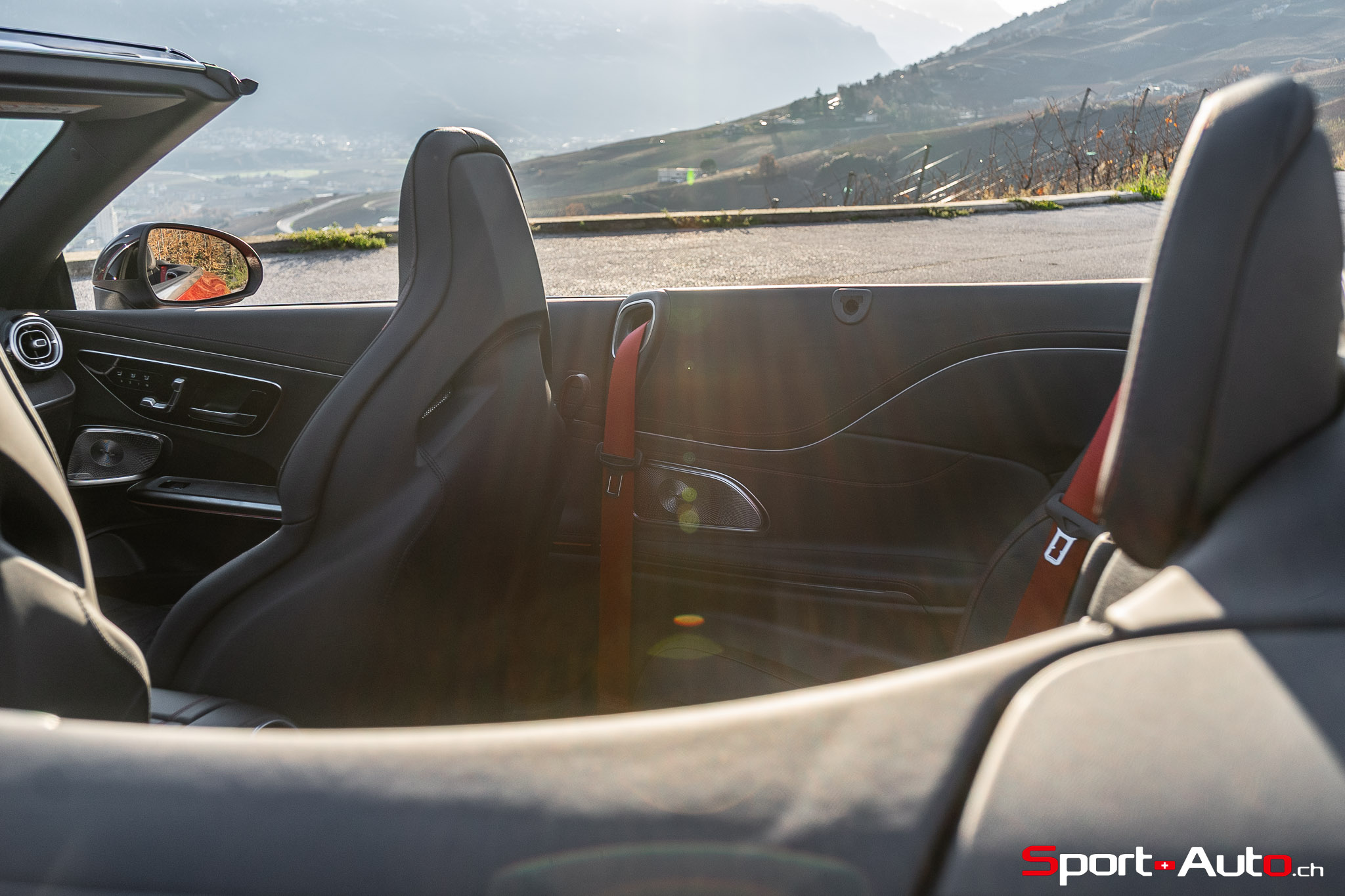 L’intérieur de la CLE 53 combine luxe et matériaux qualitatifs. Les cuirs ont été spécialement conçus pour être résistants à l’air libre, avec un revêtement spécial qui réfléchit les ondes infrarouges du soleil pour qu’ils ne deviennent pas brûlants l’été. A l’avant, on retrouve les excellents sièges Performance AMG enveloppants (compris dans le Pack Siège High-End Performance AMG, CHF 5212.-), quasi identiques à ceux de la C 63 S E Performance. Ils sont chauffants, mais il vous faudra encore cocher une case dans les options pour qu’ils soient climatisés (CHF 906.-). En revanche, les ceintures rouges et le chauffe nuque AIRSCARF sont fournies de série. Ce dernier permet de rouler décapoté sans problèmes, même à des températures avoisinant les – 10 degrés comme dans notre cas.