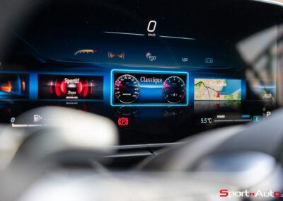 L’habitacle offre aux passagers un bon équilibre entre modernité et classicisme, avec des écrans habilement intégrés près des aérateurs en chrome. L’écran central vertical de 11,9 pouces est inclinable électriquement, pour se protéger des reflets du ciel si besoin. L’infodivertissement MBUX se calque sur les (nombreux) autres modèles de la marque. La navigation intègre en réalité virtuelle les indications de manière dynamique directement dans l’affichage tête haute. Les aides à la conduite sont en général bien calibrées, mis à part la reconnaissance des panneaux qui commet encore quelques erreurs : un affichage de 80 km/h nous a, par exemple, été montré dans un village (distinctement) limité à 40 km/h.