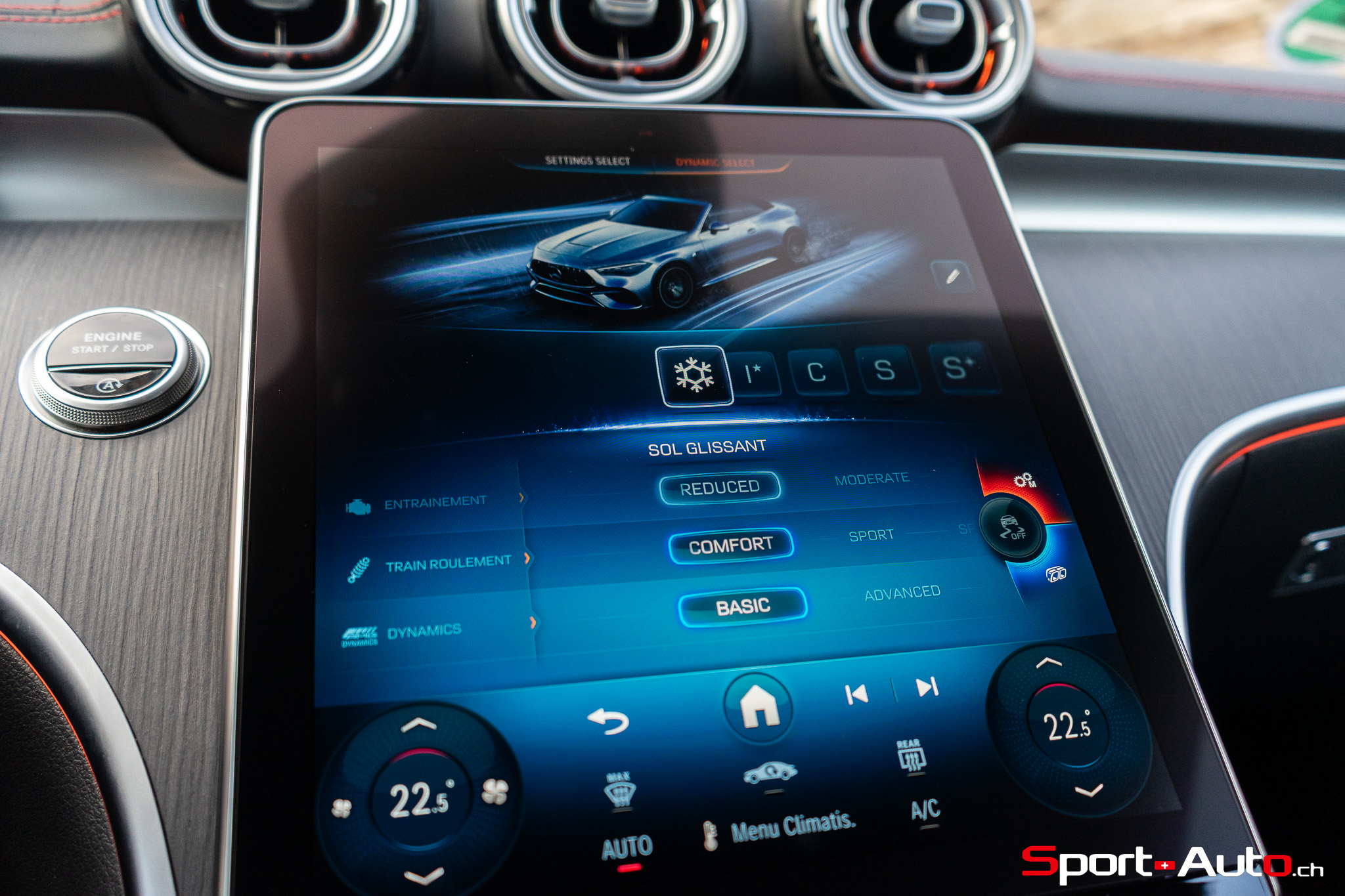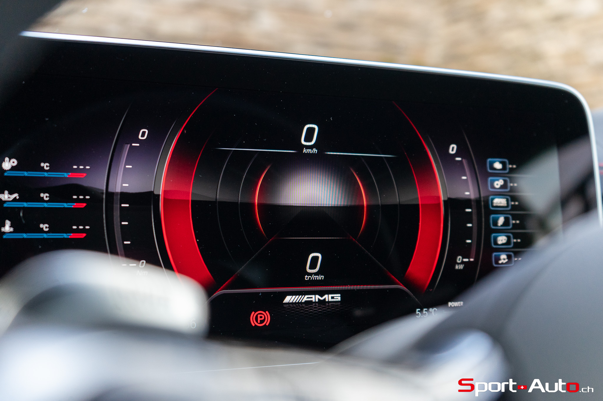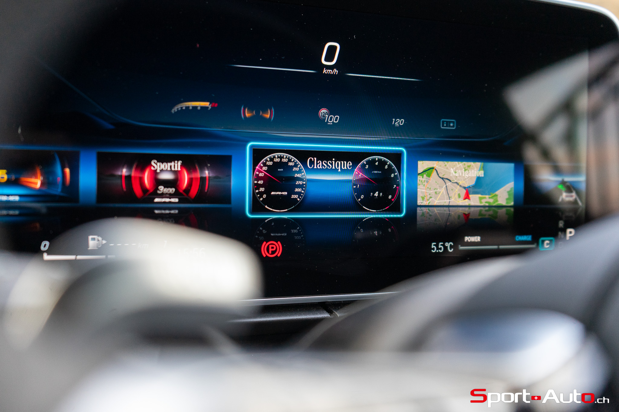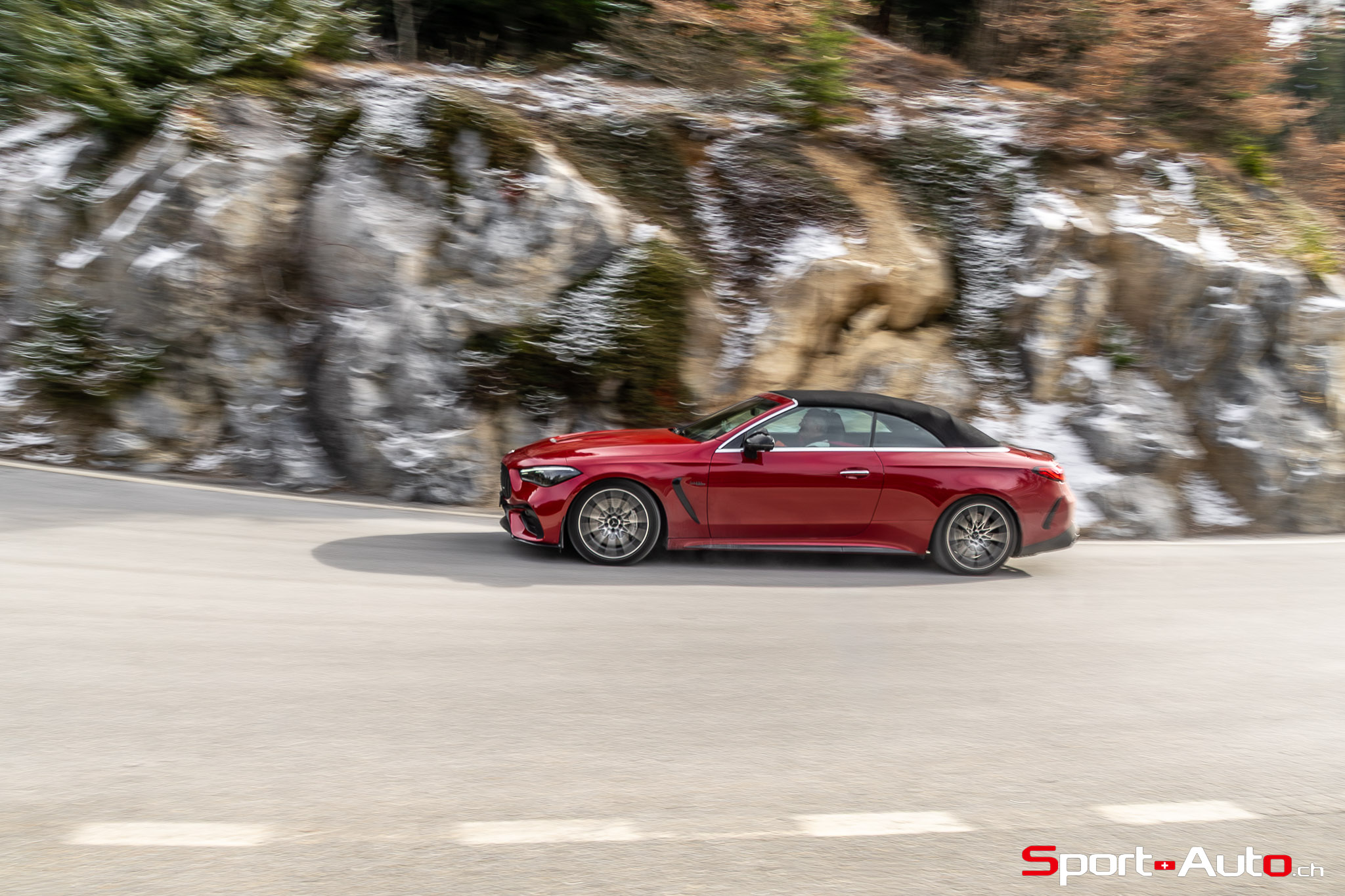 La sonorité du moteur est agréable à entendre. Les mauvaises langues diront que c’est grandement amplifié par les hauts parleurs “AMG Real Performance Sound” (CHF 639.-) présents. En réalité non : les plaisirs auditifs des pétarades aux rétrogradages raviront les passagers en mode cabriolet… surtout à l’intérieur des tunnels rocheux de nos routes alpines. Admirable pour une voiture de 2025 soumise aux réglementations de bruit !