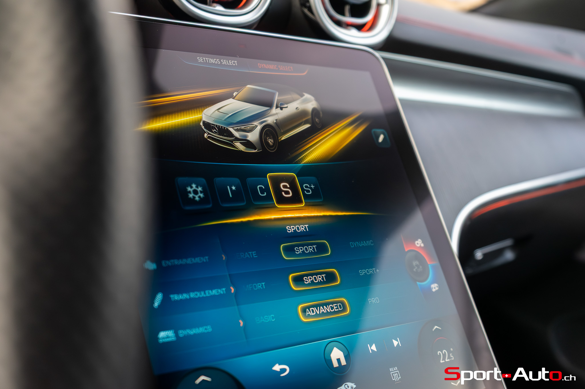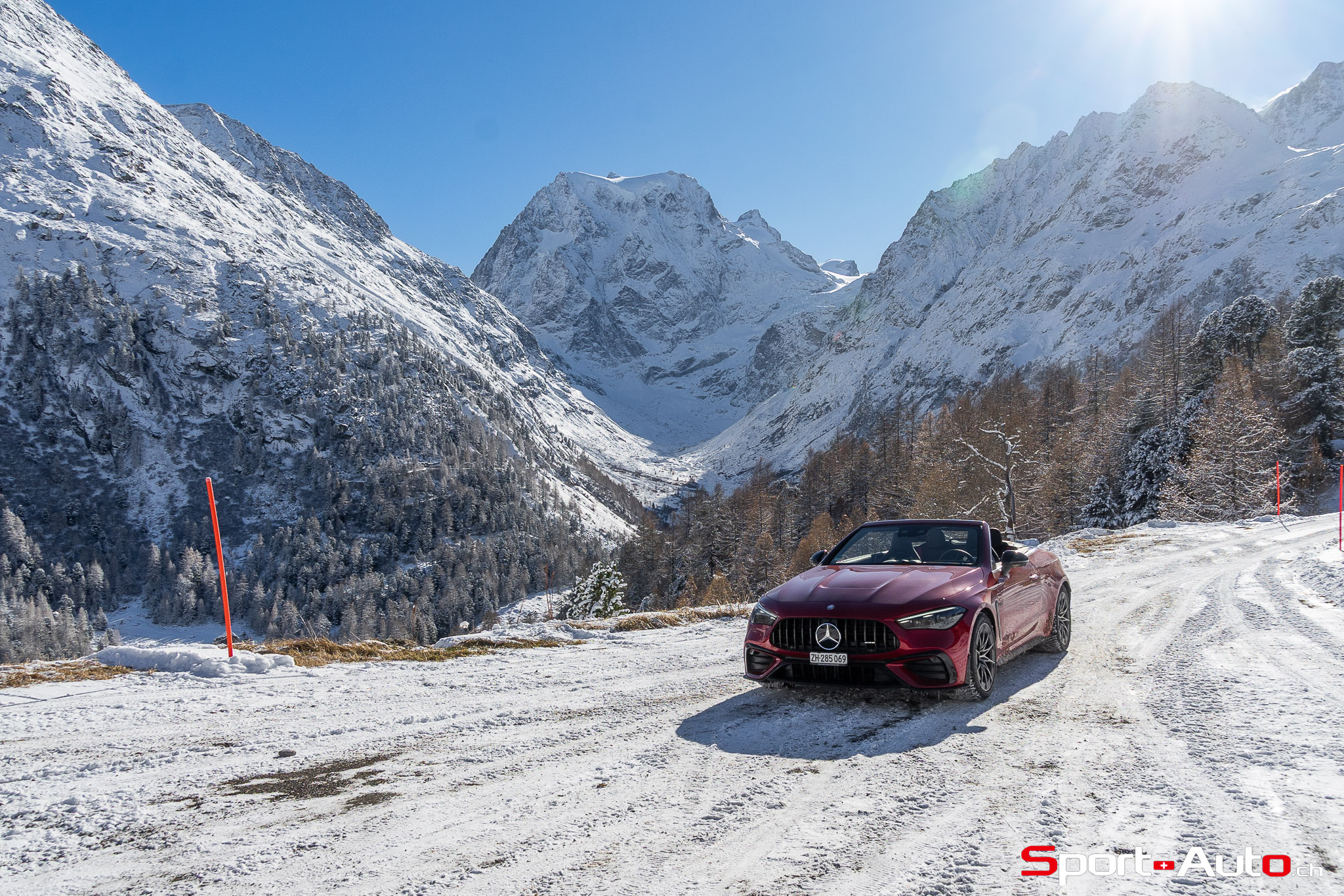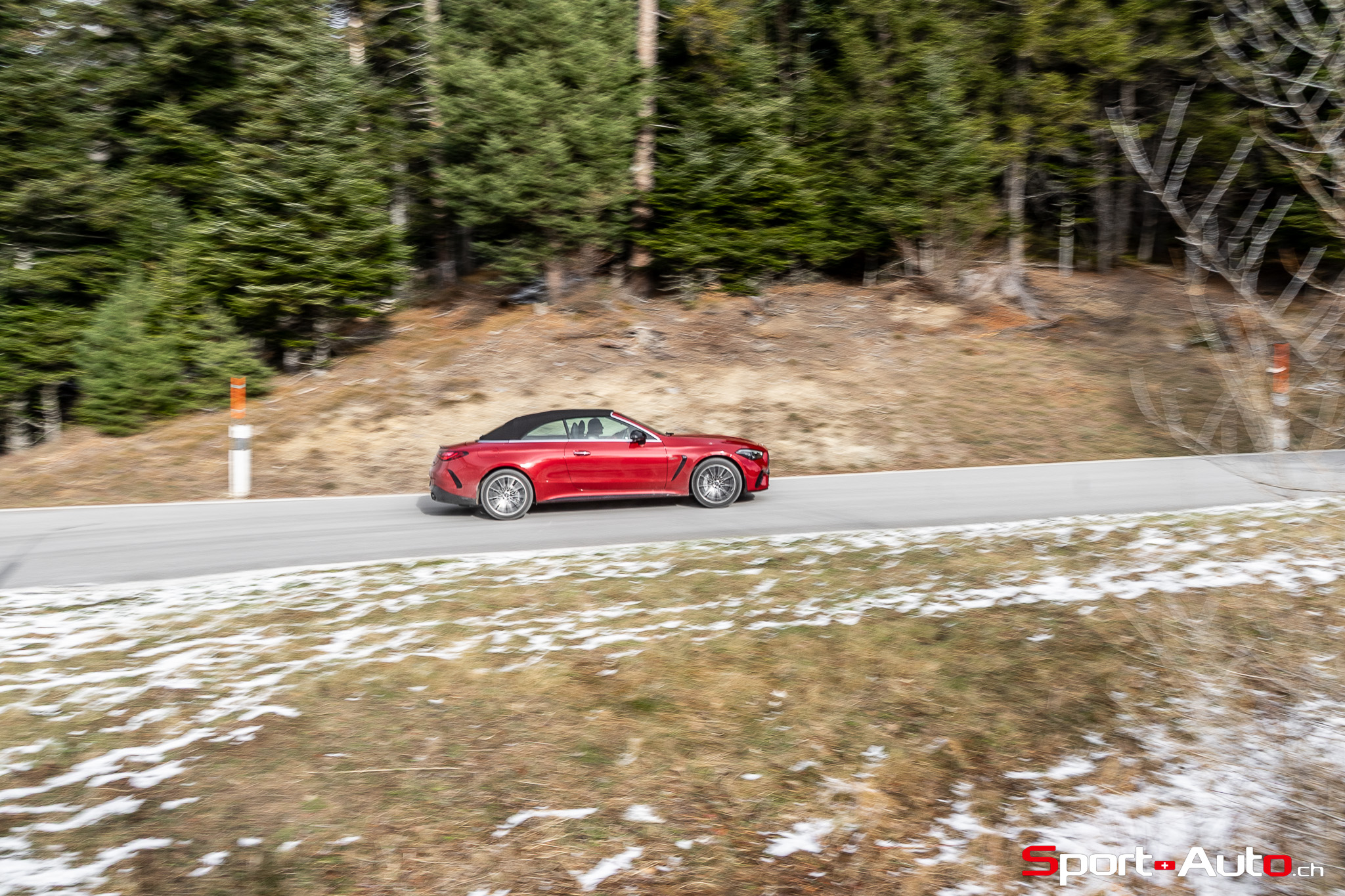 La sonorité du moteur est agréable à entendre. Les mauvaises langues diront que c’est grandement amplifié par les hauts parleurs “AMG Real Performance Sound” (CHF 639.-) présents. En réalité non : les plaisirs auditifs des pétarades aux rétrogradages raviront les passagers en mode cabriolet… surtout à l’intérieur des tunnels rocheux de nos routes alpines. Admirable pour une voiture de 2025 soumise aux réglementations de bruit !