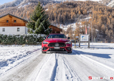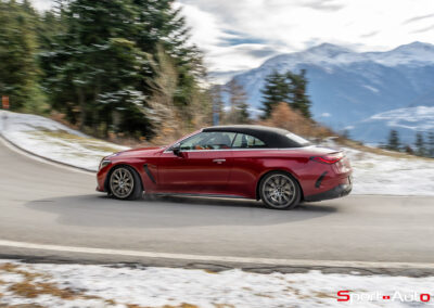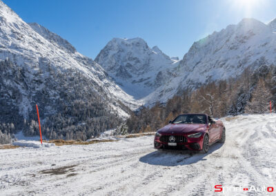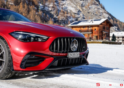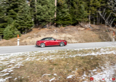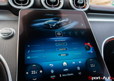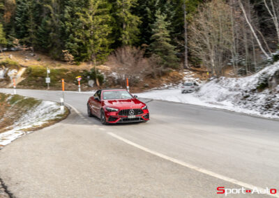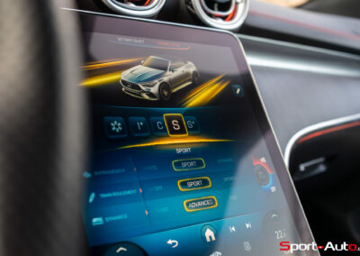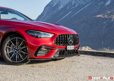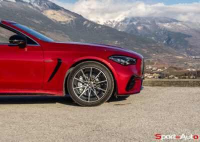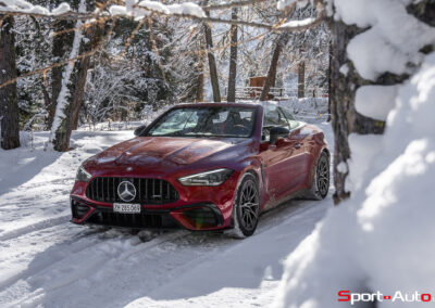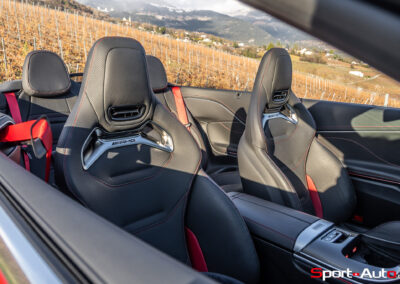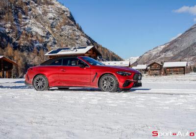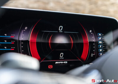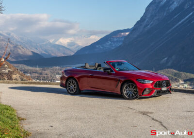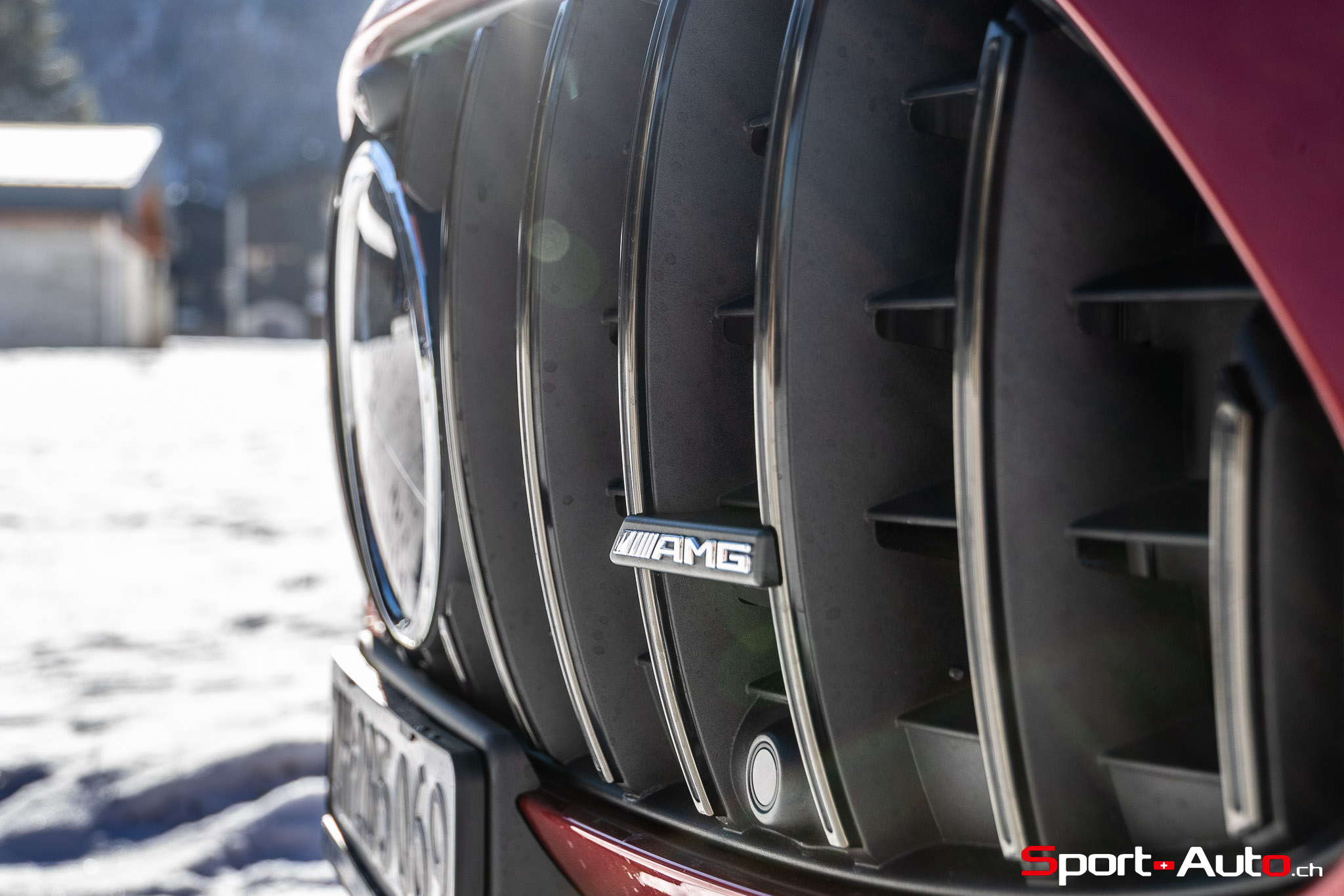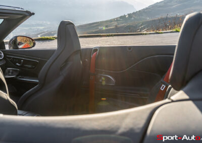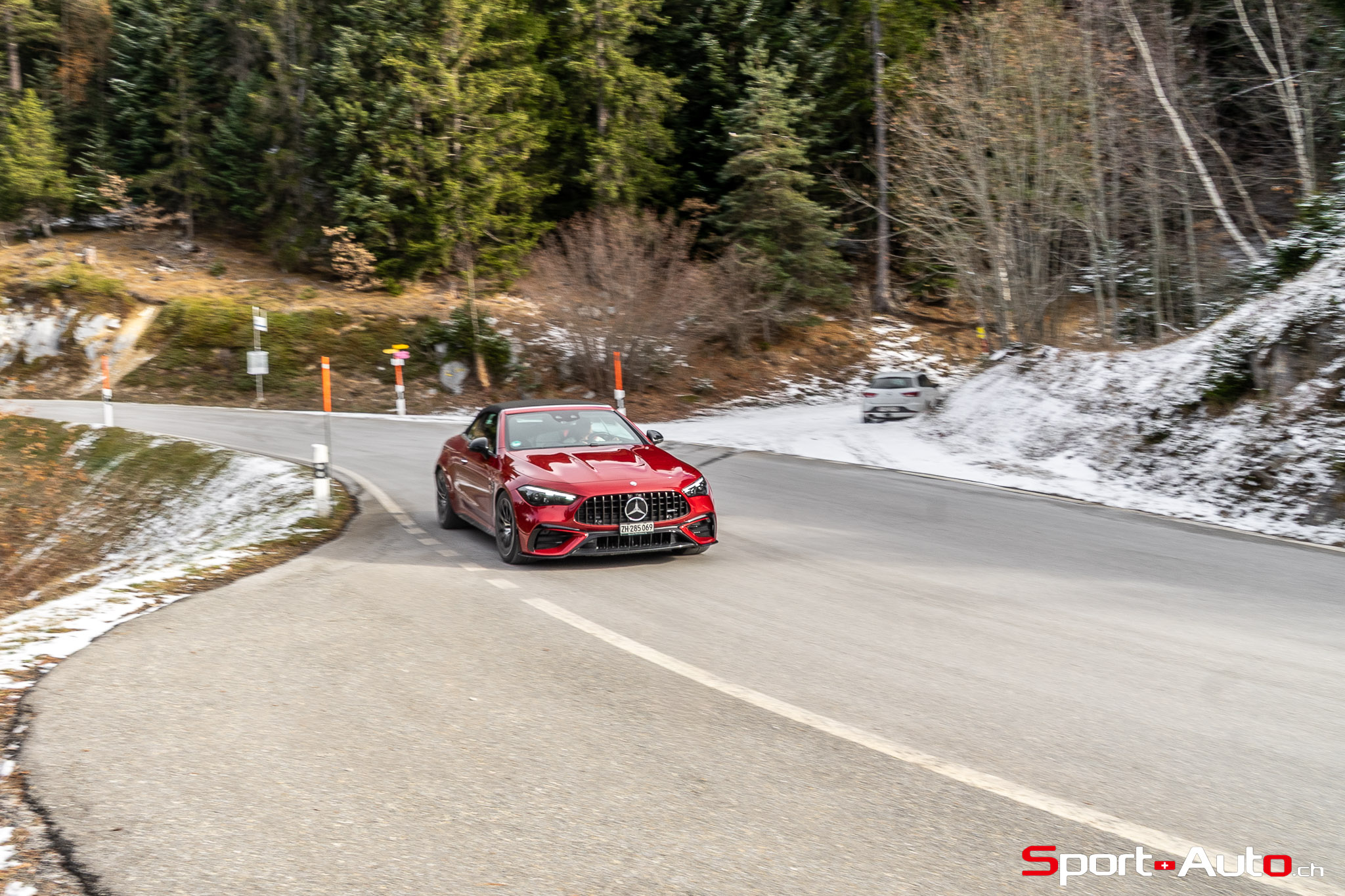 La sonorité du moteur est agréable à entendre. Les mauvaises langues diront que c’est grandement amplifié par les hauts parleurs “AMG Real Performance Sound” (CHF 639.-) présents. En réalité non : les plaisirs auditifs des pétarades aux rétrogradages raviront les passagers en mode cabriolet… surtout à l’intérieur des tunnels rocheux de nos routes alpines. Admirable pour une voiture de 2025 soumise aux réglementations de bruit !