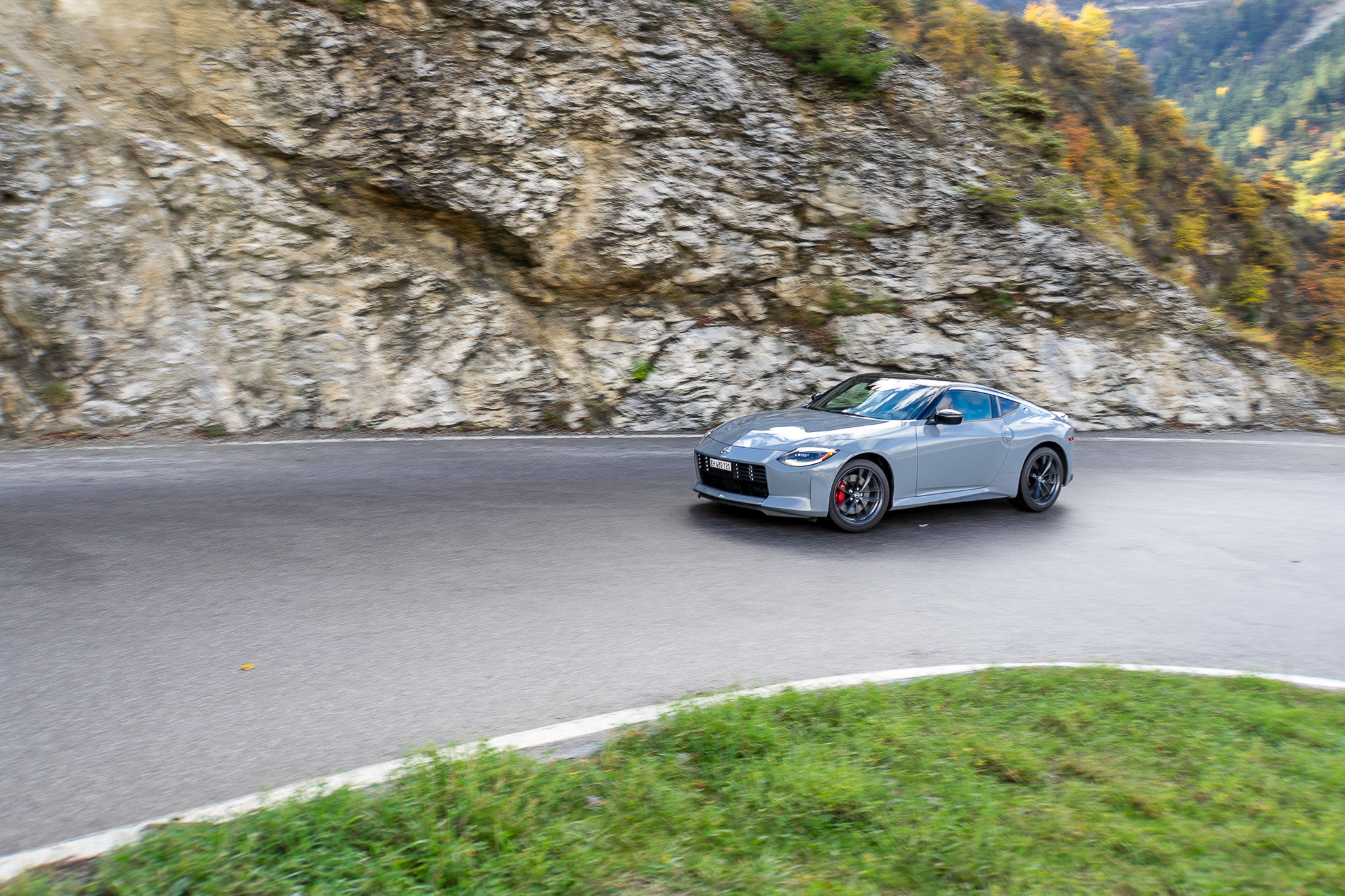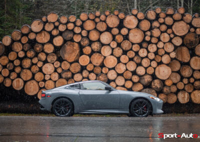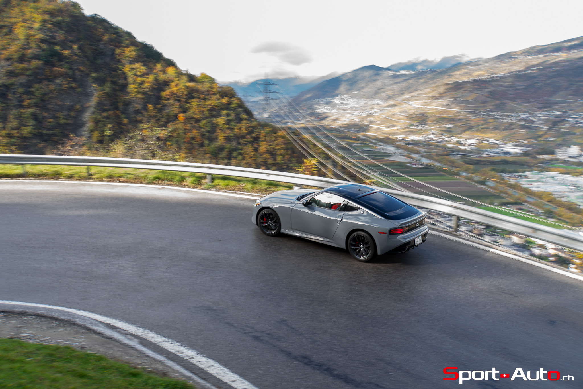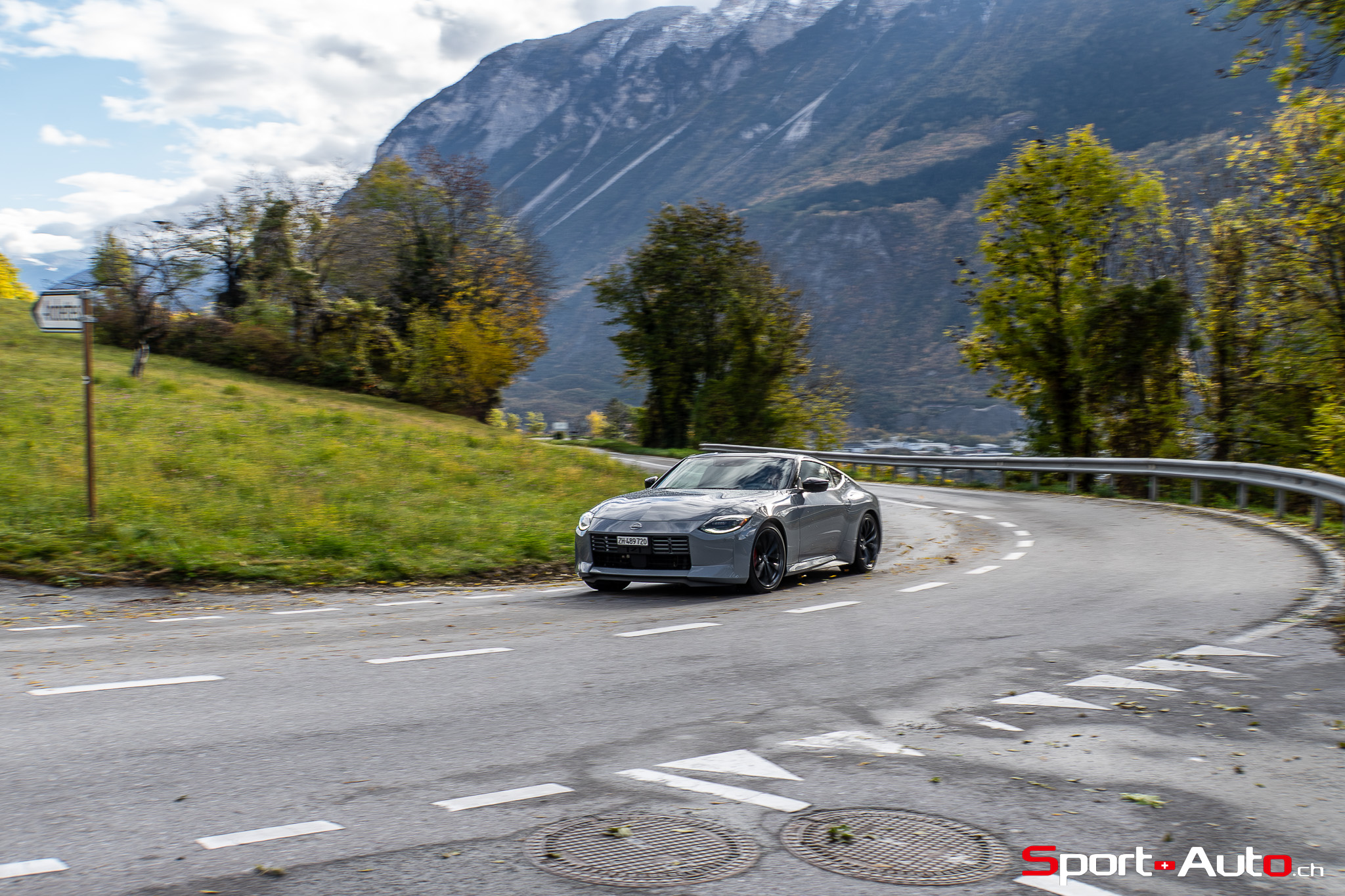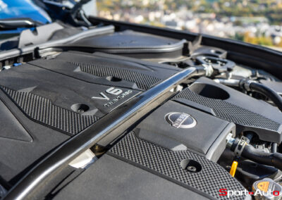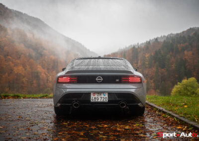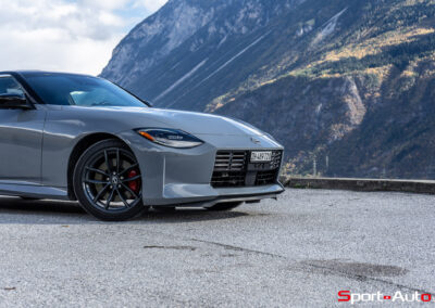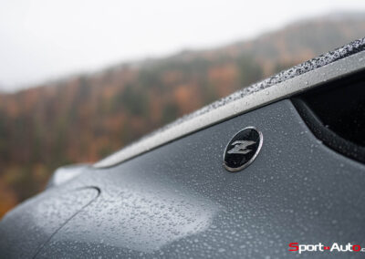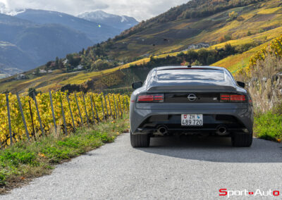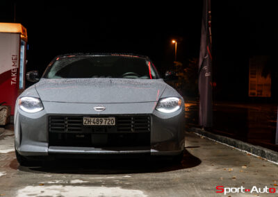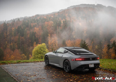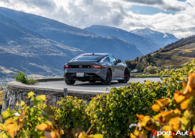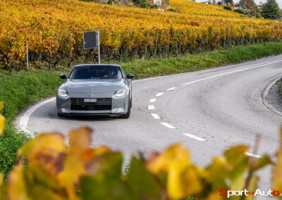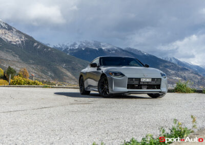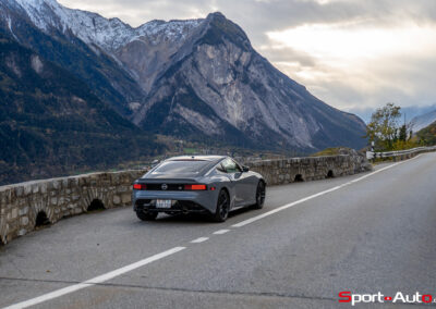 Même à basses vitesses, le ronron du V6 est très agréable à entendre. Son timbre rappelle celui de la Nissan GT-R. La boite à 6 vitesses dispose de série de la fonction “Rev-Matching”, et la voiture est équipée d’un arbre de transmission en carbone, comme sur une Alfa Romeo Giulia Quadrifoglio par exemple. Prenons à présent la direction des routes sinueuses fraîchement parcourues par le Rallye du Valais pour voir comment cette Nissan Z se dévoile en conduite sportive.