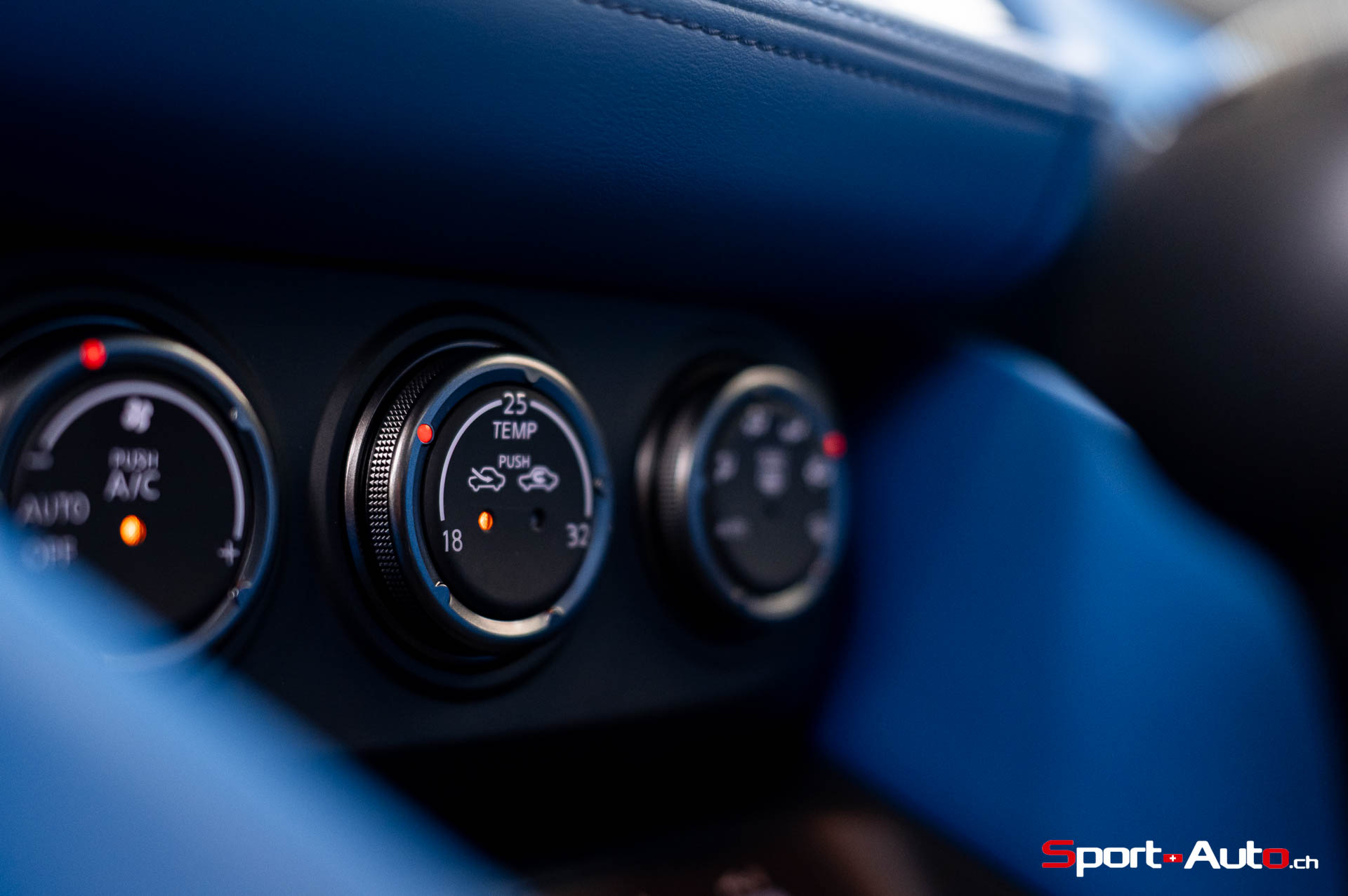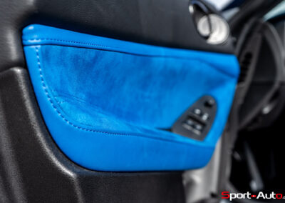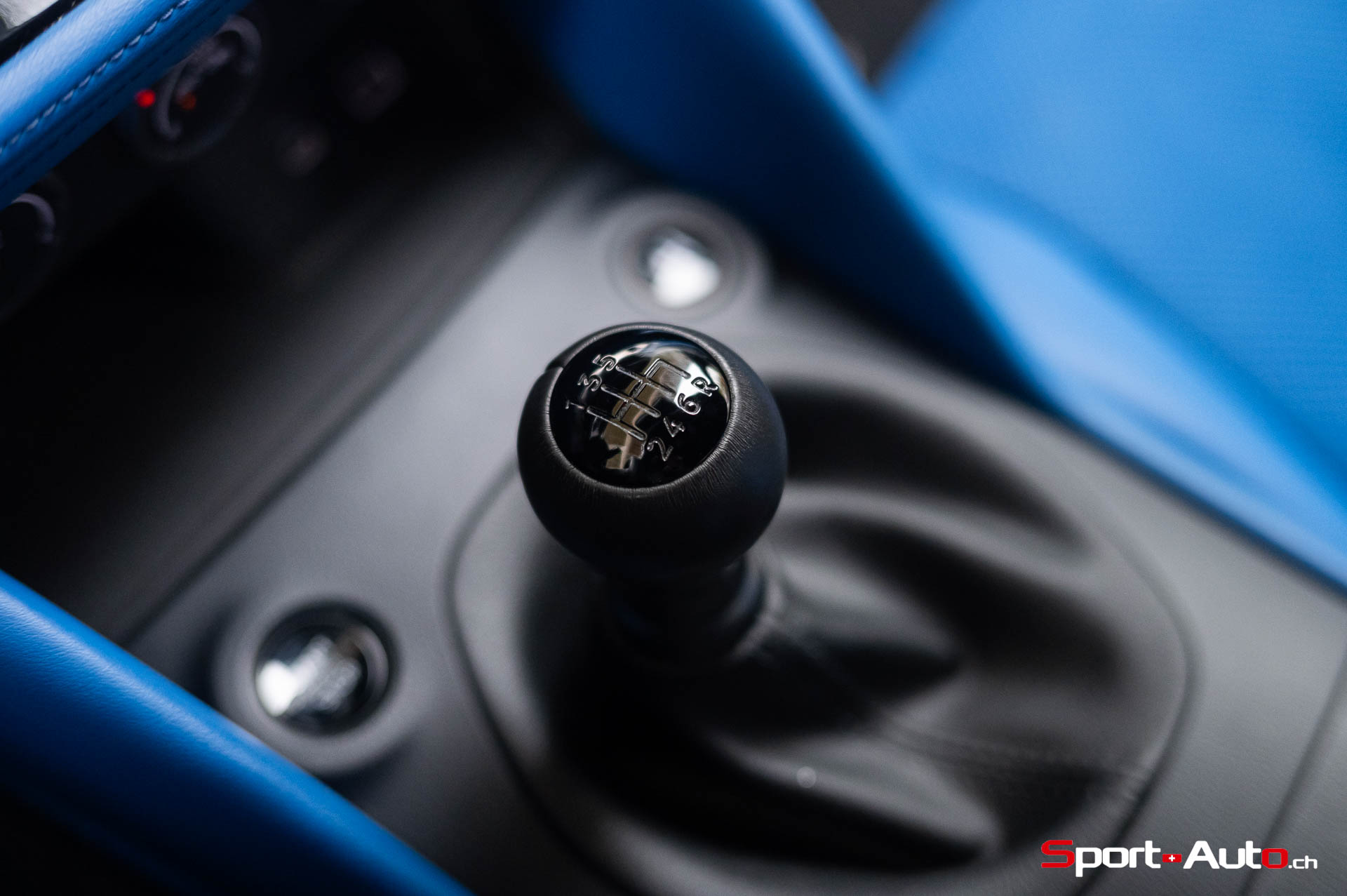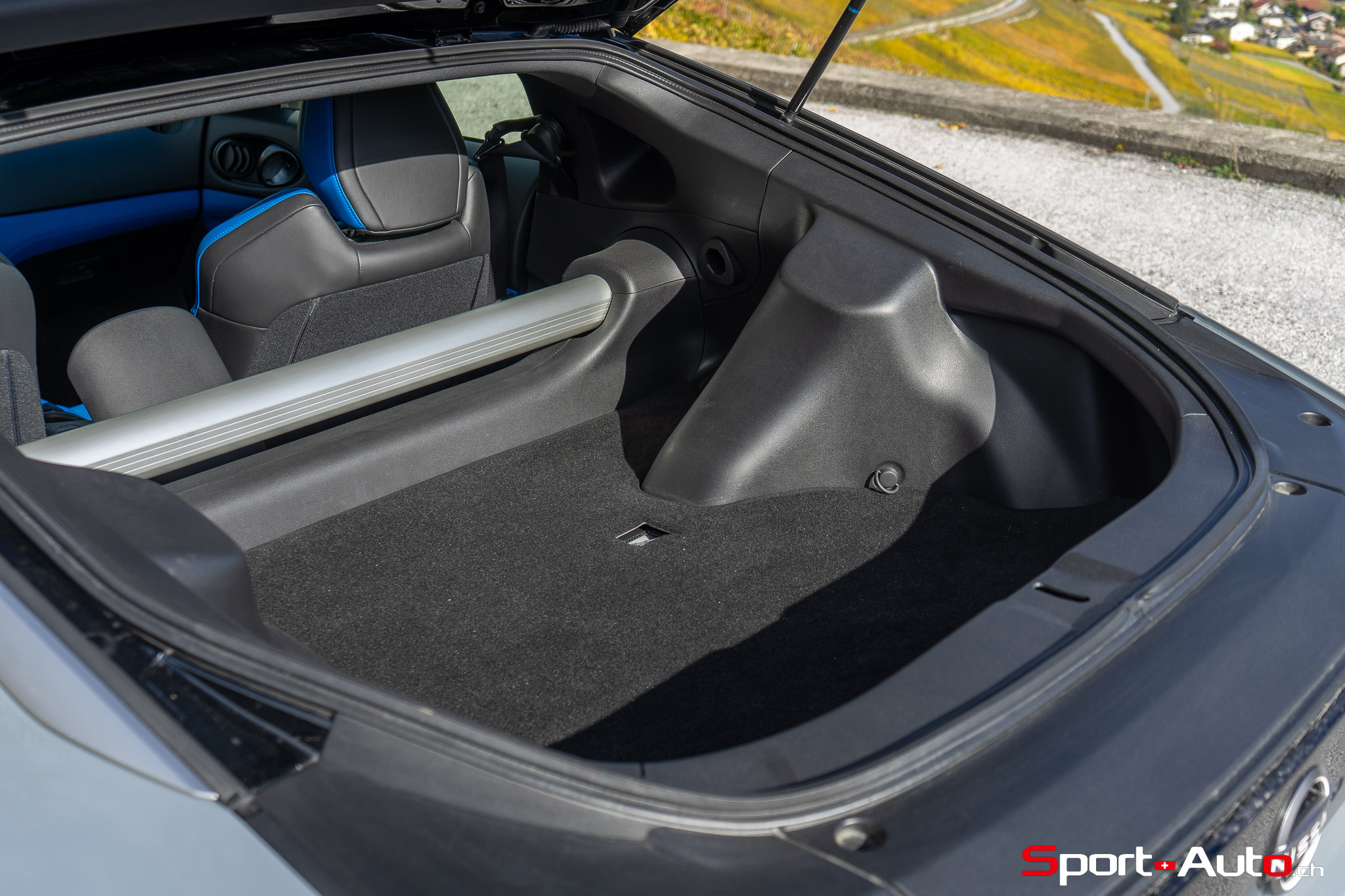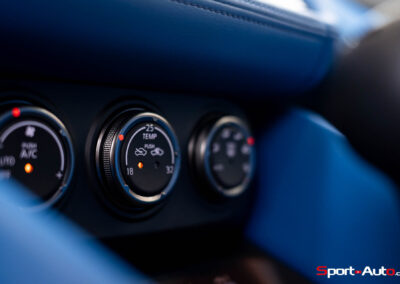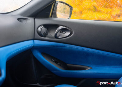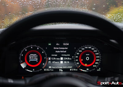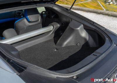 Sur notre exemplaire, on retrouve un intérieur bicolore bleu/noir (CHF 1200.-) qui surprend, mais s’allie bien avec la peinture “Boulder Grey” de l’extérieur. Les sièges sont garnis de cuir et suédine synthétique, conçus pour être antidérapants. Ceux-ci sont chauffants et activables par des touches centrales toutes droites sorties des “nineties”, qui prêtent à sourire. Derrière le volant inspiré de la Nissan GT-R, un écran bien net affiche la vitesse et le compte-tour. Au centre de l’habitacle, l’écran principal inclut Apple Carplay ou Androïd Auto, mais dispose de graphismes moins qualitatifs. Devant lui trône un monument devenu désormais très rare dans la production actuelle : un levier de boite de vitesse manuelle.