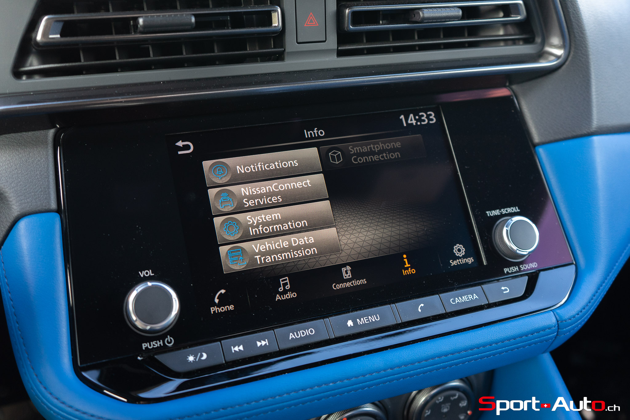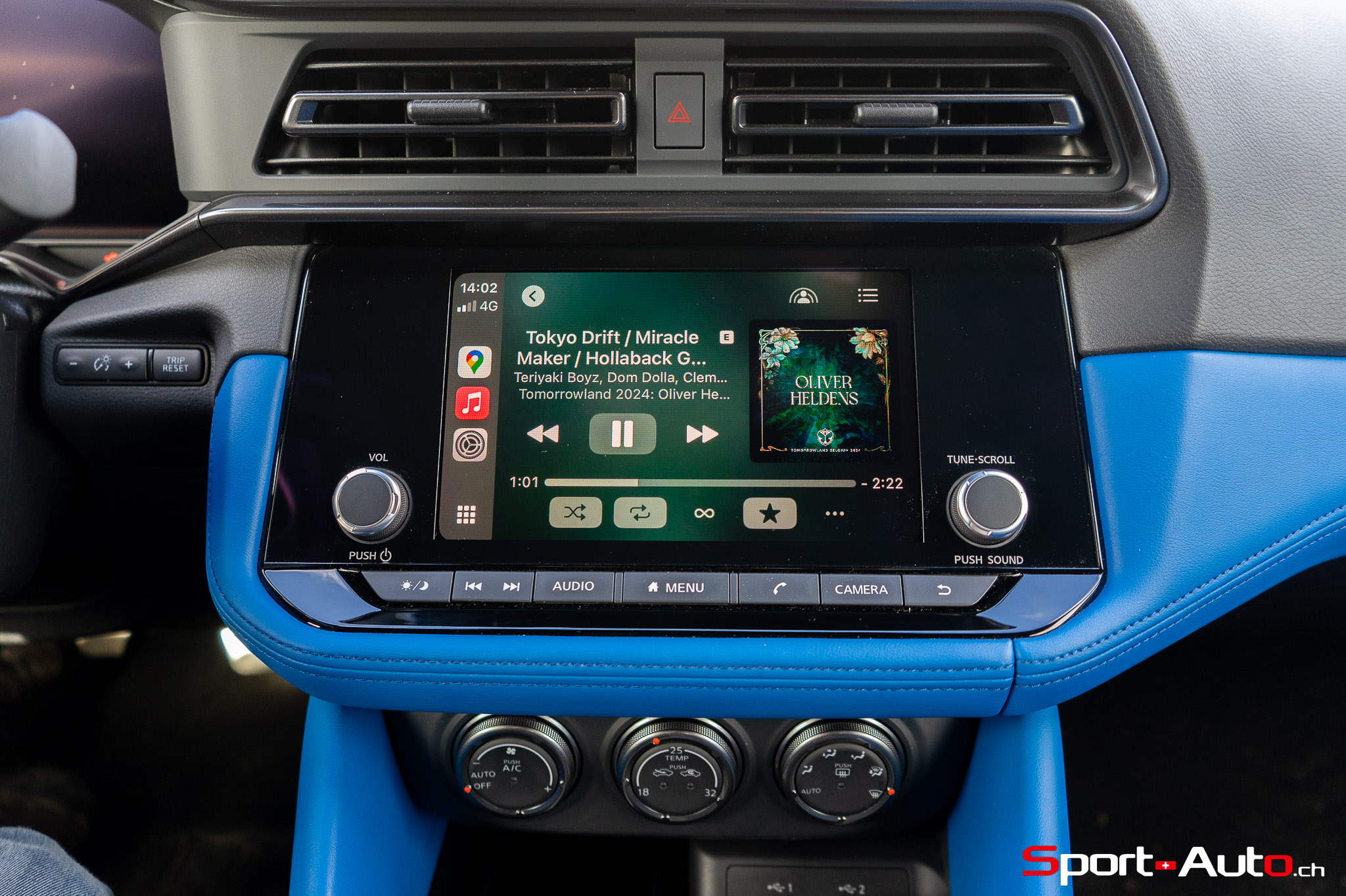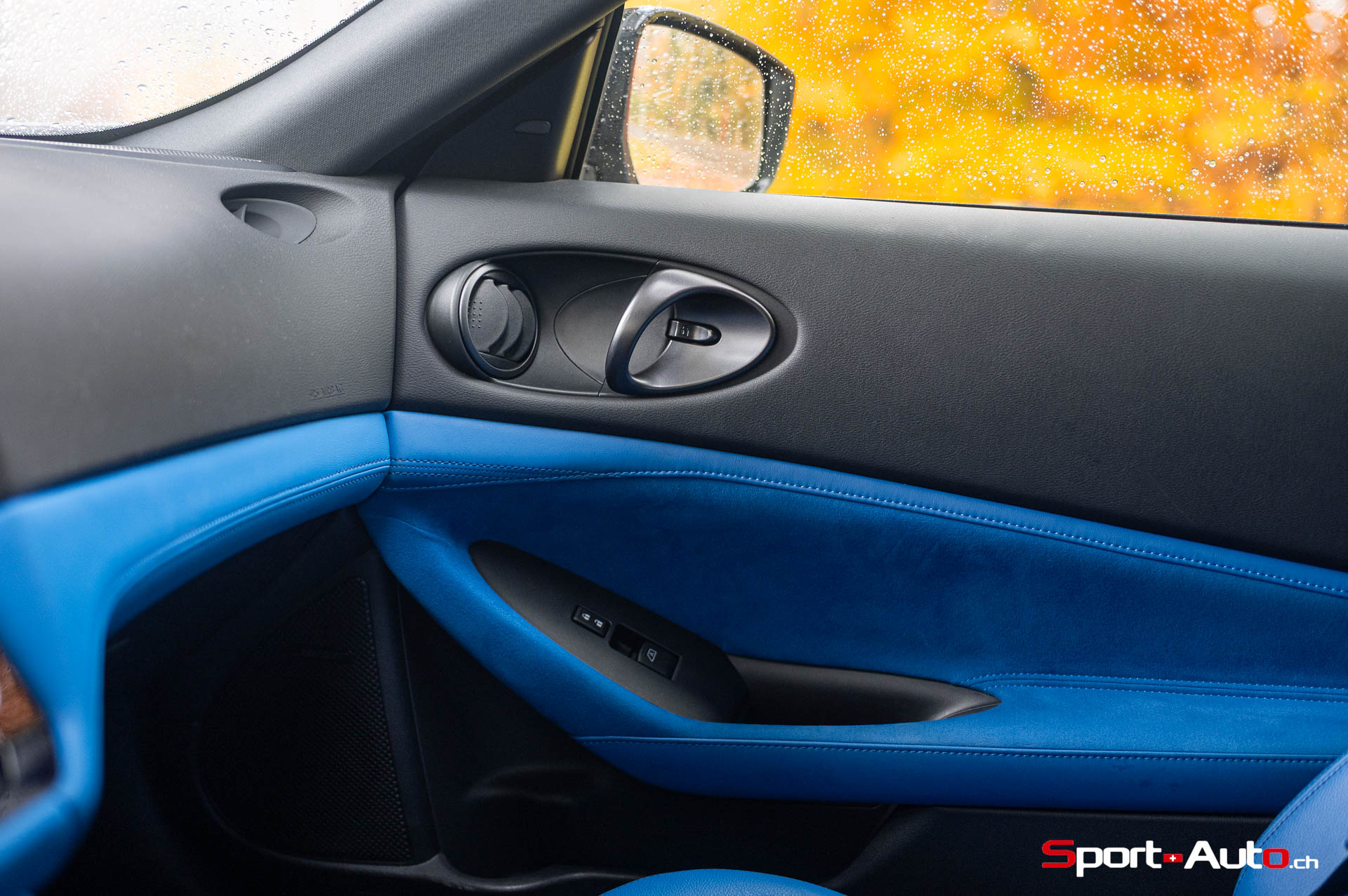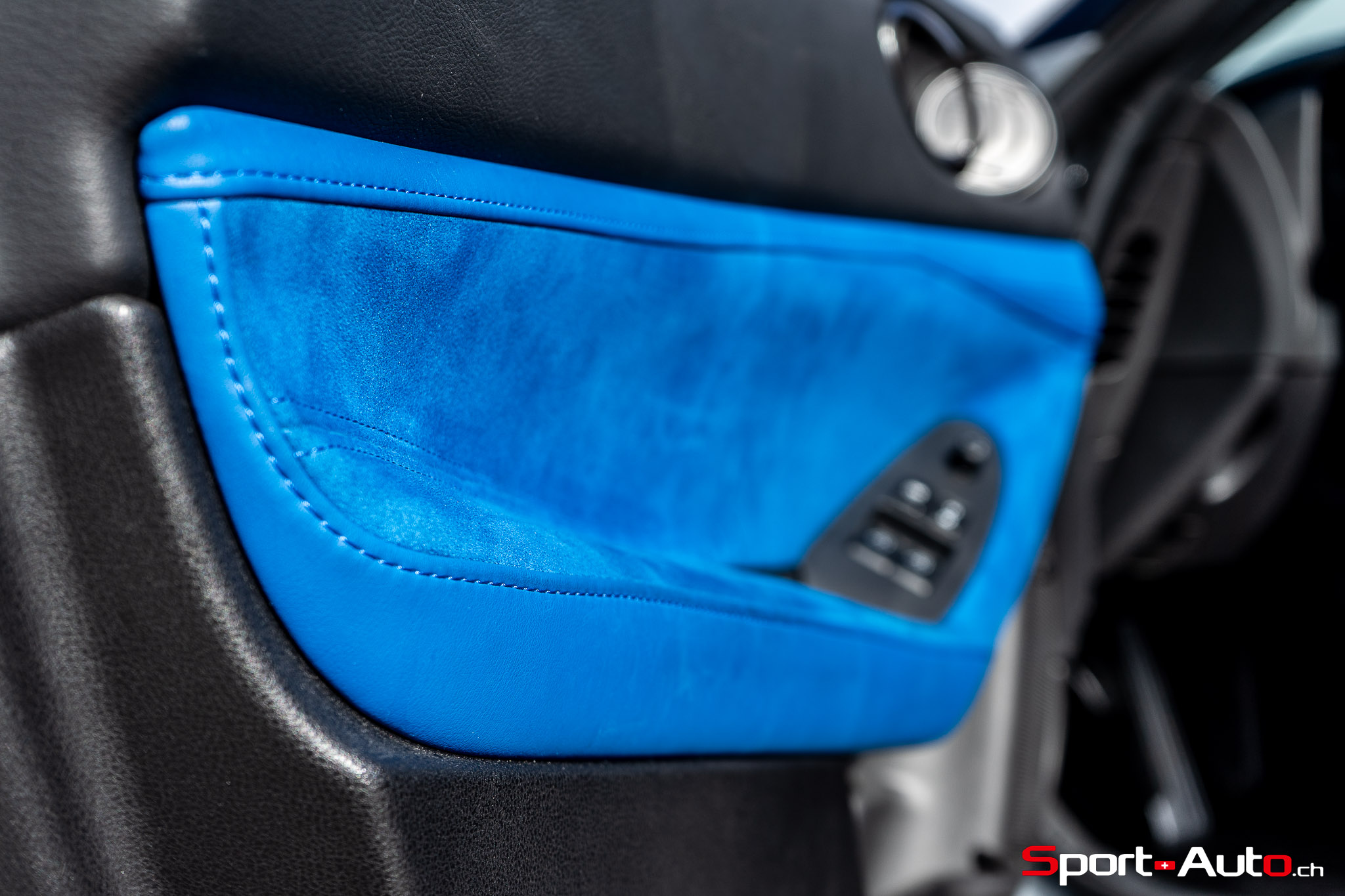 Sur notre exemplaire, on retrouve un intérieur bicolore bleu/noir (CHF 1200.-) qui surprend, mais s’allie bien avec la peinture “Boulder Grey” de l’extérieur. Les sièges sont garnis de cuir et suédine synthétique, conçus pour être antidérapants. Ceux-ci sont chauffants et activables par des touches centrales toutes droites sorties des “nineties”, qui prêtent à sourire. Derrière le volant inspiré de la Nissan GT-R, un écran bien net affiche la vitesse et le compte-tour. Au centre de l’habitacle, l’écran principal inclut Apple Carplay ou Androïd Auto, mais dispose de graphismes moins qualitatifs. Devant lui trône un monument devenu désormais très rare dans la production actuelle : un levier de boite de vitesse manuelle.