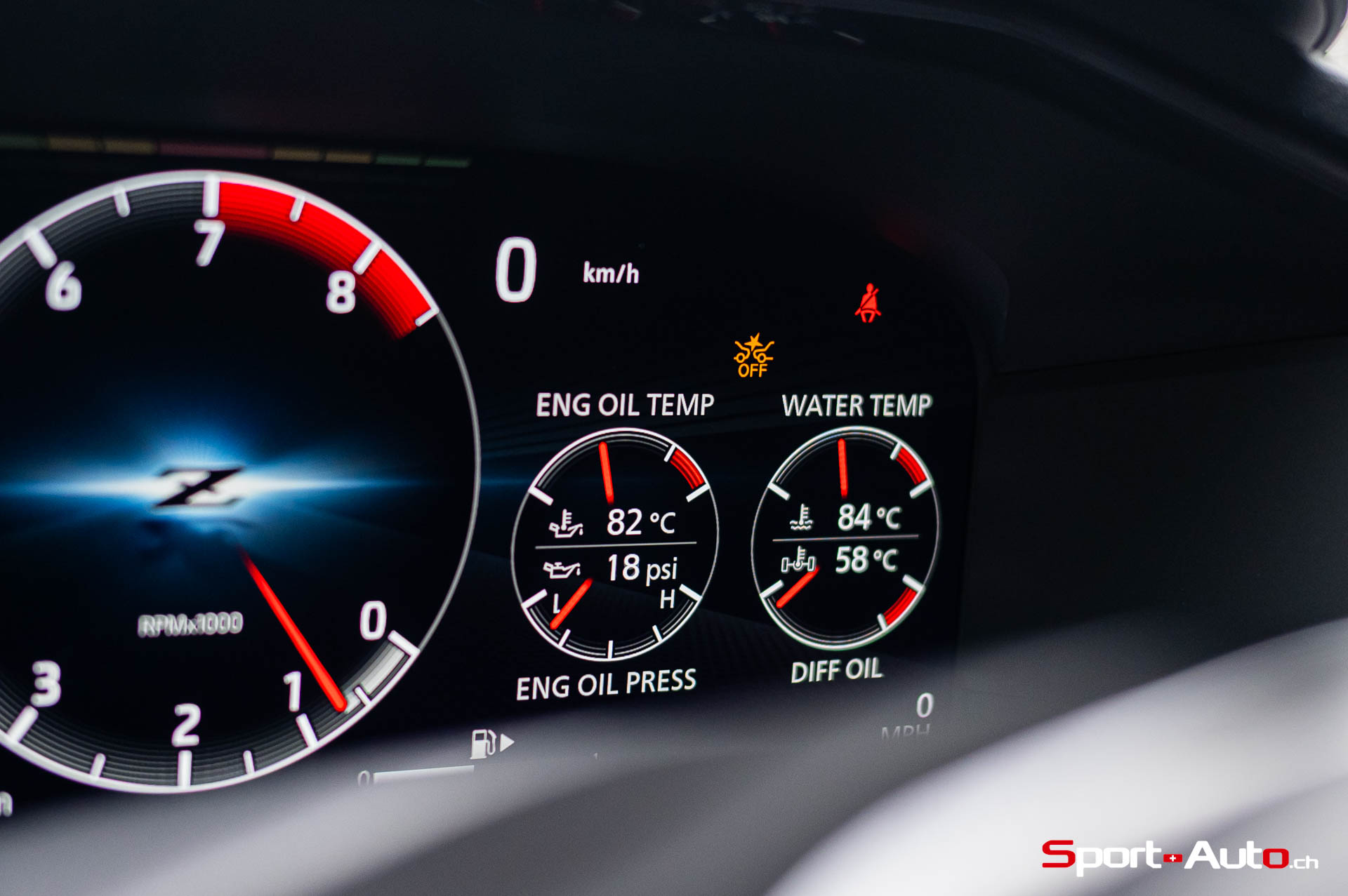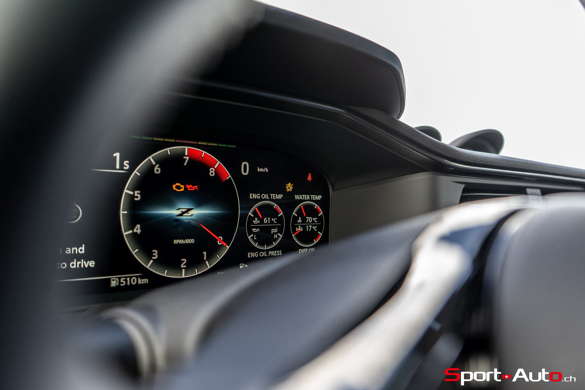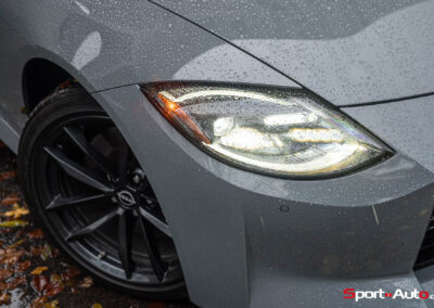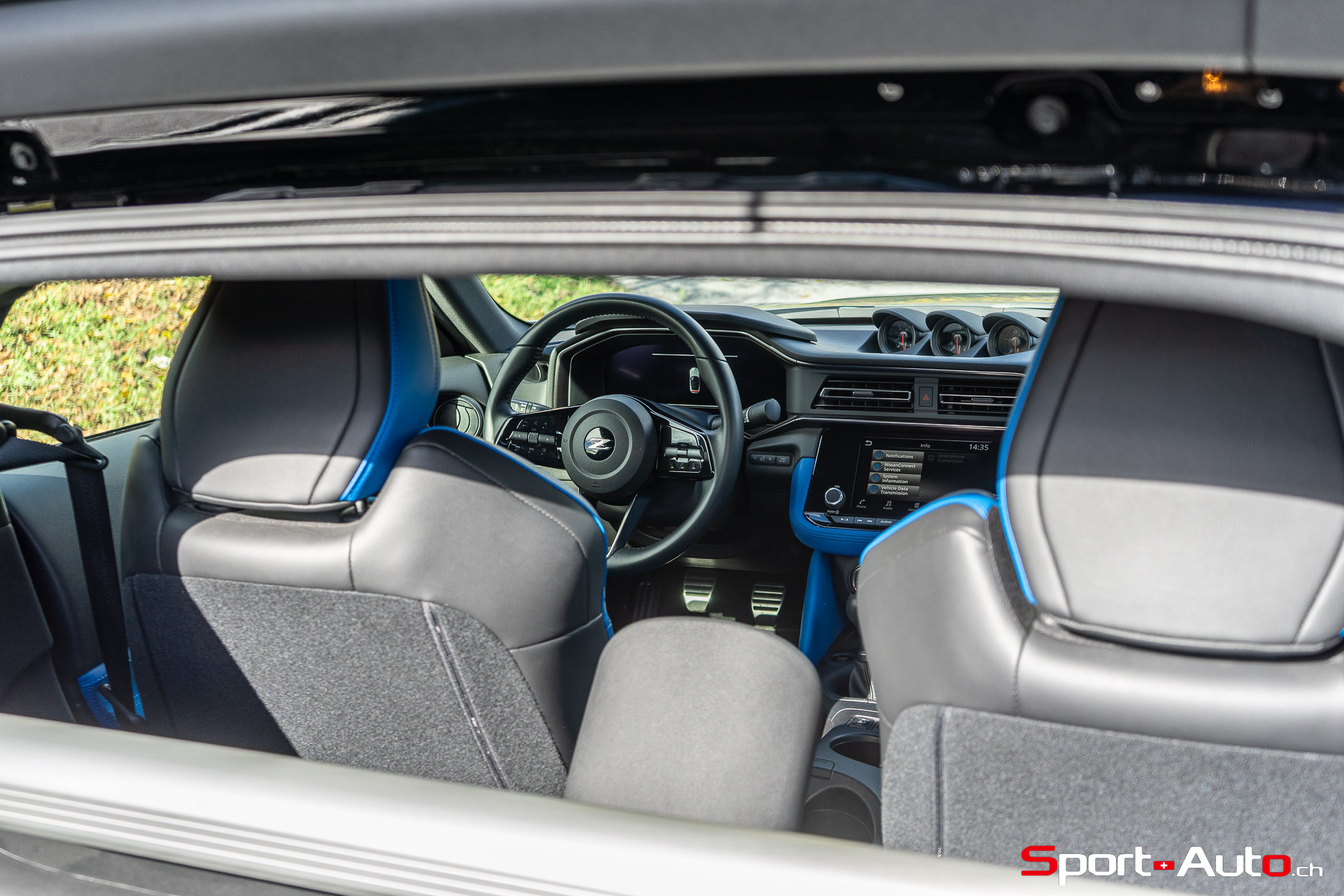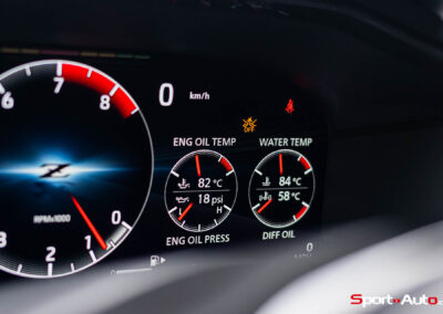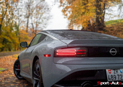 Notre modèle Z Performance se pare de jantes en aluminium forgé RAYS® de 19 pouces avec des pneus Bridgestone Potenza® S007. Sur cette version, les freins Nissan Performance (356mm avant, 351mm arrière) avec étriers rouges sont livrés de série, tout comme l’aileron arrière, à angle accentué. On retrouve également en équipement standard les systèmes d’assistance à la conduite usuels dans la production automobile actuelle : avertisseurs de sortie de voie, régulateur de vitesse et distance, ou encore détection de piétons. “Des technologies avancées qui offrent tout ce dont vous avez besoin et rien de ce dont vous n’avez pas besoin”, selon z-nissan.ch.