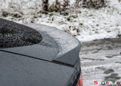 1ère vitesse : 1-2-3-4000 trs/min : vu le vacarme à l’intérieur, on pense que la montée dans les tours est finie mais non, il faut aller encore plus haut ! 5-6-7000 trs/min : le son devient vivifiant et grisant, mais il est temps de déplacer sa main droite pour changer de rapport. En 2ème vitesse, rebelotte. Le moteur a une grande allonge, et les 405 ch répondent bien tous présents. Il n’y a pas d’effet de turbo “on/off” et les accélérations sont linéaires comme avec un moteur atmosphérique. Chaque augmentation de trs/min est perceptible à l’oreille. Un vrai régal !