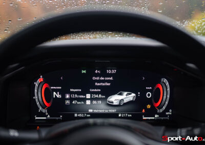 Côté consommation, la Nissan z est annoncée pour 10.8 l /100km, et nous avons mesuré plus de 12 l / 100 km sur notre essai, effectué en grande majorité en conditions humides. La voiture n’offre pas différents modes de conduite sélectionnables, ce sera votre pied droit qui contrôlera directement vos consommations.